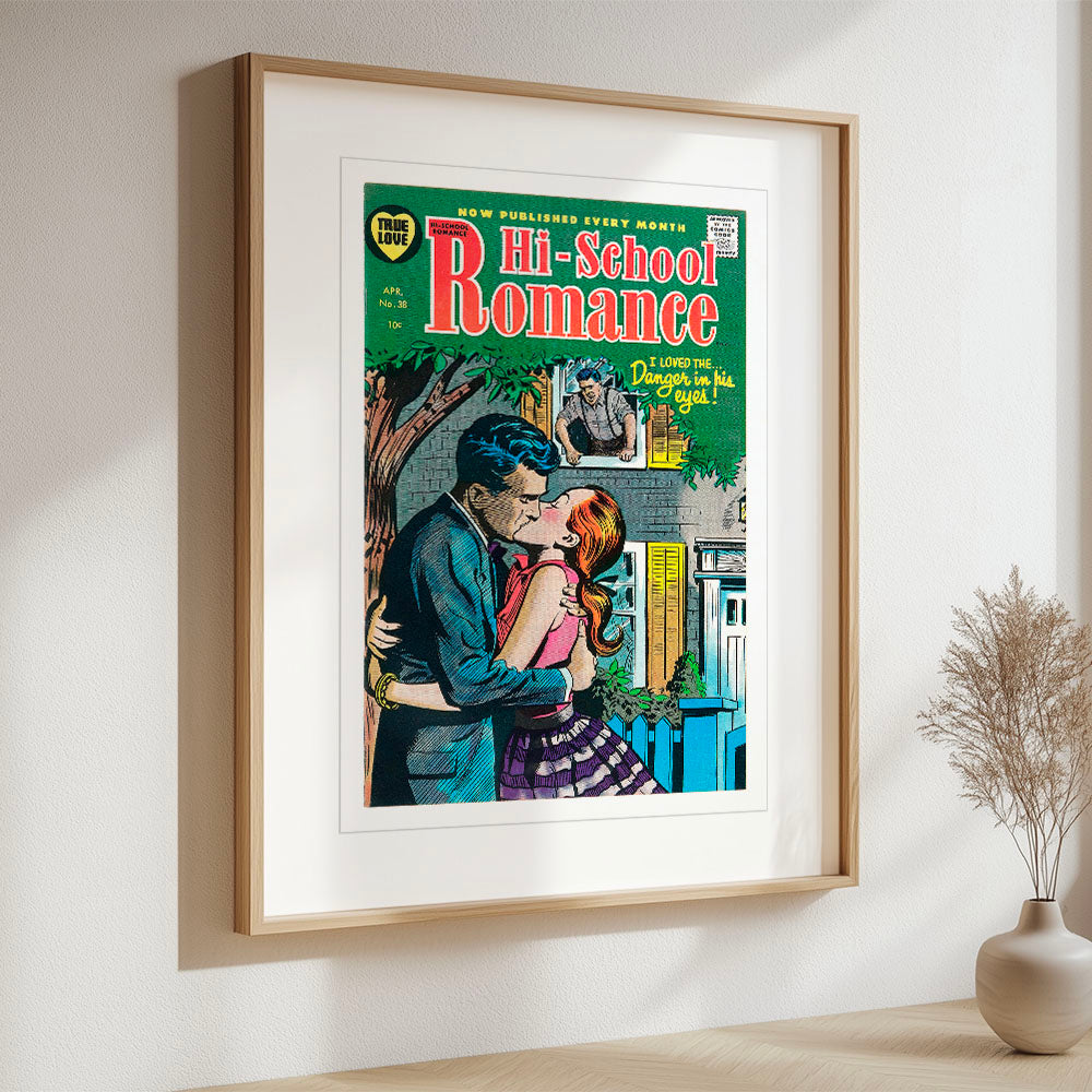 The tagline, “I loved the danger in his eyes,” reflects post-war America’s cultural shift toward exploring forbidden romance and emotional complexity in popular media. The protagonist’s plaid skirt and gold bracelet are emblematic of 1950s fashion trends, grounding the story in its time while underscoring the allure of suburban rebellion against societal norms.