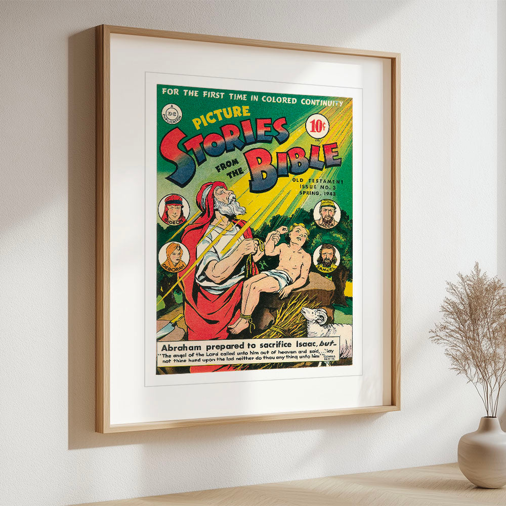 This Spring 1943 issue, published by DC Comics, presents a vivid adaptation of Old Testament narratives, blending religious reverence with the dynamic visual storytelling of the Golden Age. The cover depicts Abraham's dramatic preparation to sacrifice Isaac, capturing the tension with vibrant hues and radiating divine intervention through golden beams. Priced at 10 cents, this quarterly release underscored wartime America's engagement with faith through accessible media.