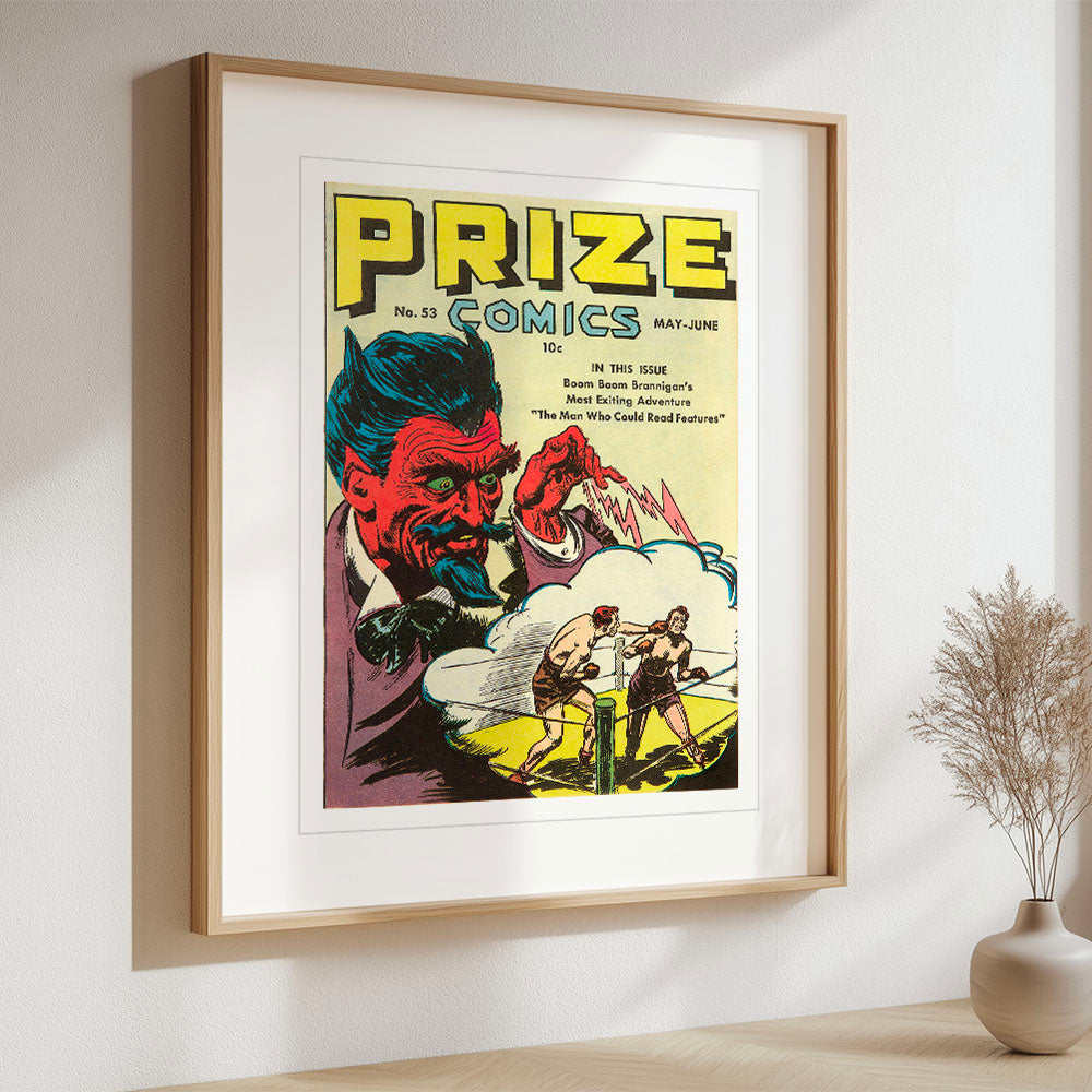 This striking cover encapsulates the surreal and dramatic visual language of mid-1940s comic art. Dominated by a devilish figure with exaggerated features and vivid red skin, the illustration employs bold color contrasts and dynamic composition to evoke menace and intrigue. The devil's claw-like hand directs lightning bolts toward two boxers, suggesting supernatural interference—a theme resonant with wartime anxieties and fascination with the occult. Boom Boom Brannigan, the featured protagonist, reflects the era's cultural embrace of rugged, action-oriented heroes.
