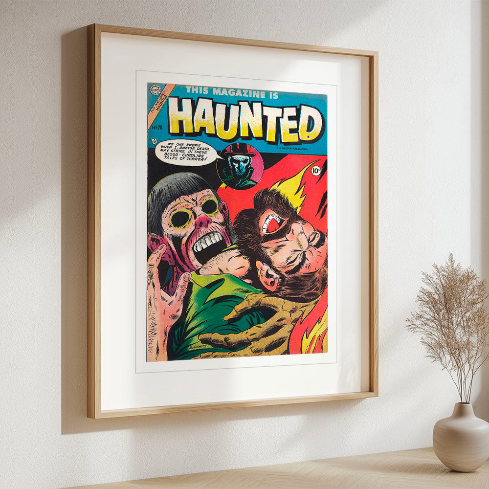 The cover of This Magazine is Haunted #20 encapsulates the grim aesthetic of mid-century horror comics, with its lurid depiction of a skeletal figure sinking its teeth into a screaming victim. Illustrated by Seymour Moskowitz, the exaggerated anatomy and vivid color palette heighten the grotesque drama, reflecting the era's fascination with pulp horror and the macabre. Doctor Death, the series' spectral narrator, looms in a chilling inset portrait, reinforcing his role as an arbiter of doom.