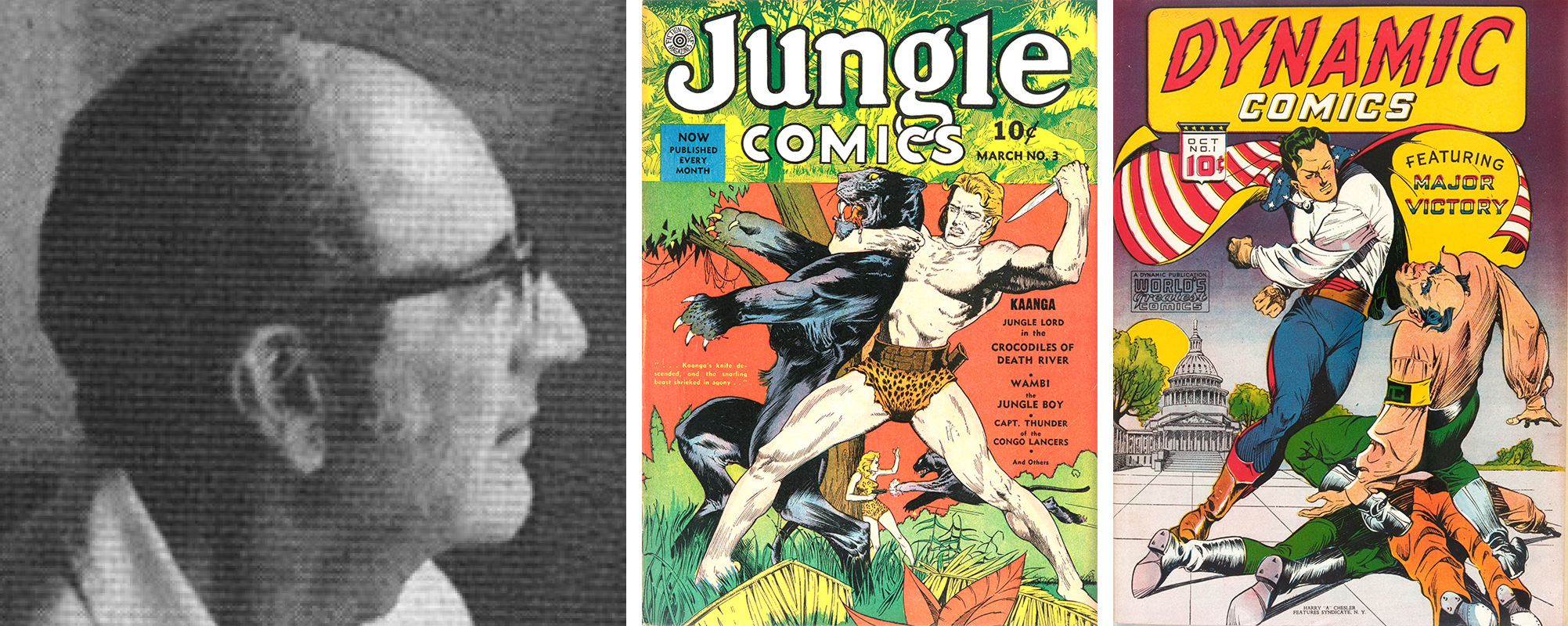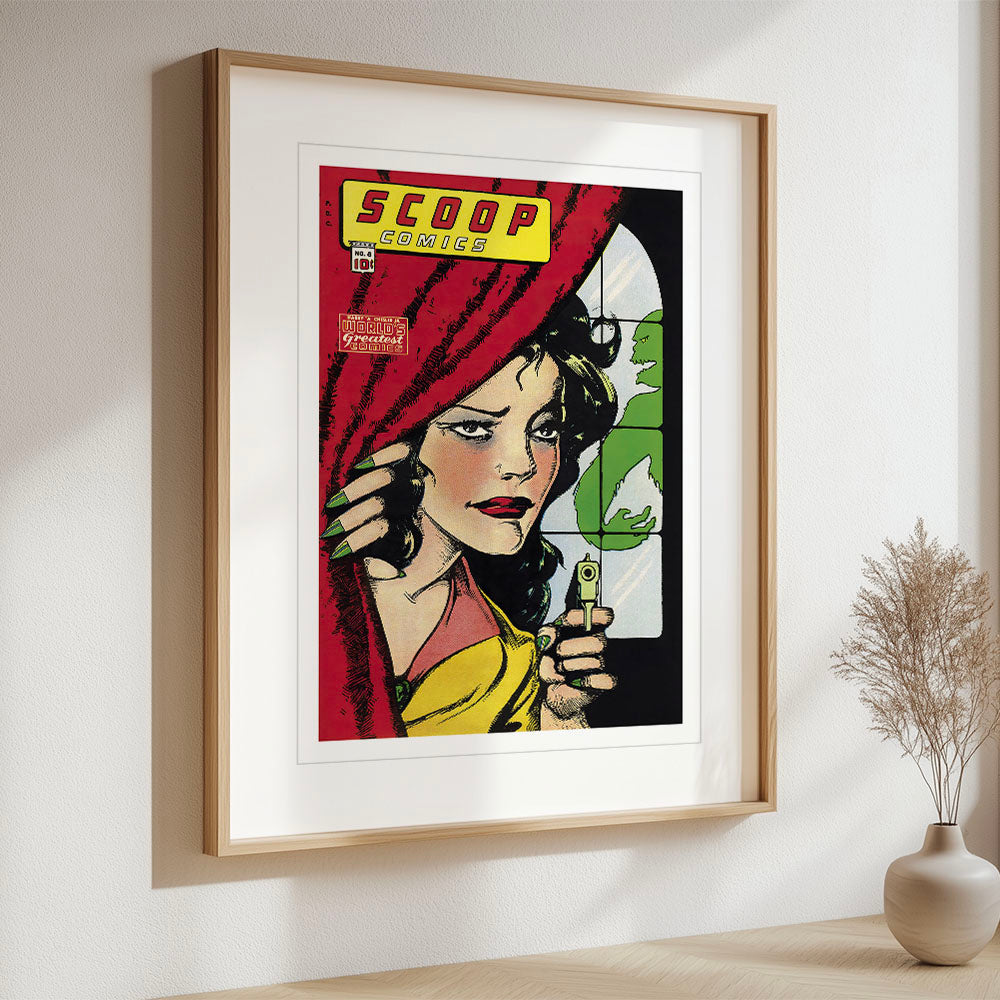 This July 1944 issue of Scoop Comics, published by Chesler Dynamic, features a striking cover by Charles Sultan, whose bold use of contrasting colors and dramatic framing captures the suspenseful tone of Golden Age comics. The cover’s composition, with a mysterious figure holding a pistol and peering through a parted curtain, reflects wartime intrigue and the era’s fascination with espionage narratives.