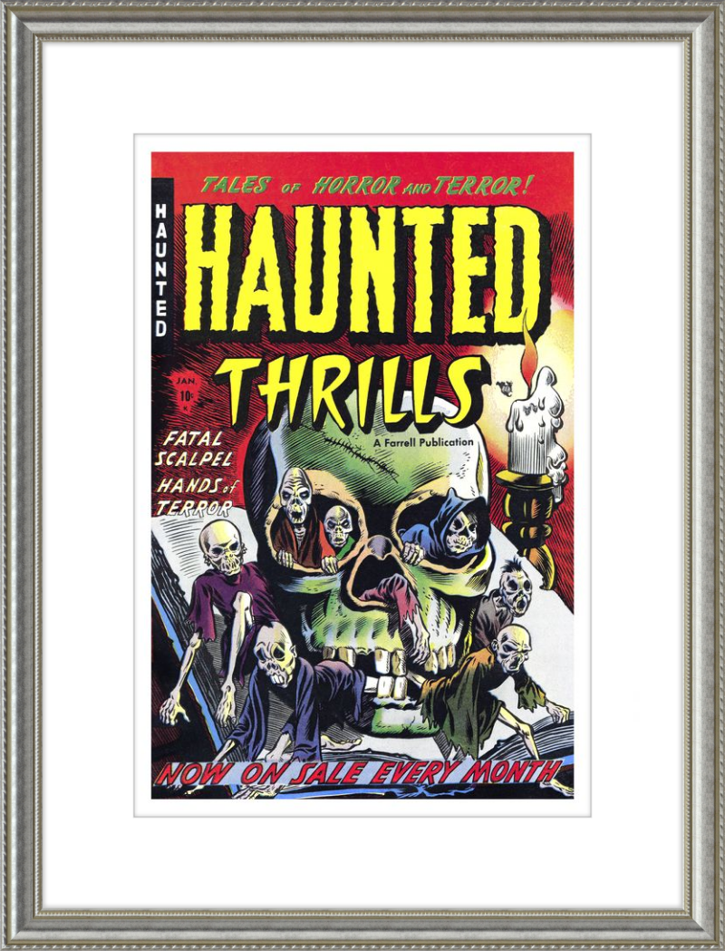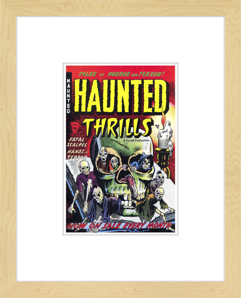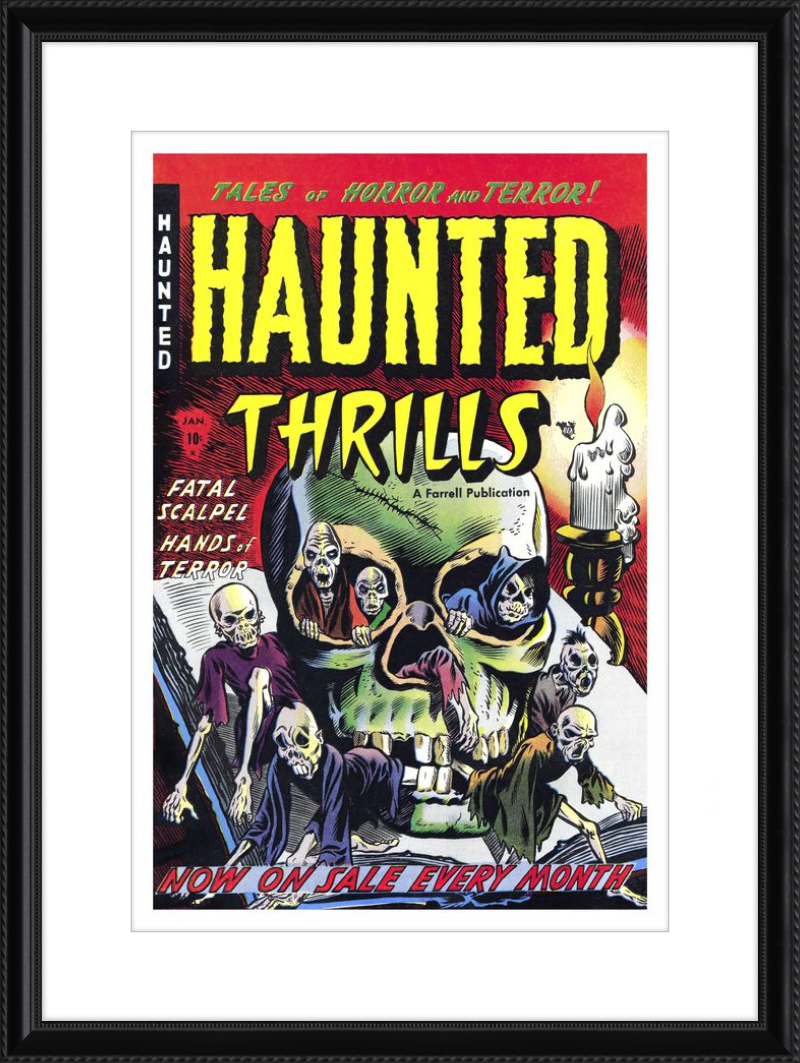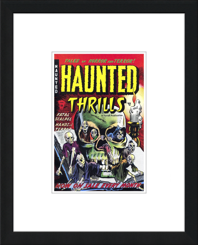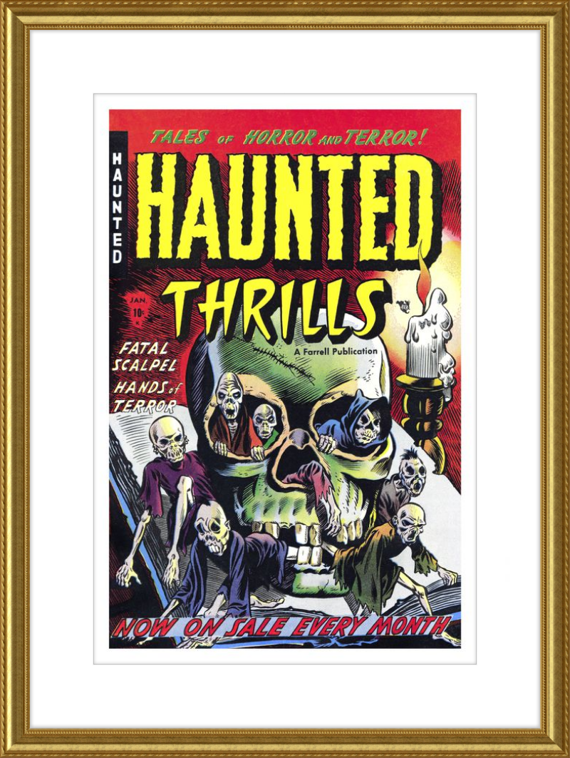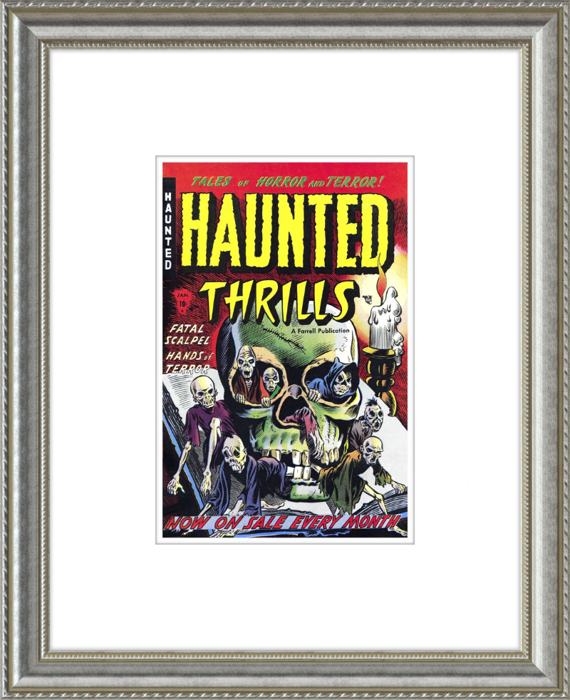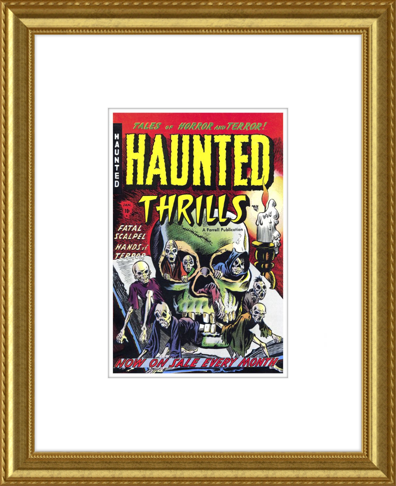 This striking January 1953 cover from Farrell Publications epitomizes the macabre allure of pre-Code horror comics. Illustrated with eerie precision, it features a ghastly tableau of skeletons clawing their way out of a monstrous green skull, illuminated by a flickering candle—a chilling symbol of mortality. The bold, jagged typography of "Haunted Thrills" against the blood-red backdrop amplifies the sense of dread, reflecting the era's fascination with grotesque imagery and supernatural terror.