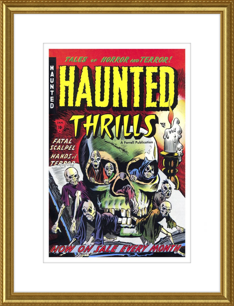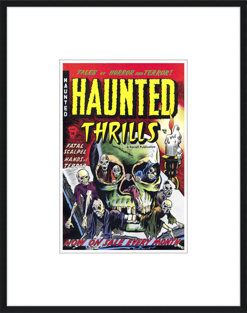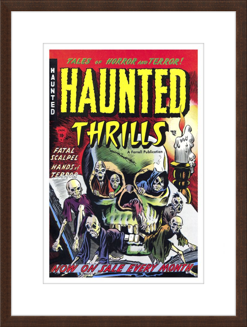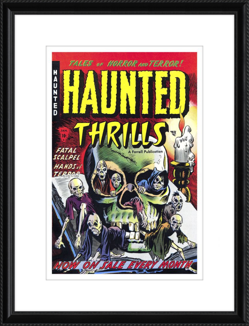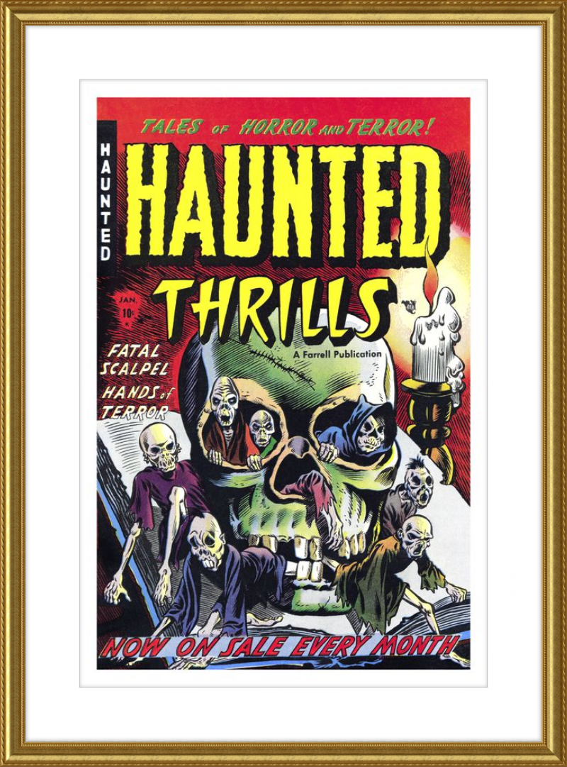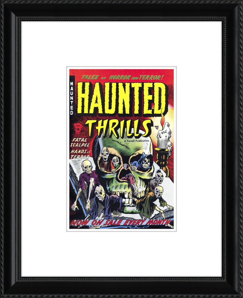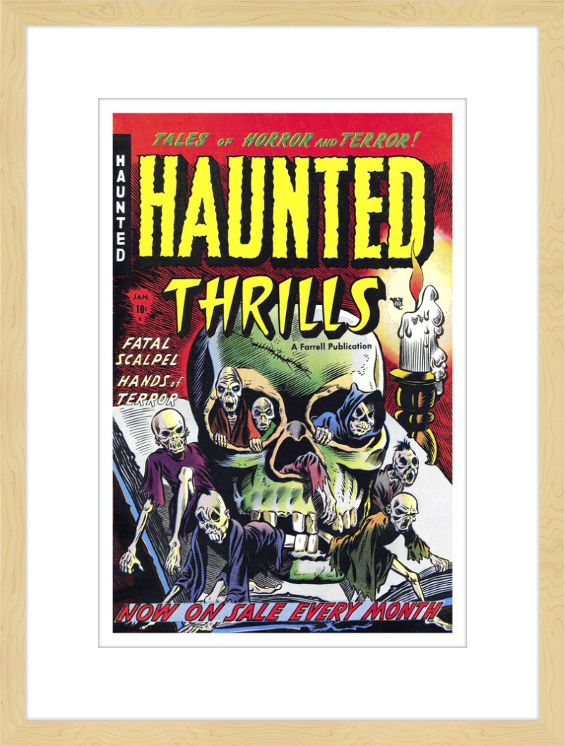 This striking January 1953 cover from Farrell Publications epitomizes the macabre allure of pre-Code horror comics. Illustrated with eerie precision, it features a ghastly tableau of skeletons clawing their way out of a monstrous green skull, illuminated by a flickering candle—a chilling symbol of mortality. The bold, jagged typography of "Haunted Thrills" against the blood-red backdrop amplifies the sense of dread, reflecting the era's fascination with grotesque imagery and supernatural terror.