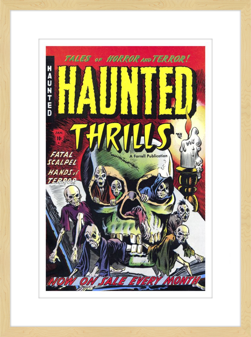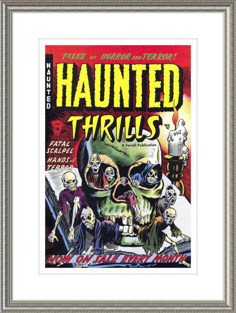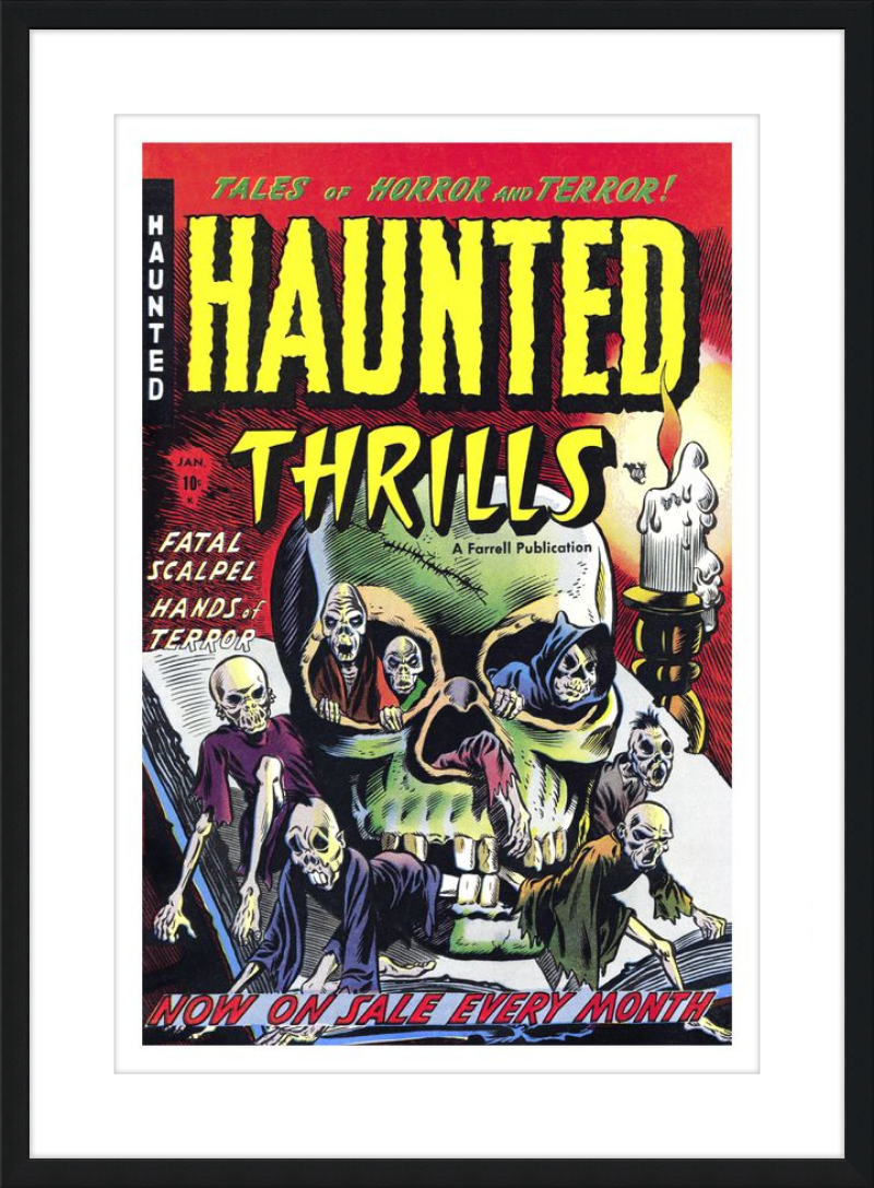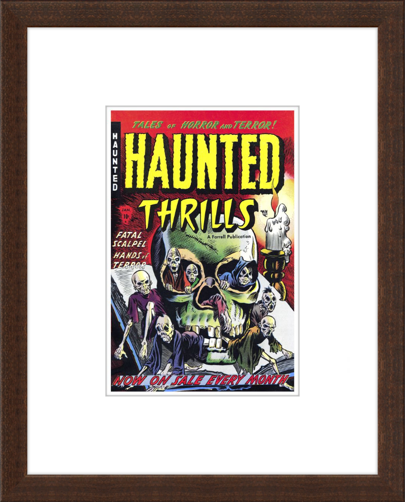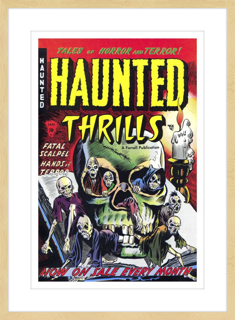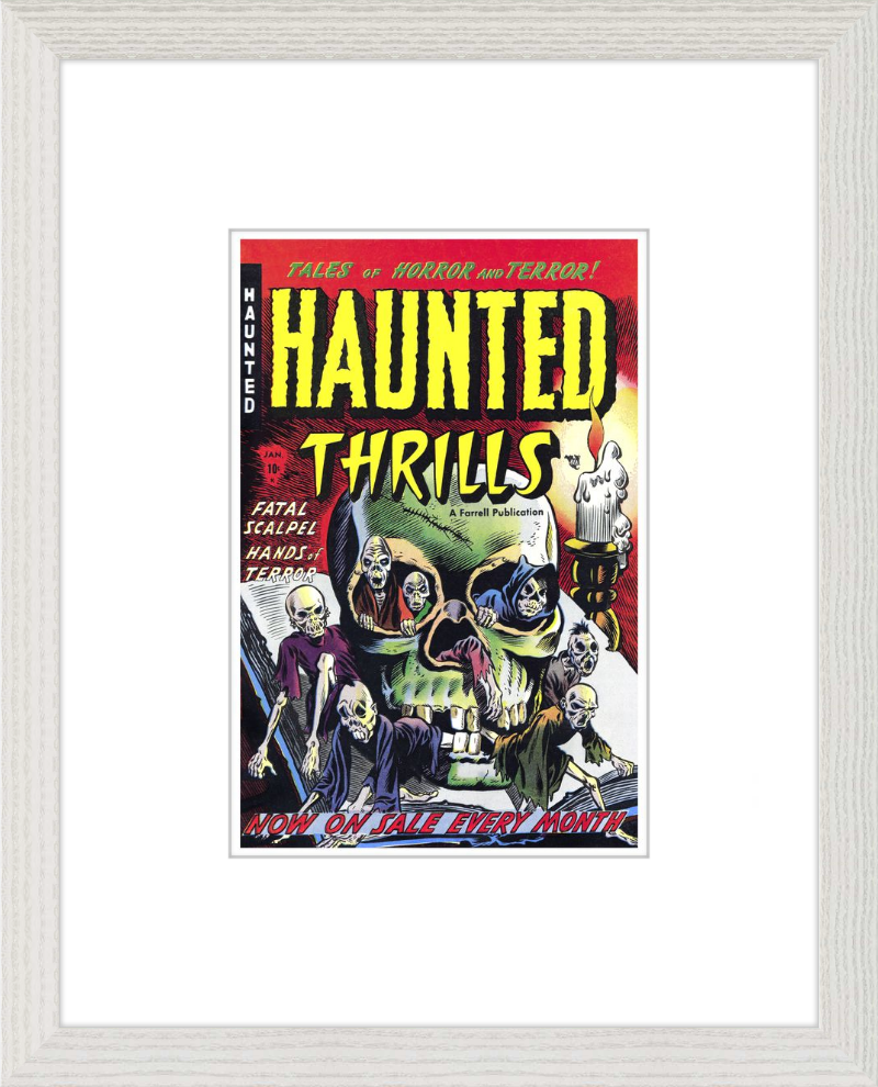 This striking January 1953 cover from Farrell Publications epitomizes the macabre allure of pre-Code horror comics. Illustrated with eerie precision, it features a ghastly tableau of skeletons clawing their way out of a monstrous green skull, illuminated by a flickering candle—a chilling symbol of mortality. The bold, jagged typography of "Haunted Thrills" against the blood-red backdrop amplifies the sense of dread, reflecting the era's fascination with grotesque imagery and supernatural terror.
