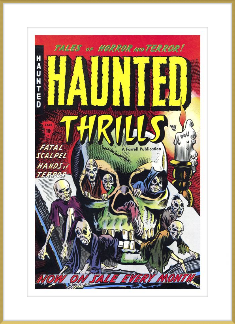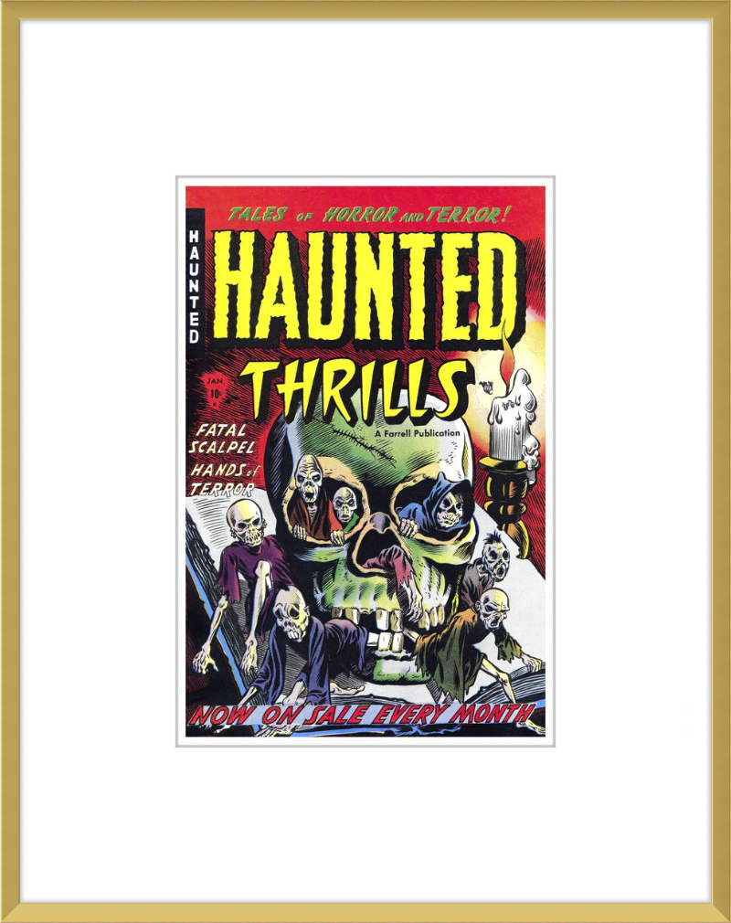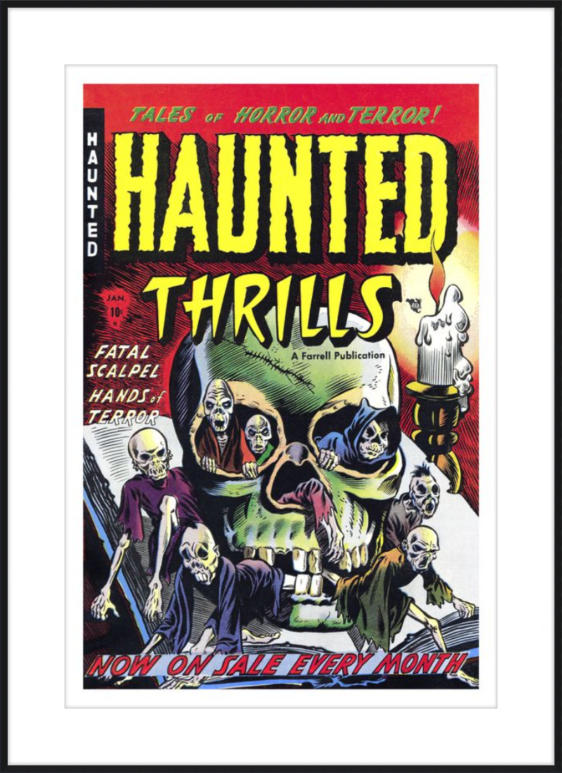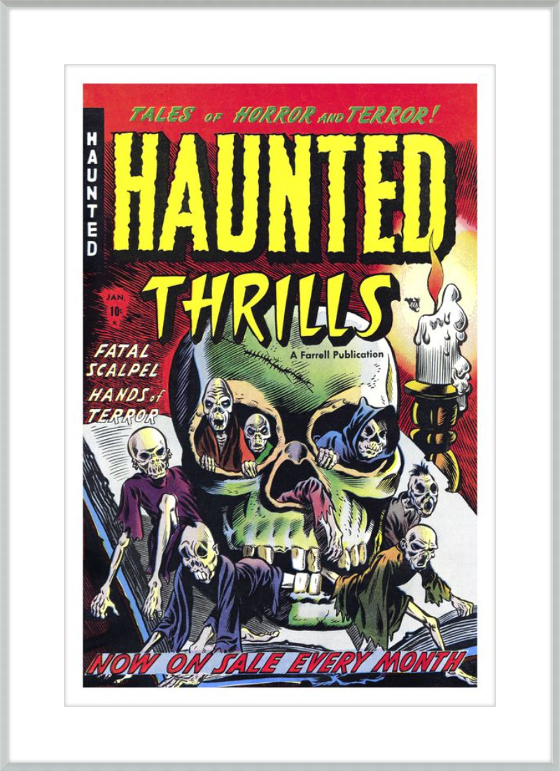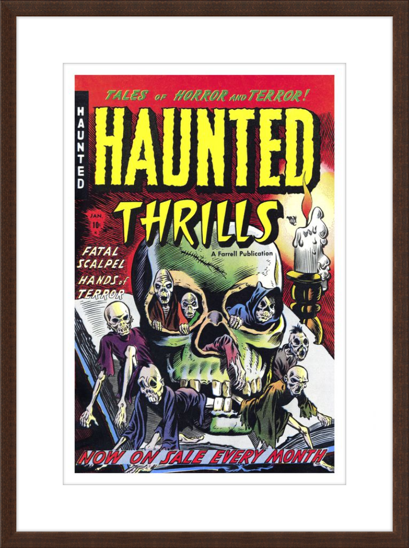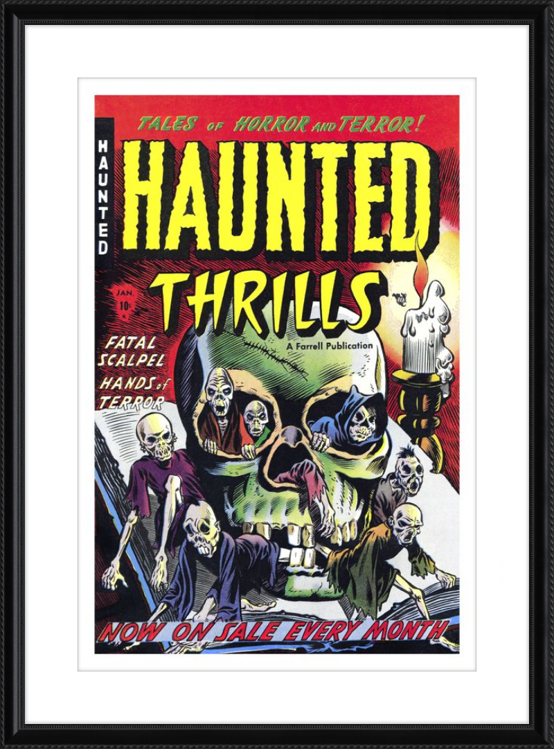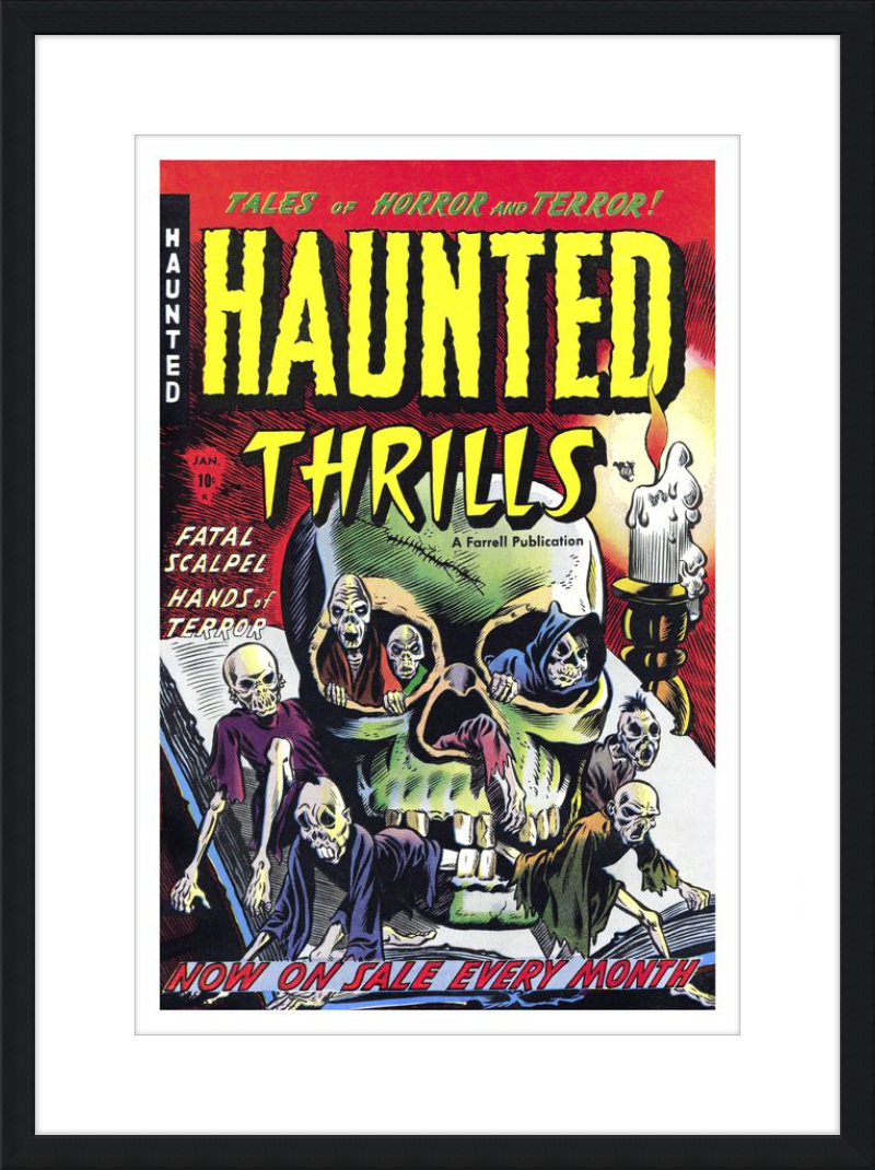 This striking January 1953 cover from Farrell Publications epitomizes the macabre allure of pre-Code horror comics. Illustrated with eerie precision, it features a ghastly tableau of skeletons clawing their way out of a monstrous green skull, illuminated by a flickering candle—a chilling symbol of mortality. The bold, jagged typography of "Haunted Thrills" against the blood-red backdrop amplifies the sense of dread, reflecting the era's fascination with grotesque imagery and supernatural terror.