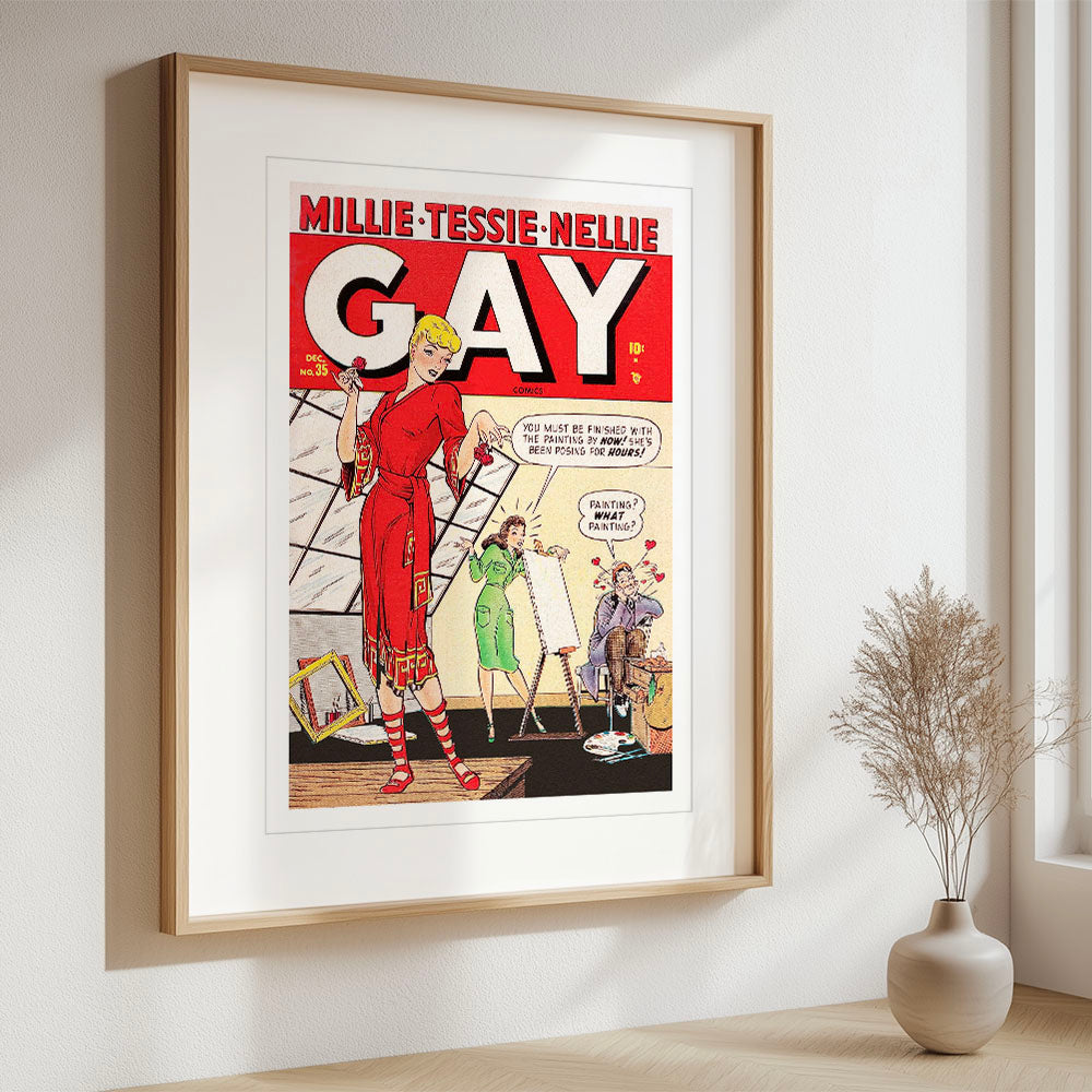 The December 1948 issue of Gay Comics showcases the lively interplay of Millie, Tessie, and Nellie, iconic protagonists from Timely Comics' humor lineup. The cover art features Millie the Model in a striking red dress adorned with geometric patterns, embodying post-war fashion's bold embrace of glamour and modernity. The composition humorously captures a chaotic studio scene, reflecting the era's fascination with artistic bohemia and romantic entanglements.