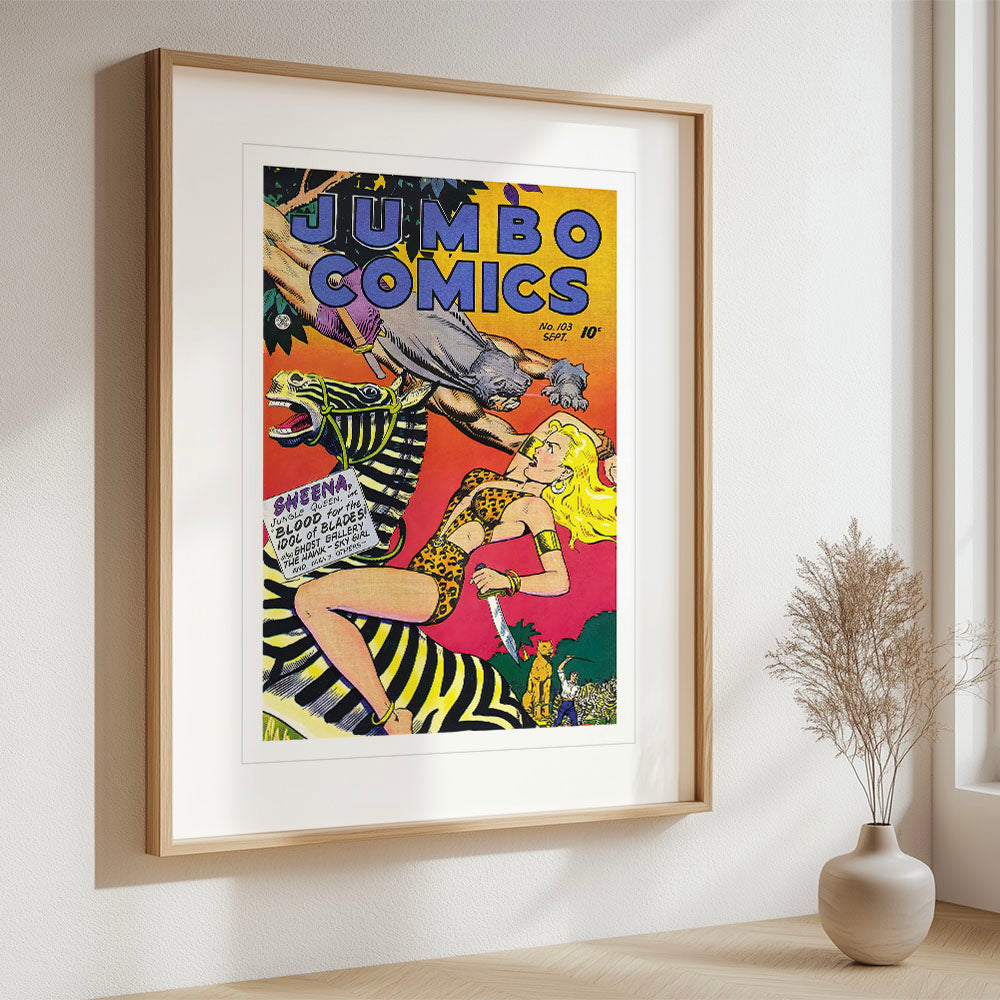 This September 1947 issue of Jumbo Comics showcases Sheena, Queen of the Jungle, in a dynamic tableau that epitomizes Golden Age comic artistry. The cover, rendered with vivid primary colors and bold linework, captures Sheena astride a zebra, knife in hand, as she confronts a menacing gorilla mid-leap. Her leopard-print attire and commanding posture underscore her status as a trailblazing female protagonist in adventure comics, embodying postwar fascination with exotic locales and powerful heroines.