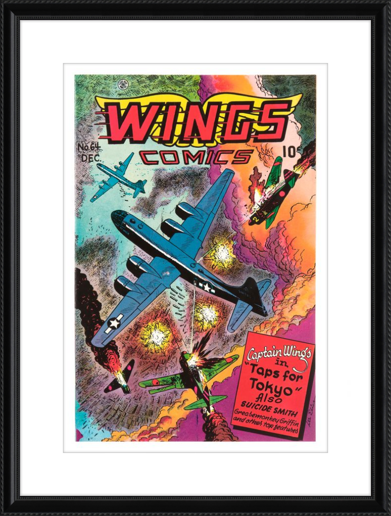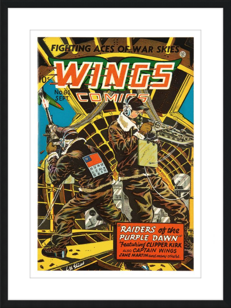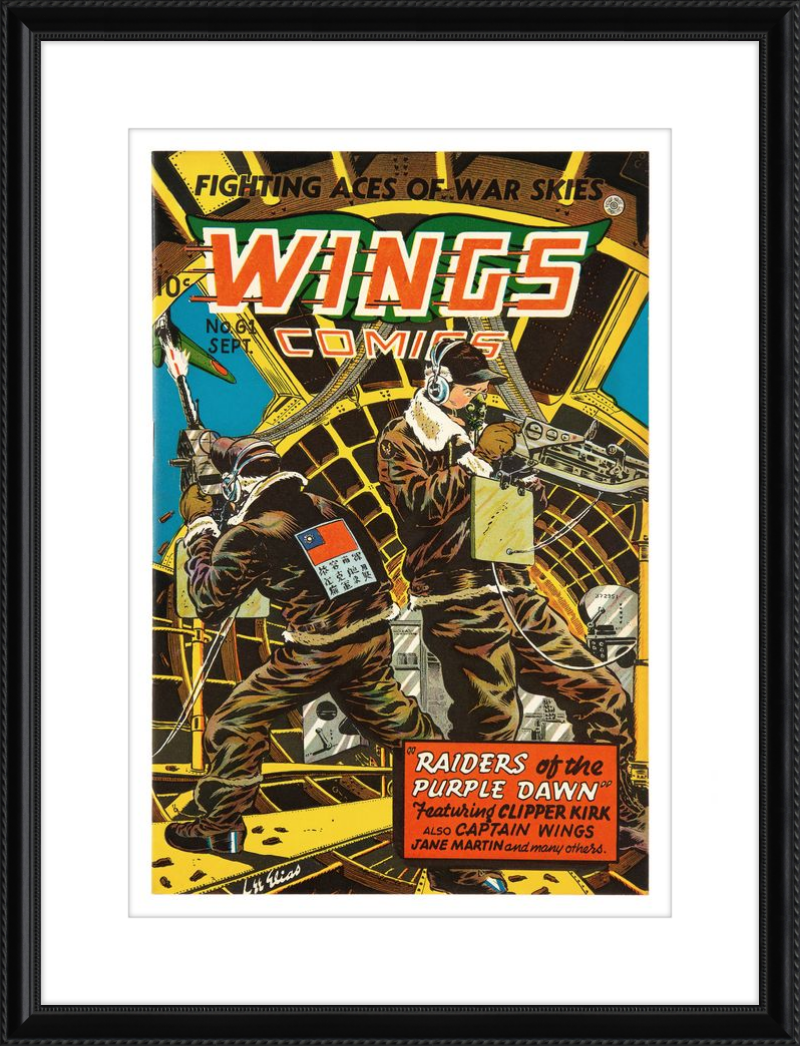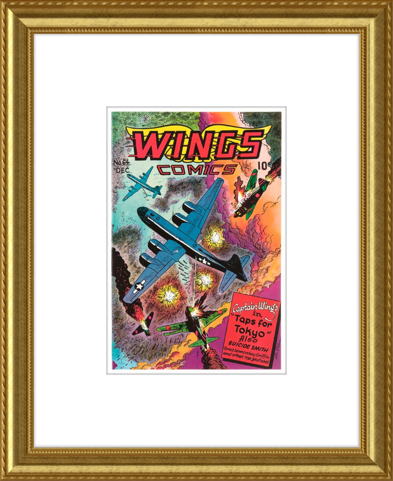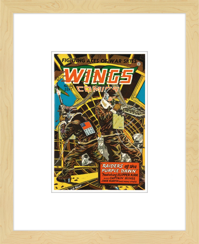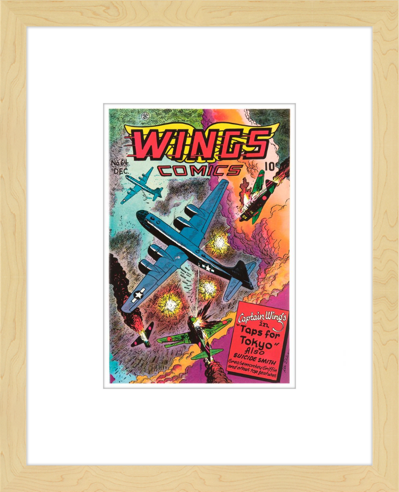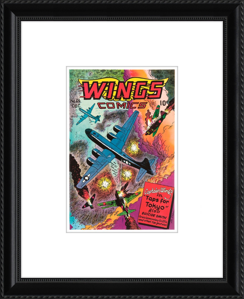 The bold colors and dramatic composition reflect the era's fascination with aviation warfare, a theme central to Fiction House’s wartime publications. Captain Wings, the heroic aviator, embodies the patriotic spirit of mid-20th-century America, resonating with readers during a time of global conflict. The cover’s meticulous detail and action-packed imagery underscore the Golden Age comic tradition of blending entertainment with wartime propaganda.