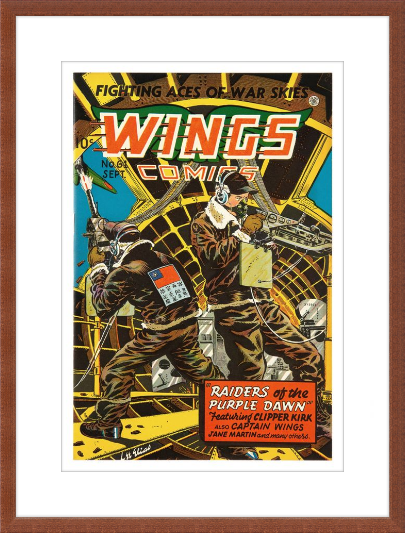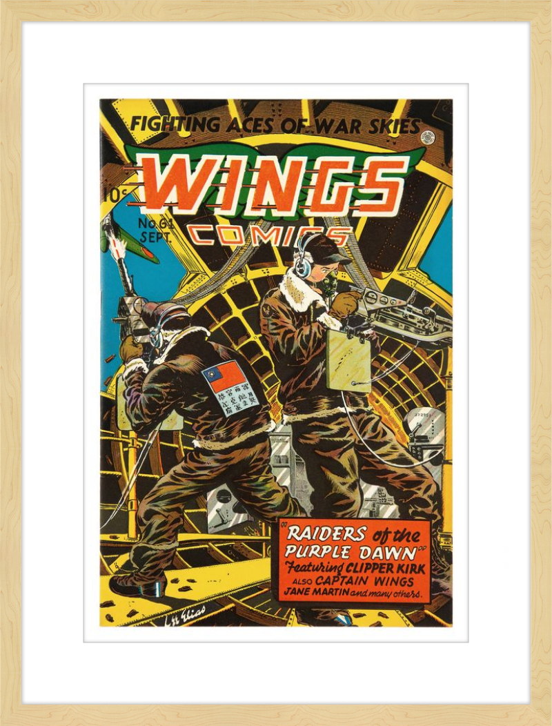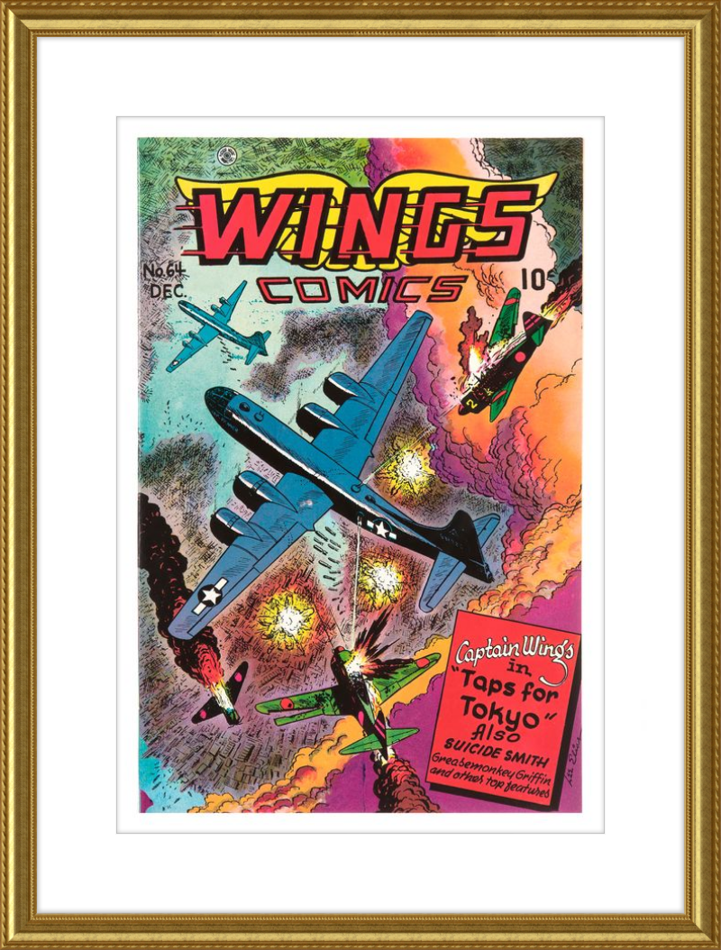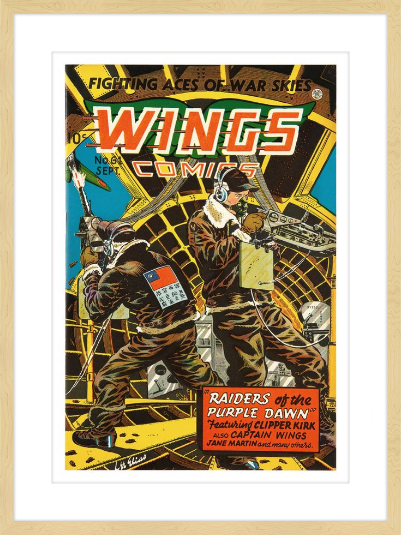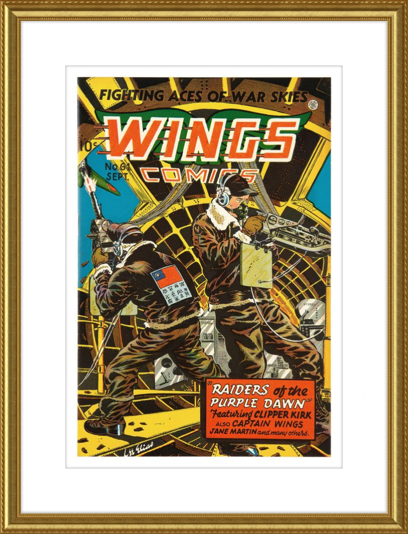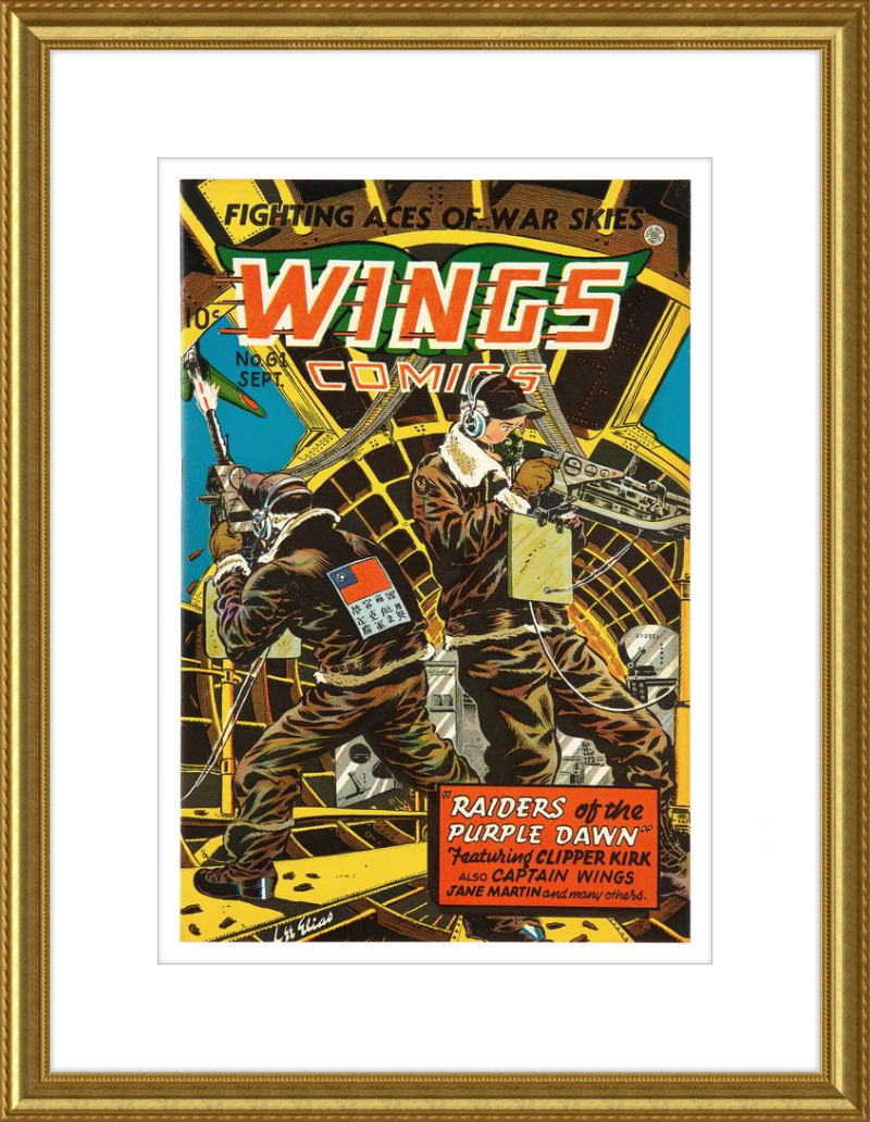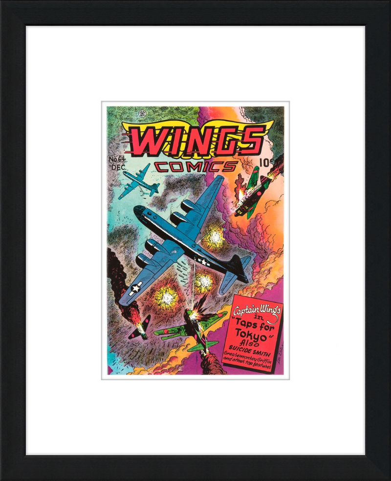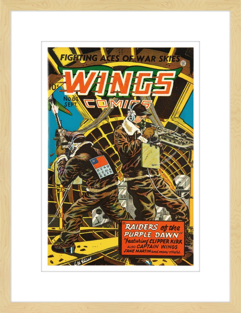 The bold colors and dramatic composition reflect the era's fascination with aviation warfare, a theme central to Fiction House’s wartime publications. Captain Wings, the heroic aviator, embodies the patriotic spirit of mid-20th-century America, resonating with readers during a time of global conflict. The cover’s meticulous detail and action-packed imagery underscore the Golden Age comic tradition of blending entertainment with wartime propaganda.