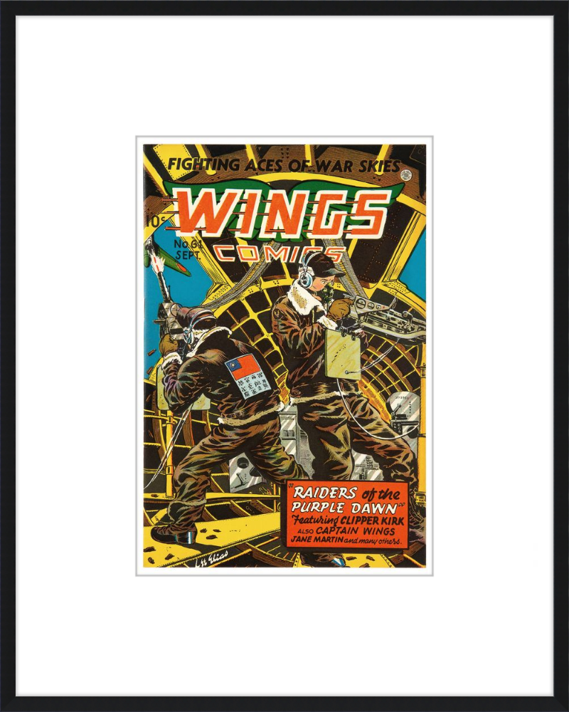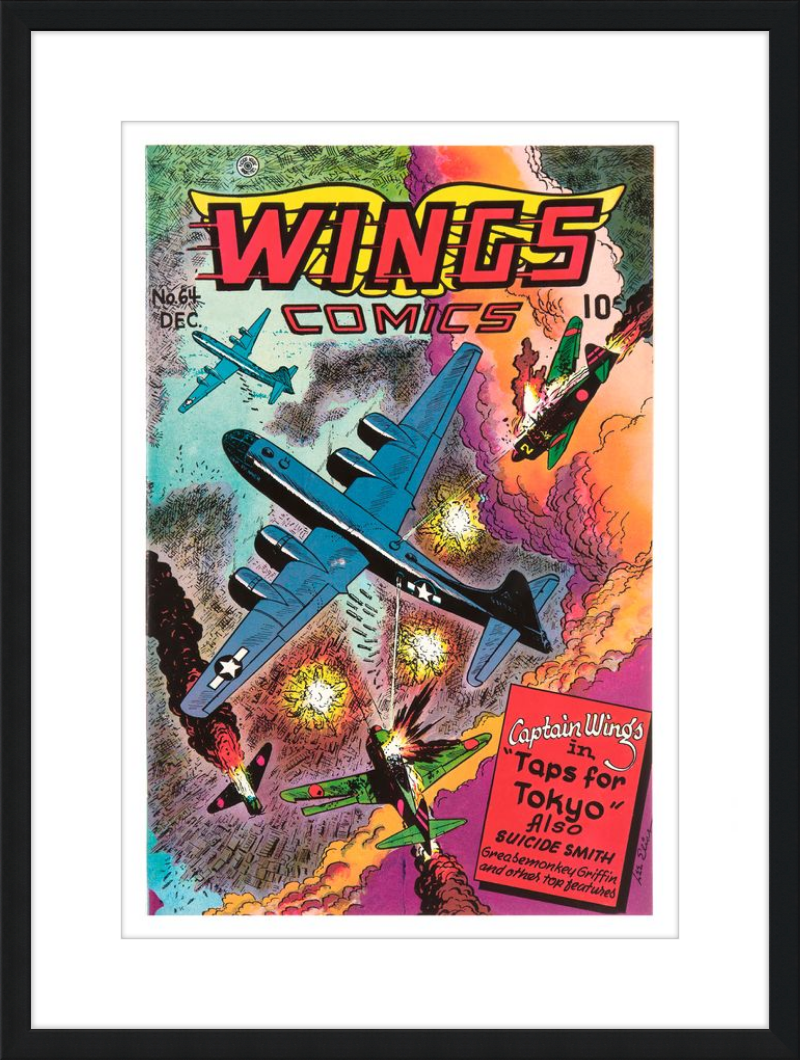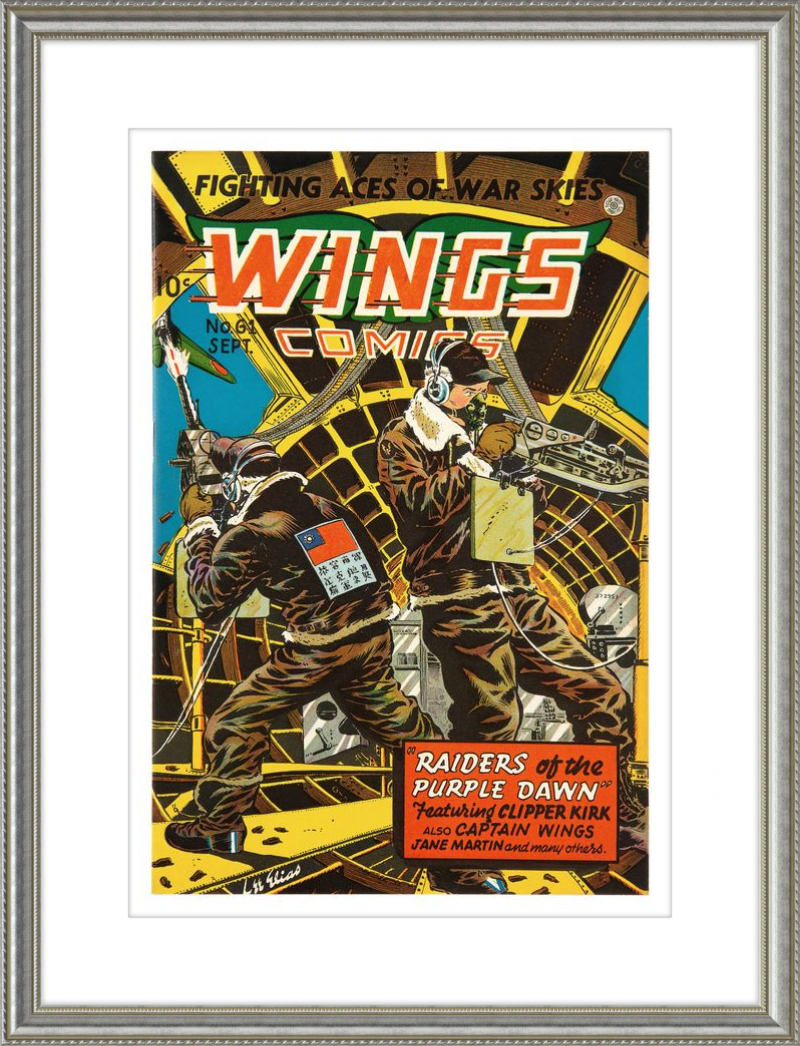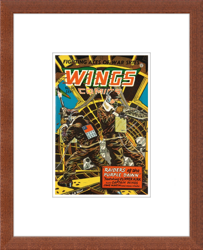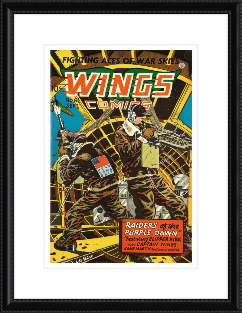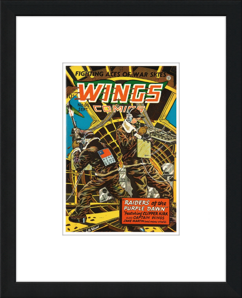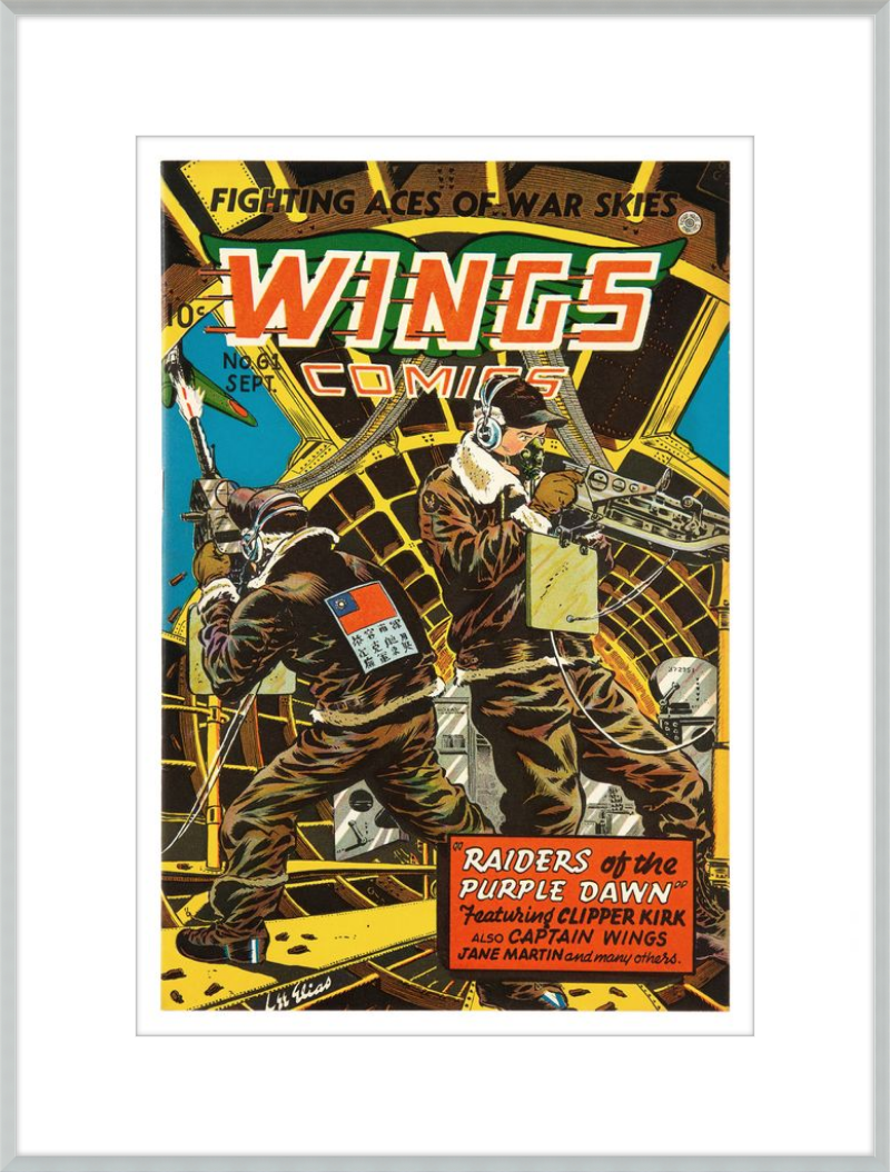 The bold colors and dramatic composition reflect the era's fascination with aviation warfare, a theme central to Fiction House’s wartime publications. Captain Wings, the heroic aviator, embodies the patriotic spirit of mid-20th-century America, resonating with readers during a time of global conflict. The cover’s meticulous detail and action-packed imagery underscore the Golden Age comic tradition of blending entertainment with wartime propaganda.