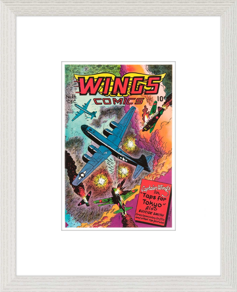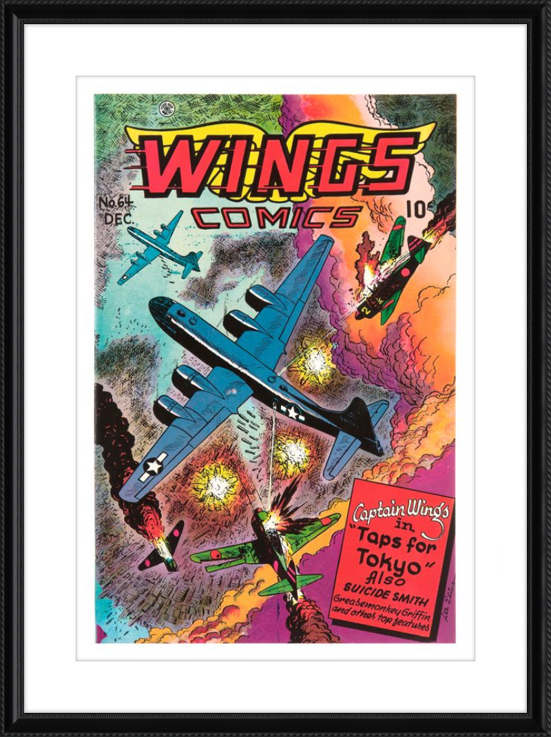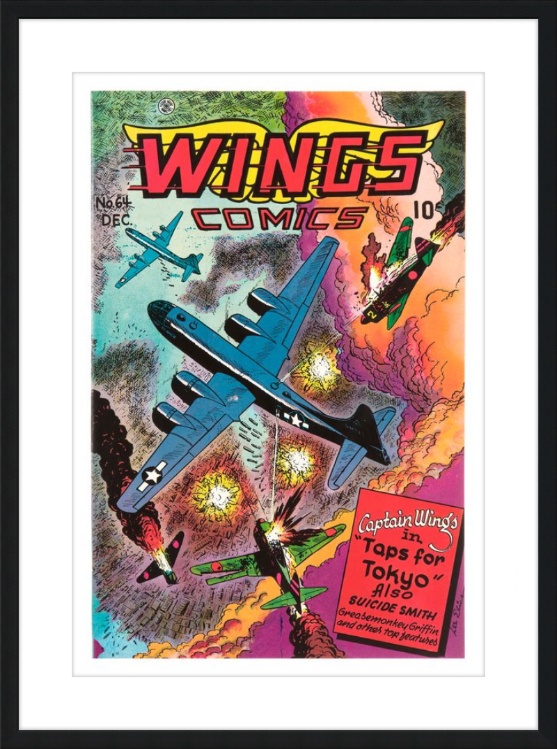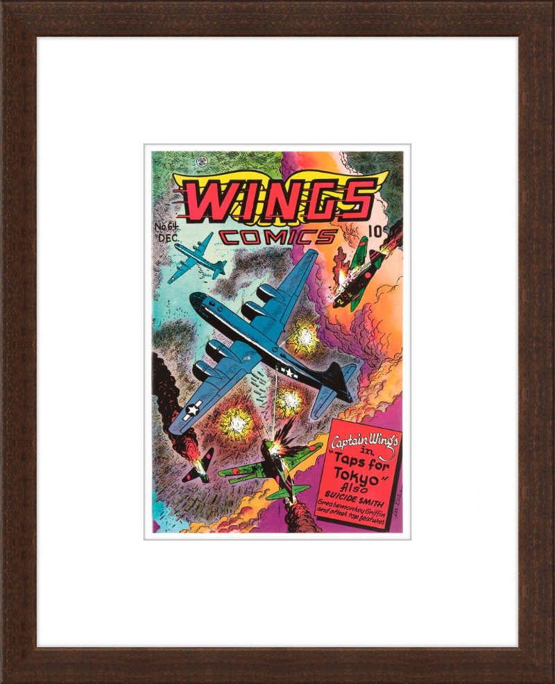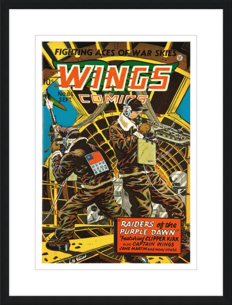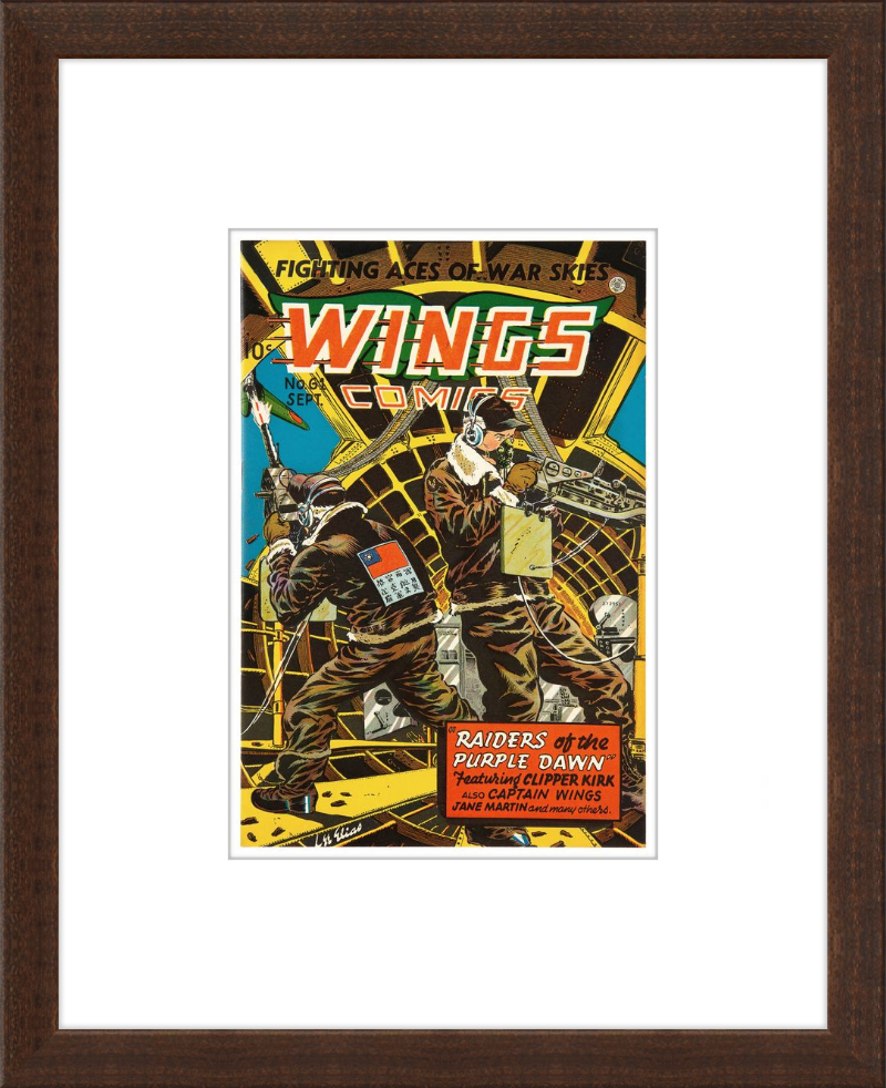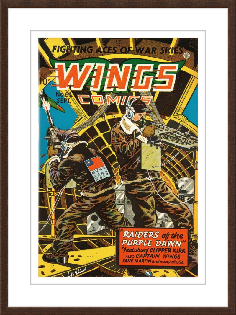 The bold colors and dramatic composition reflect the era's fascination with aviation warfare, a theme central to Fiction House’s wartime publications. Captain Wings, the heroic aviator, embodies the patriotic spirit of mid-20th-century America, resonating with readers during a time of global conflict. The cover’s meticulous detail and action-packed imagery underscore the Golden Age comic tradition of blending entertainment with wartime propaganda.
