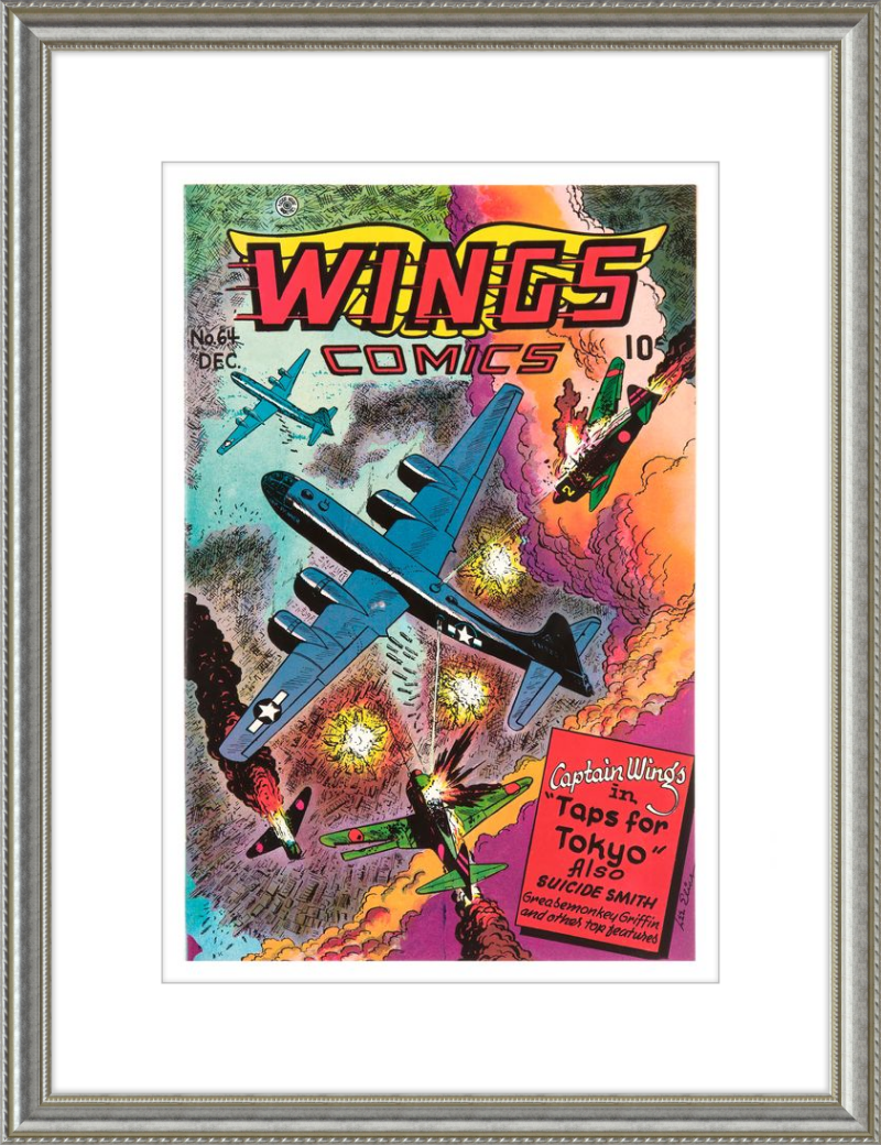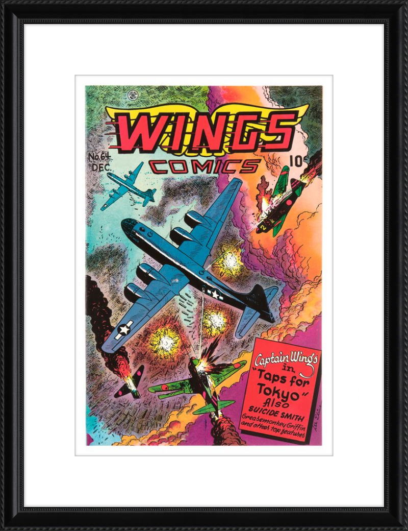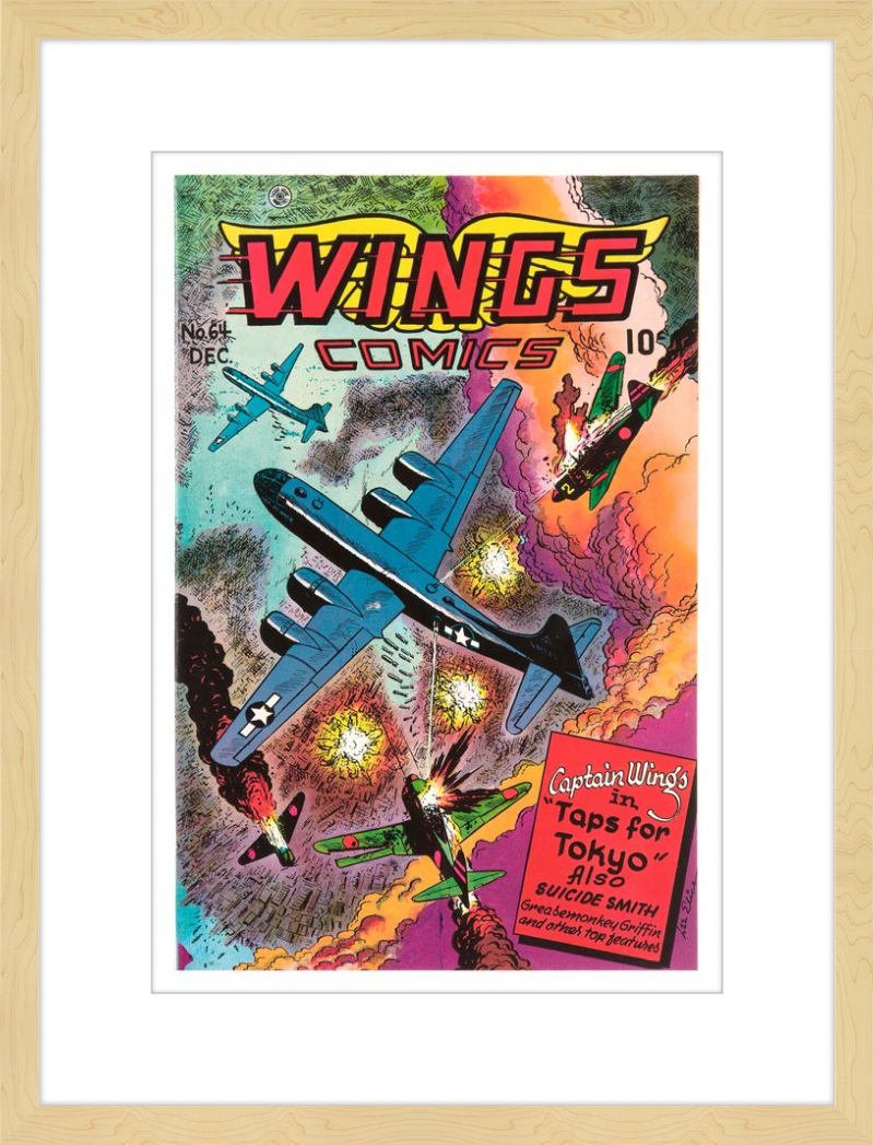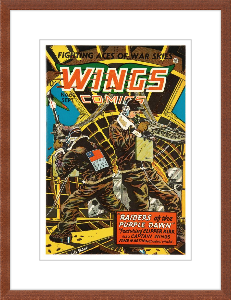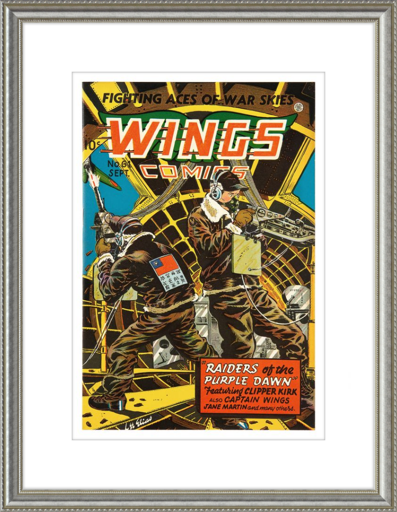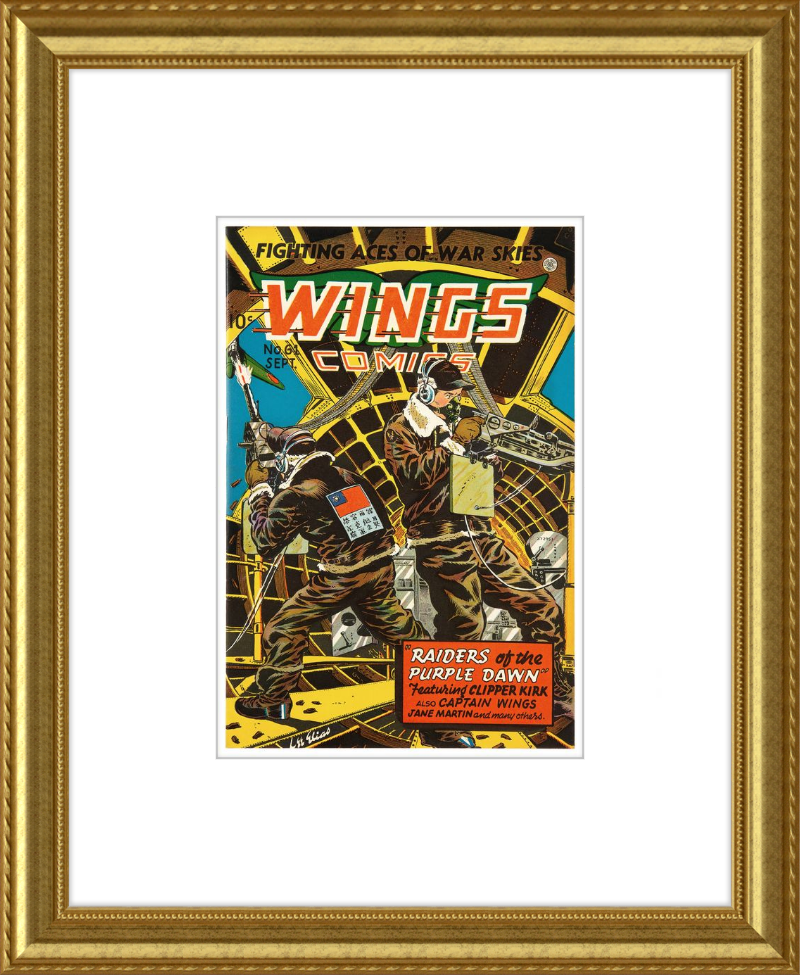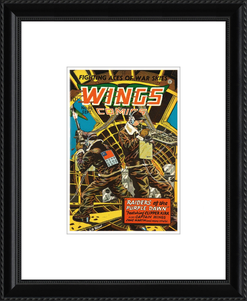 The bold colors and dramatic composition reflect the era's fascination with aviation warfare, a theme central to Fiction House’s wartime publications. Captain Wings, the heroic aviator, embodies the patriotic spirit of mid-20th-century America, resonating with readers during a time of global conflict. The cover’s meticulous detail and action-packed imagery underscore the Golden Age comic tradition of blending entertainment with wartime propaganda.