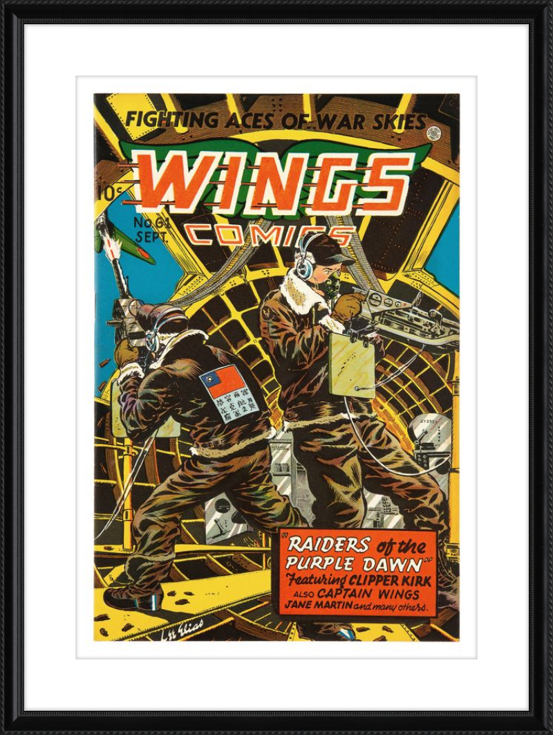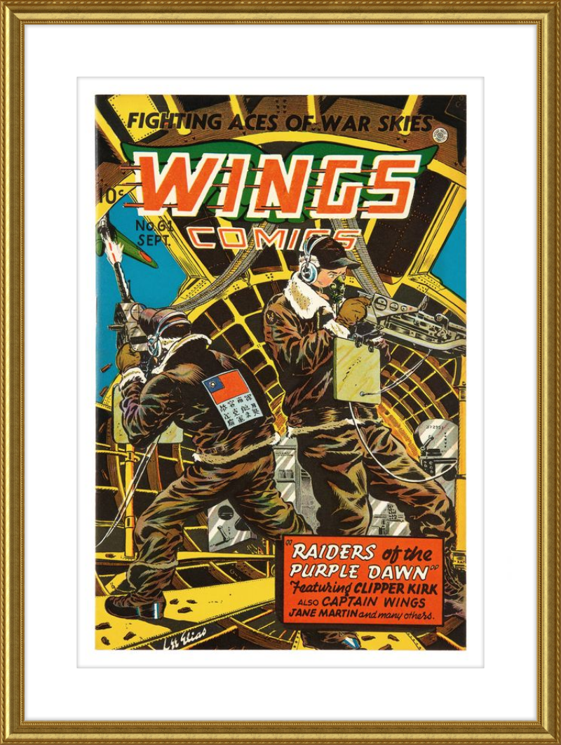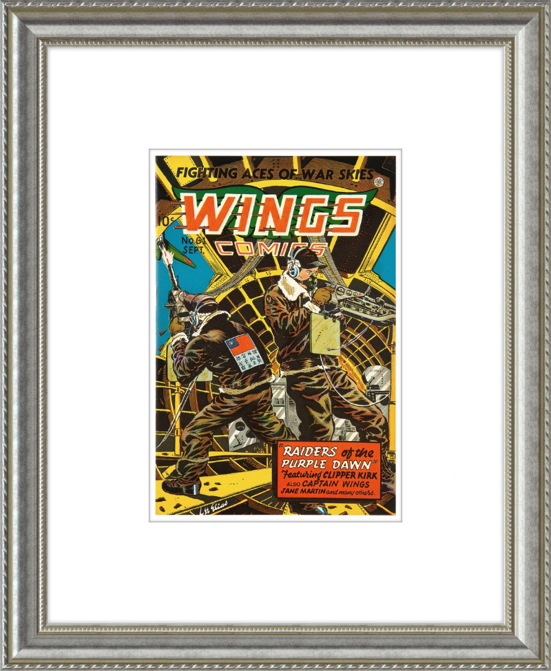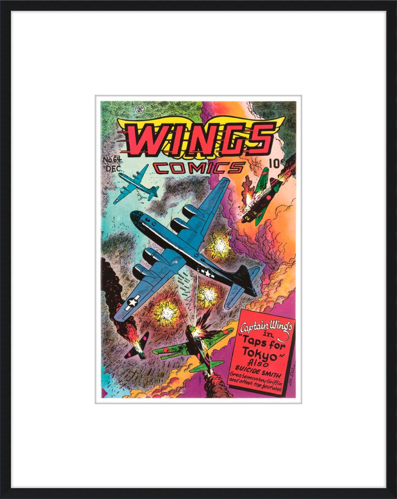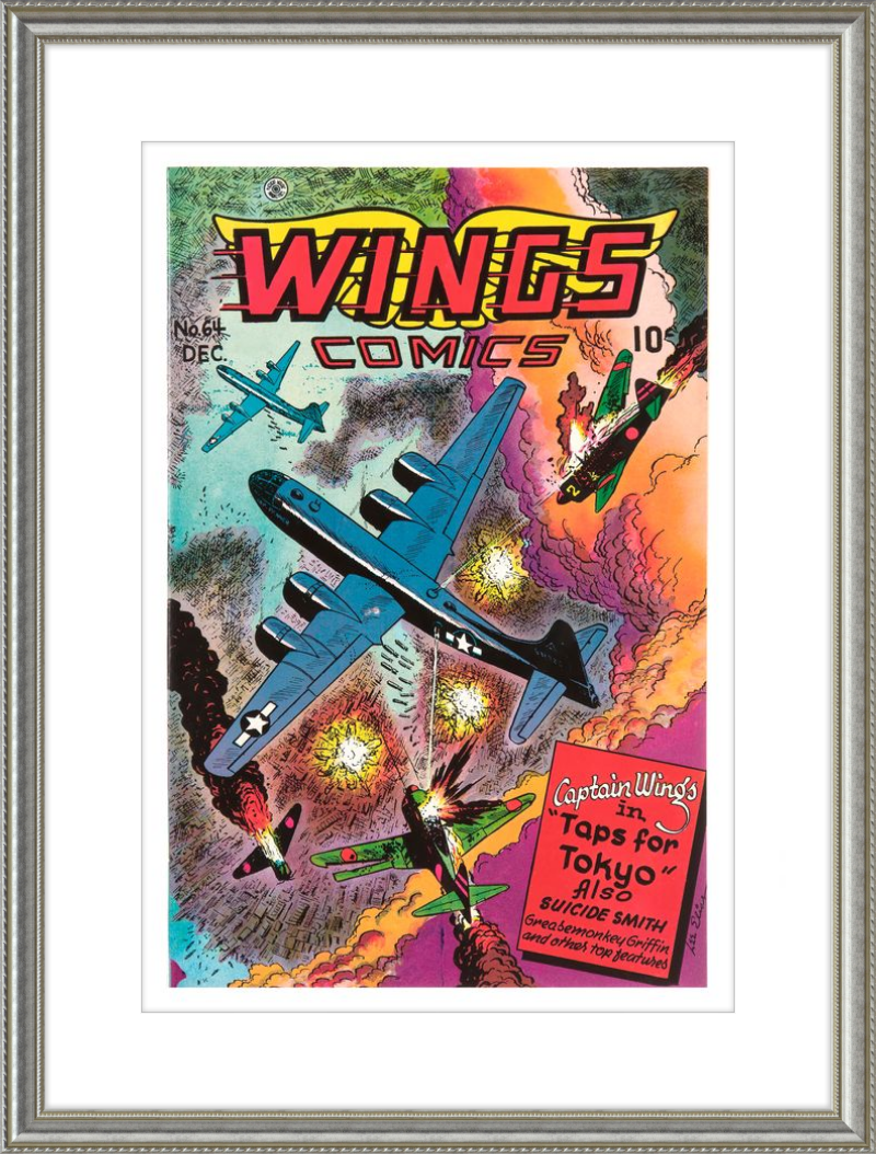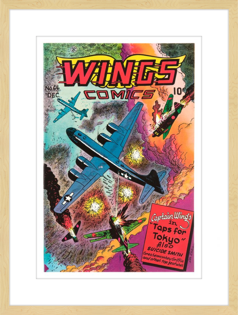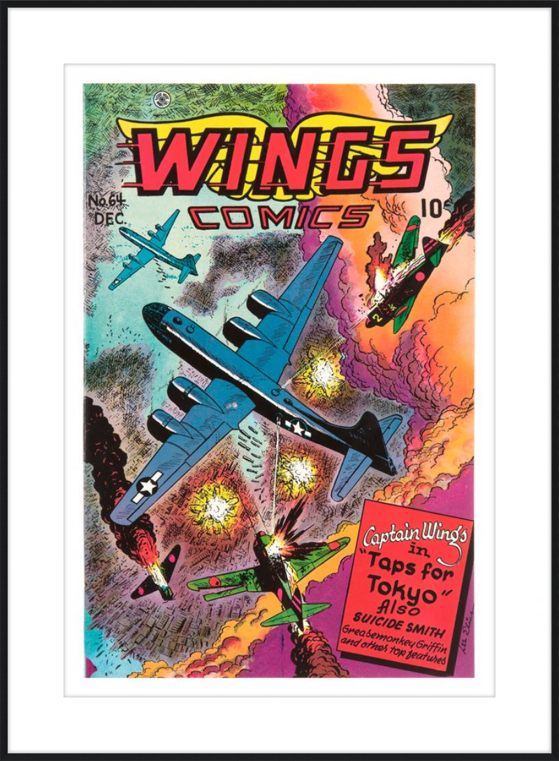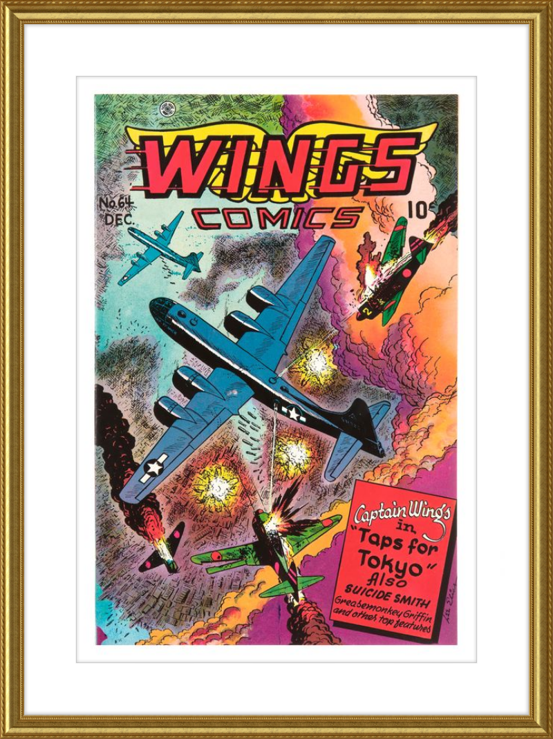 The bold colors and dramatic composition reflect the era's fascination with aviation warfare, a theme central to Fiction House’s wartime publications. Captain Wings, the heroic aviator, embodies the patriotic spirit of mid-20th-century America, resonating with readers during a time of global conflict. The cover’s meticulous detail and action-packed imagery underscore the Golden Age comic tradition of blending entertainment with wartime propaganda.