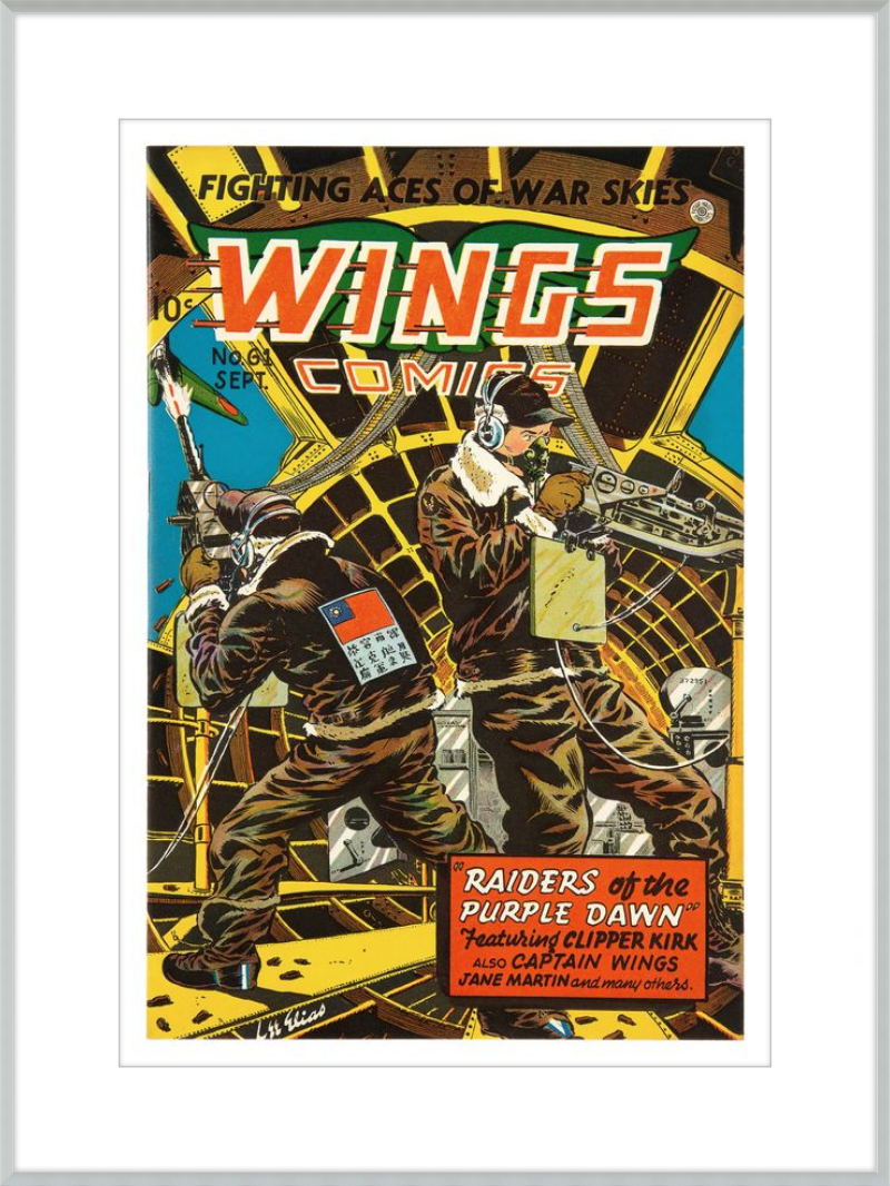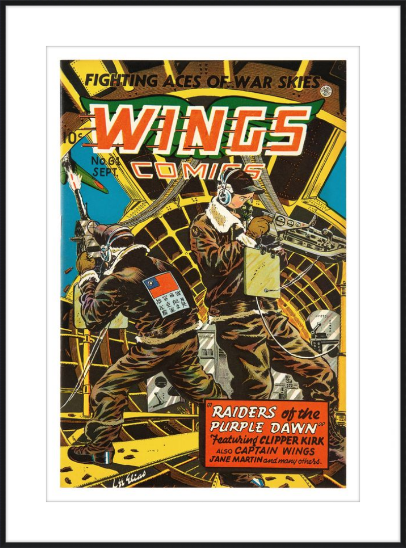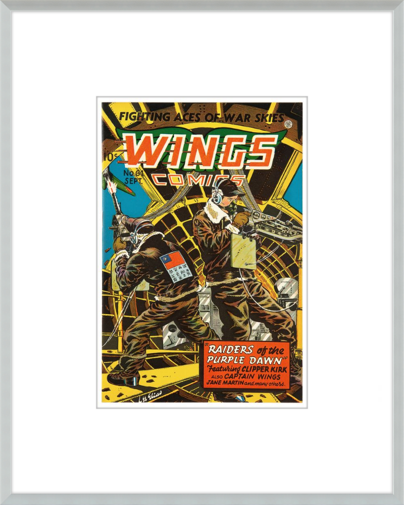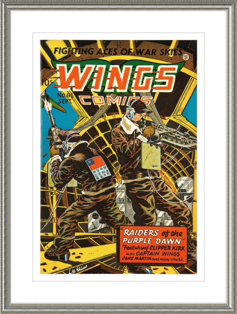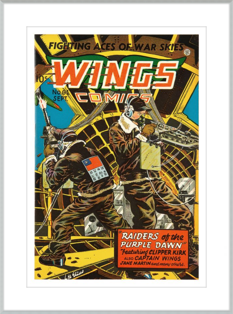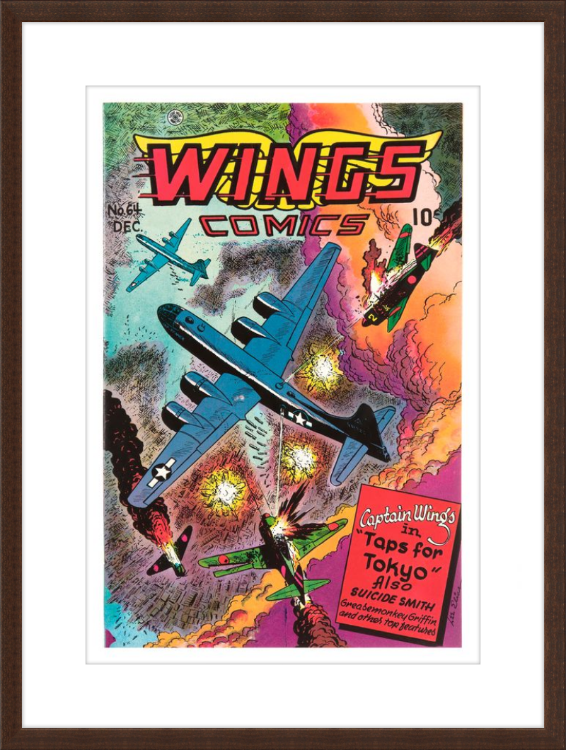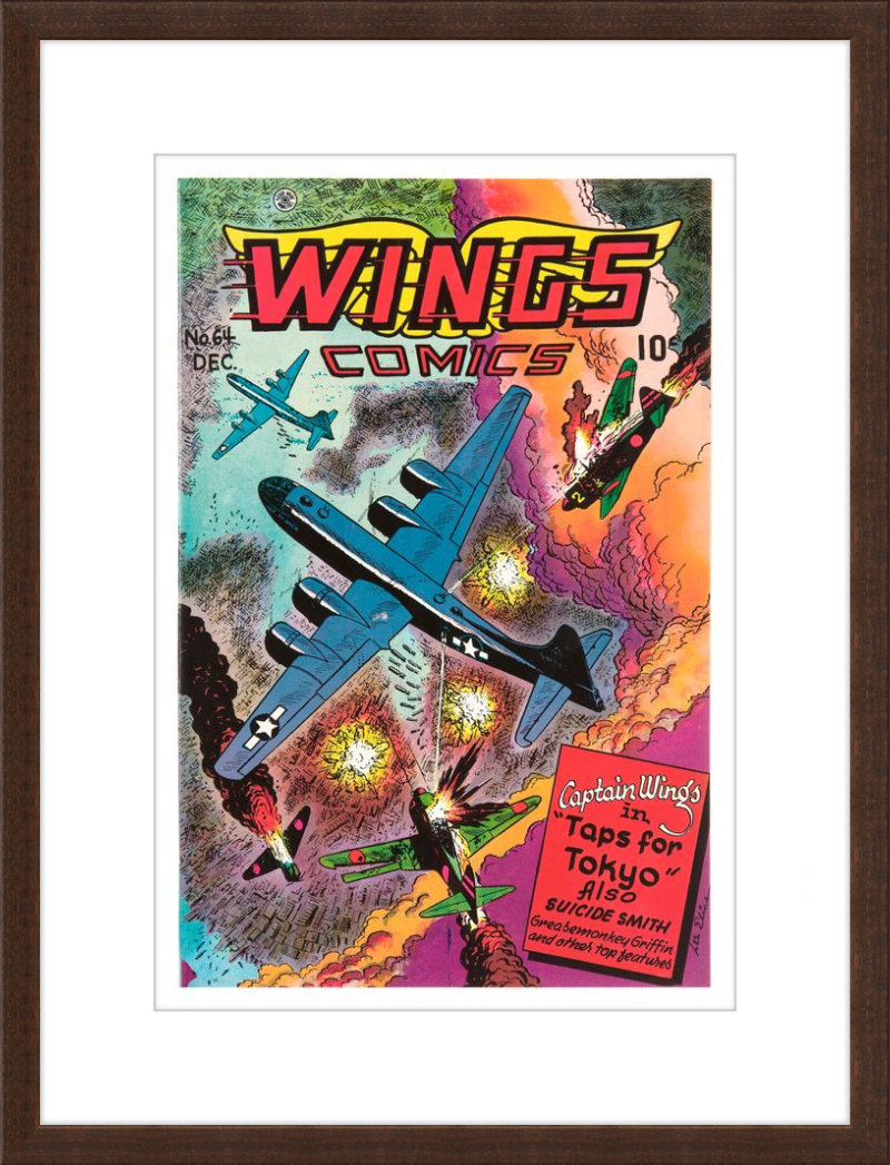 The bold colors and dramatic composition reflect the era's fascination with aviation warfare, a theme central to Fiction House’s wartime publications. Captain Wings, the heroic aviator, embodies the patriotic spirit of mid-20th-century America, resonating with readers during a time of global conflict. The cover’s meticulous detail and action-packed imagery underscore the Golden Age comic tradition of blending entertainment with wartime propaganda.