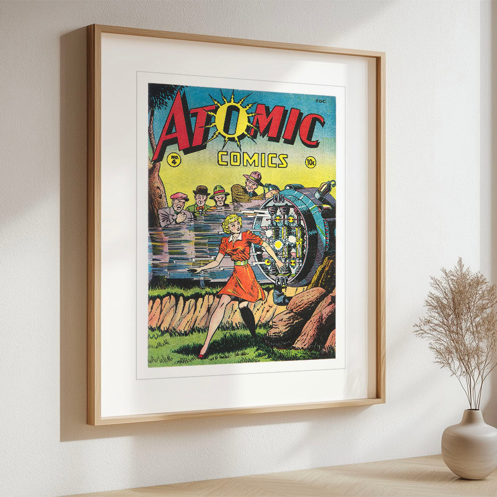 This striking issue of Atomic Comics captures the post-WWII fascination with atomic energy, blending it with pulp adventure. The cover, attributed to Matt Baker and possibly Jack Kamen, features Lucky Wings, the "Atomic Blondshell," caught in a dramatic moment as she evades a futuristic atomic energy projector. The dynamic composition, with its bold colors and sharp contrasts, reflects the era's burgeoning atomic age aesthetic.