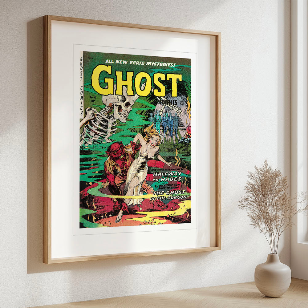 Maurice Whitman’s evocative cover for Ghost Comics #10 captures the macabre essence of 1950s pre-Code horror. Dominated by a skeletal specter and a vivid depiction of fiery torment, the artwork employs bold, swirling greens and reds to create an unsettling atmosphere. The central figure—a woman in peril—reflects the era’s fascination with vulnerability amid supernatural chaos.