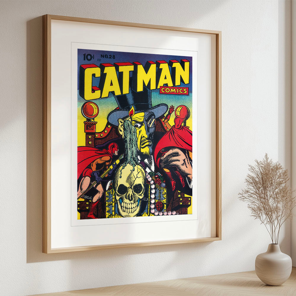 The striking cover of Cat-Man Comics #28, illustrated by L.B. Cole, exemplifies Golden Age artistry with its vivid, saturated hues and dramatic composition. The looming figure of Dr. Macabre, adorned in a sinister top hat and monocle, dominates the scene, his piercing gaze fixed on a skull dripping with wax—a macabre centerpiece encircled by stolen jewels. Cat-Man and Kitten, poised for action, flank the villain in dynamic poses that emphasize their agility and resolve.
