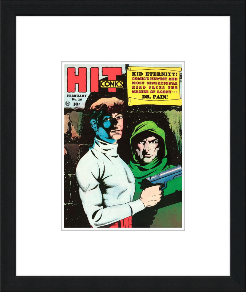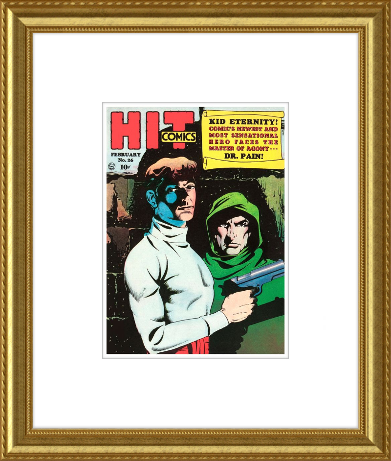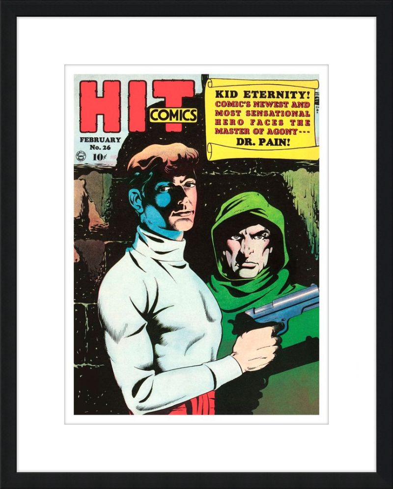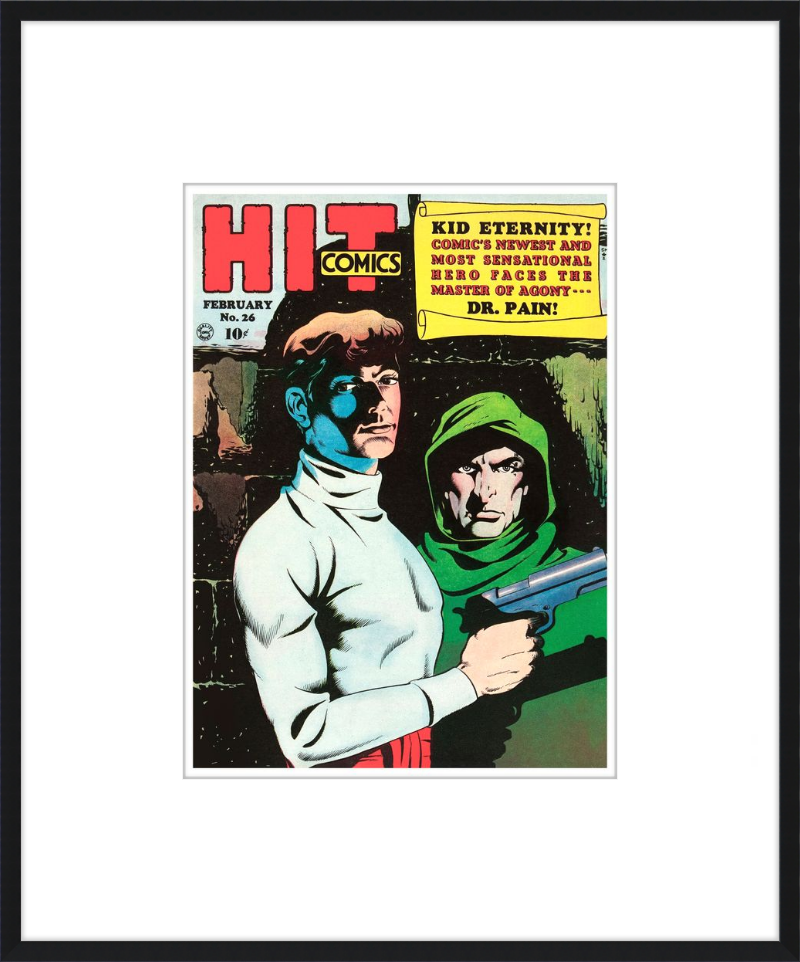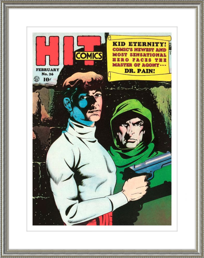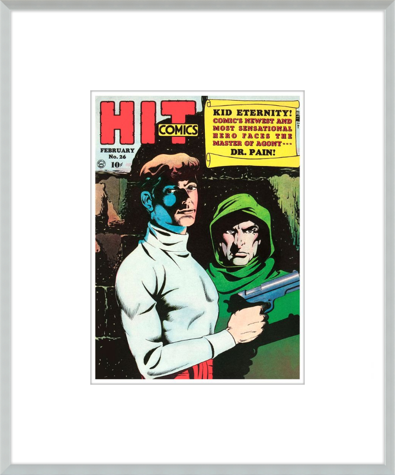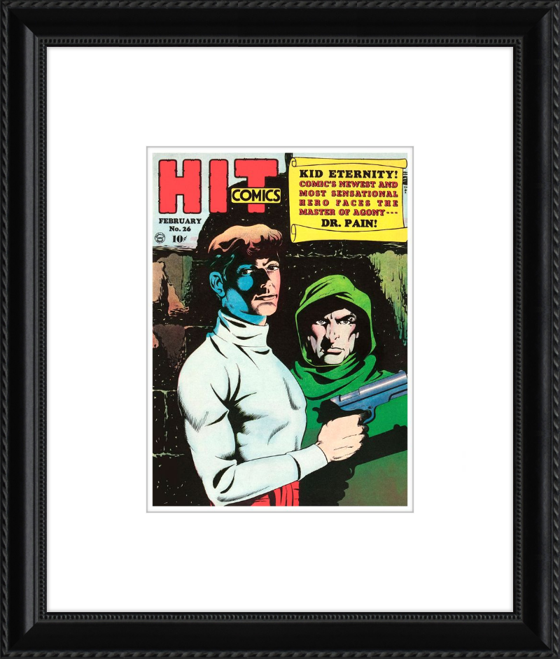 The February 1943 cover of Hit Comics #26, illustrated by Ruben Moreira, captures a dramatic confrontation between Kid Eternity and the sinister Dr. Pain. The composition is steeped in wartime pulp aesthetics, with bold colors and sharp contrasts emphasizing the tension of the scene.