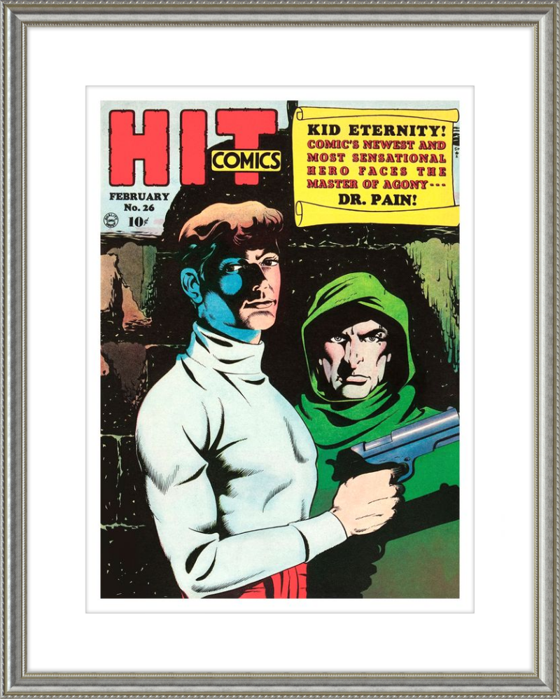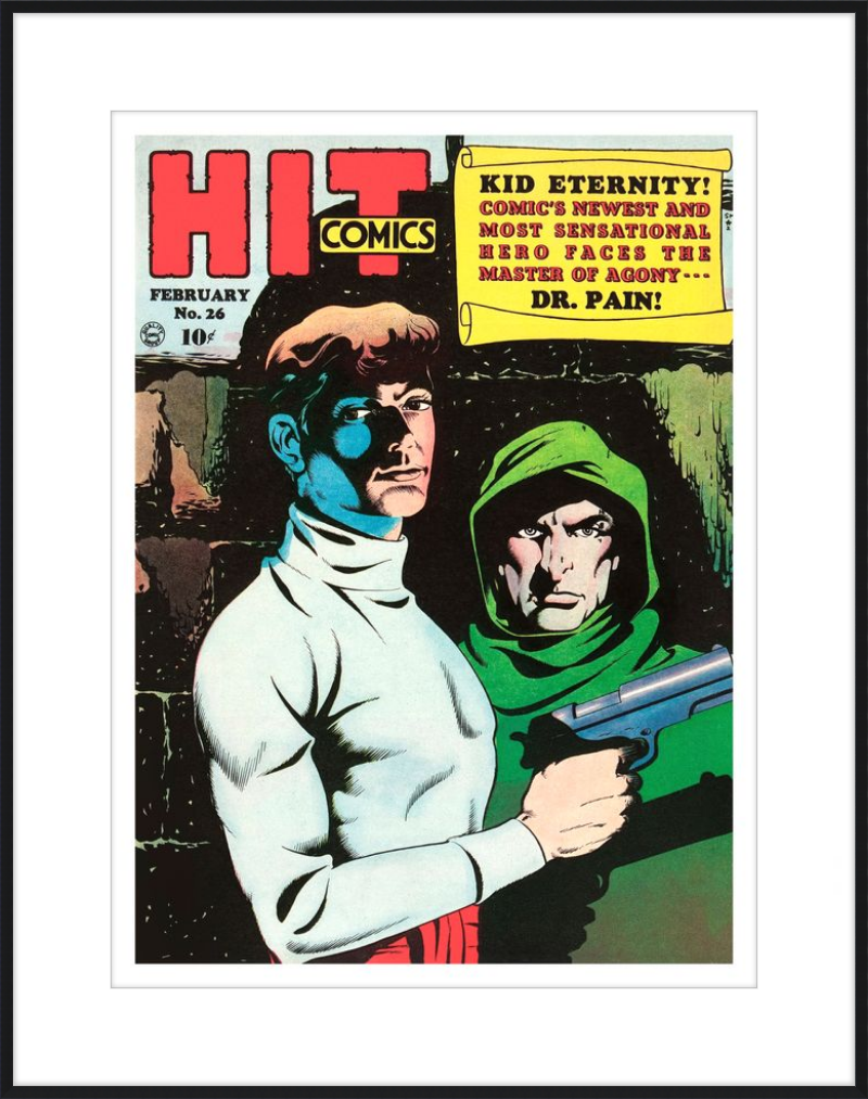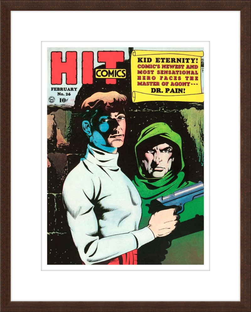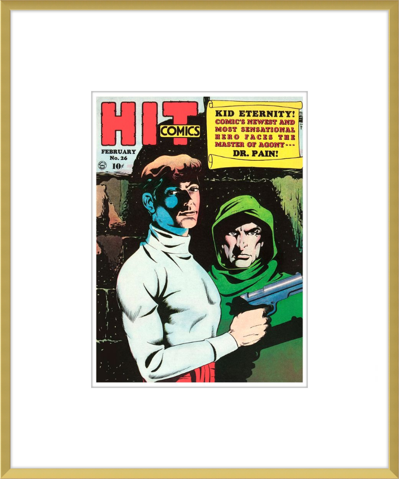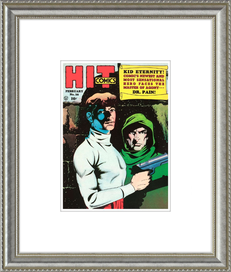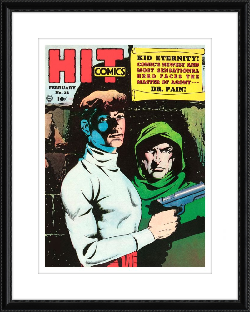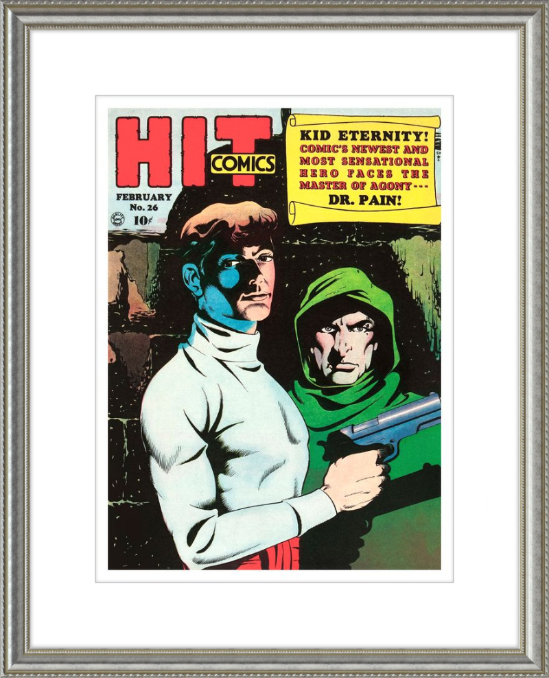 The February 1943 cover of Hit Comics #26, illustrated by Ruben Moreira, captures a dramatic confrontation between Kid Eternity and the sinister Dr. Pain. The composition is steeped in wartime pulp aesthetics, with bold colors and sharp contrasts emphasizing the tension of the scene.