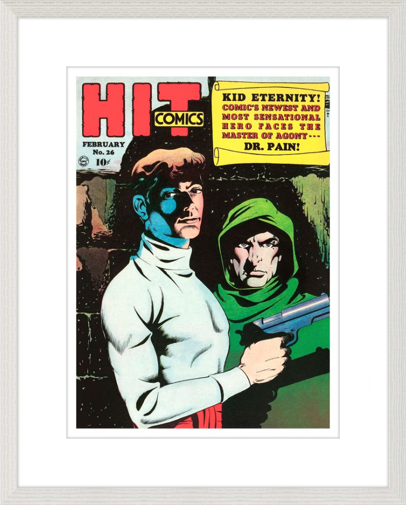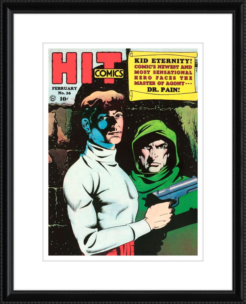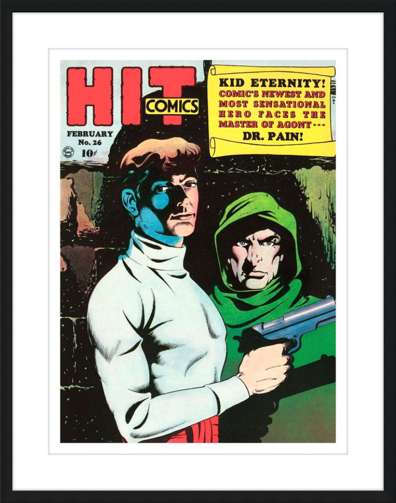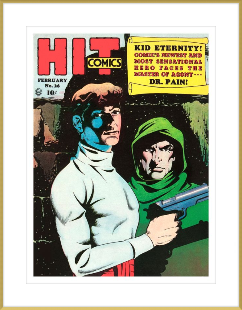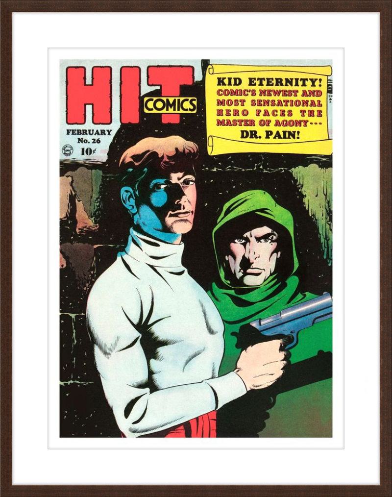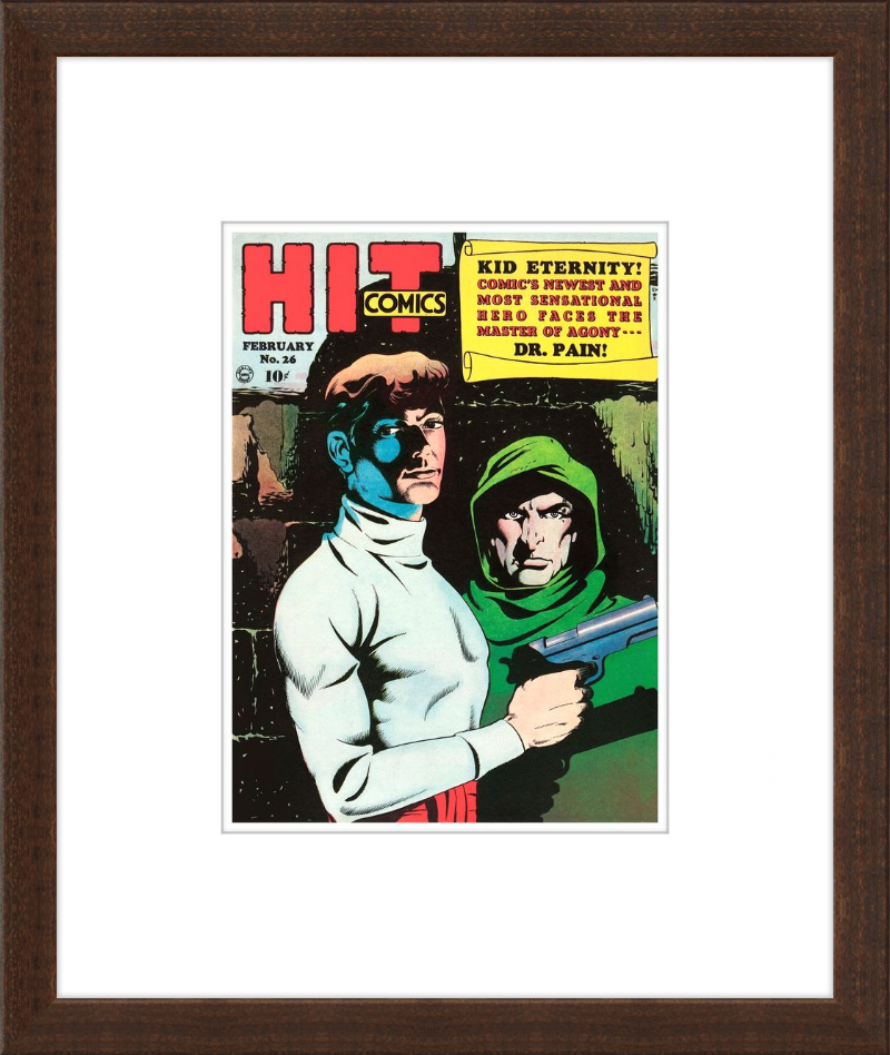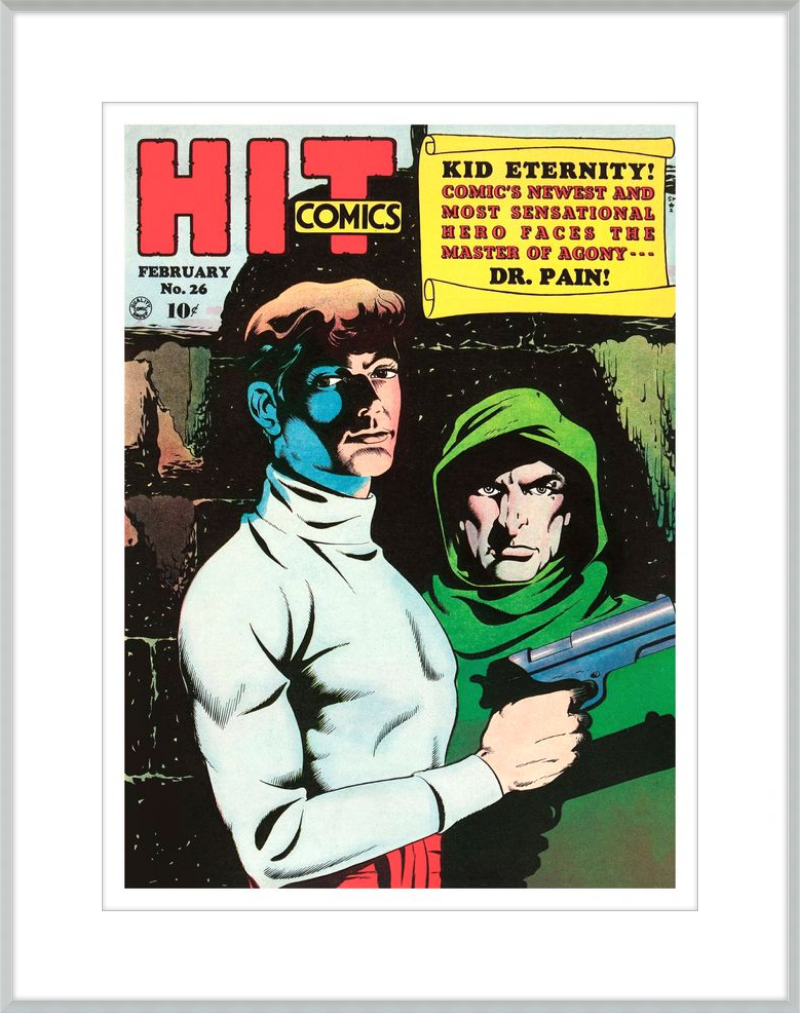 The February 1943 cover of Hit Comics #26, illustrated by Ruben Moreira, captures a dramatic confrontation between Kid Eternity and the sinister Dr. Pain. The composition is steeped in wartime pulp aesthetics, with bold colors and sharp contrasts emphasizing the tension of the scene.