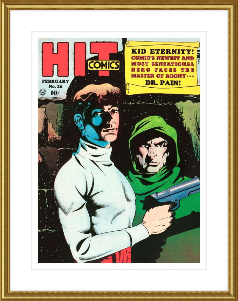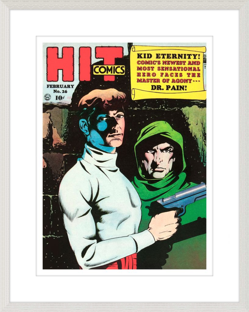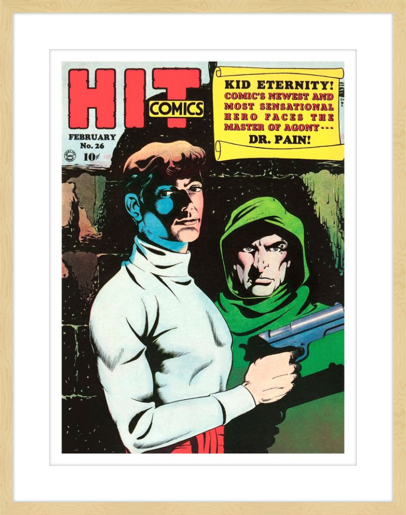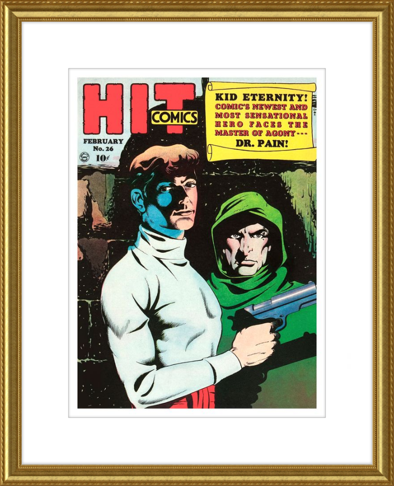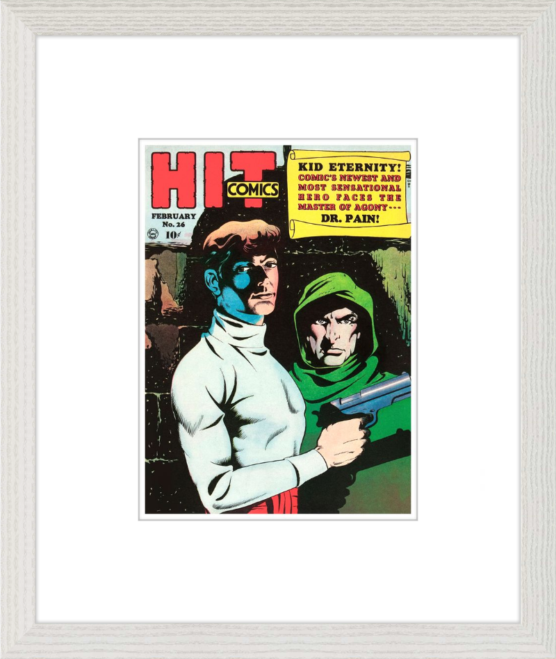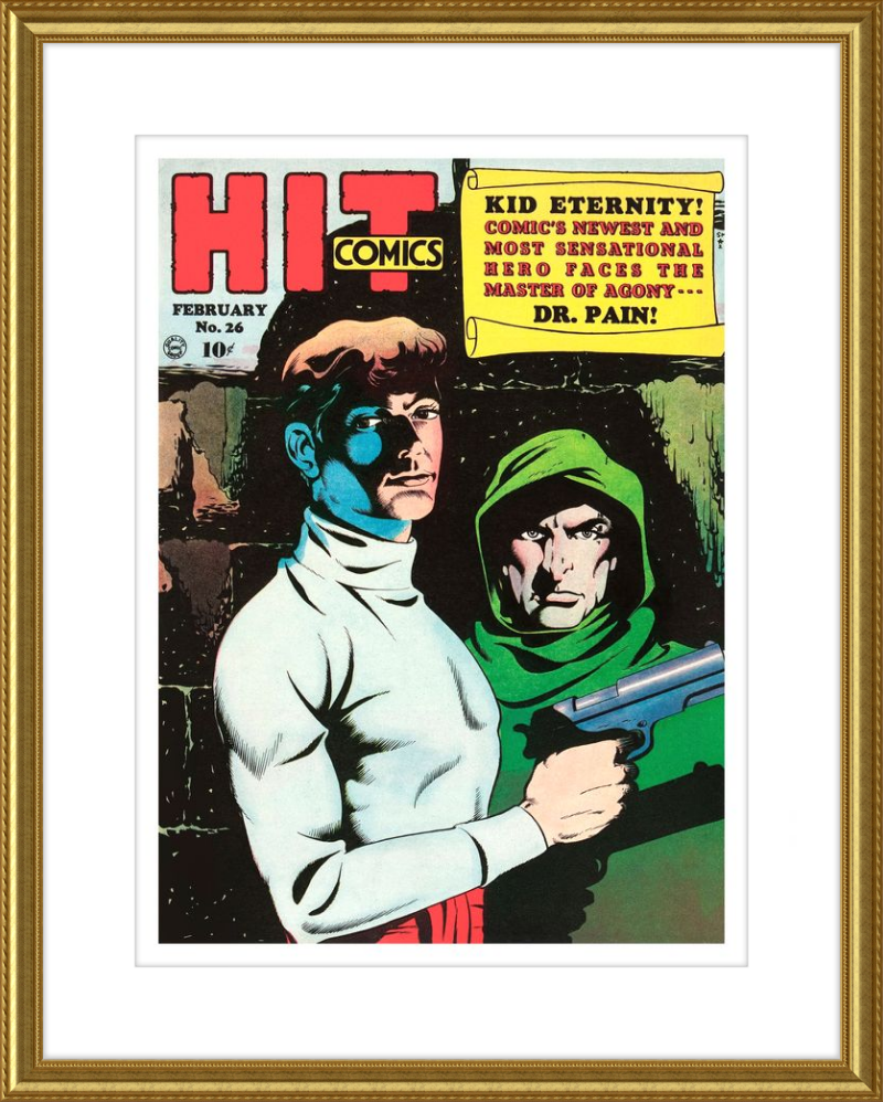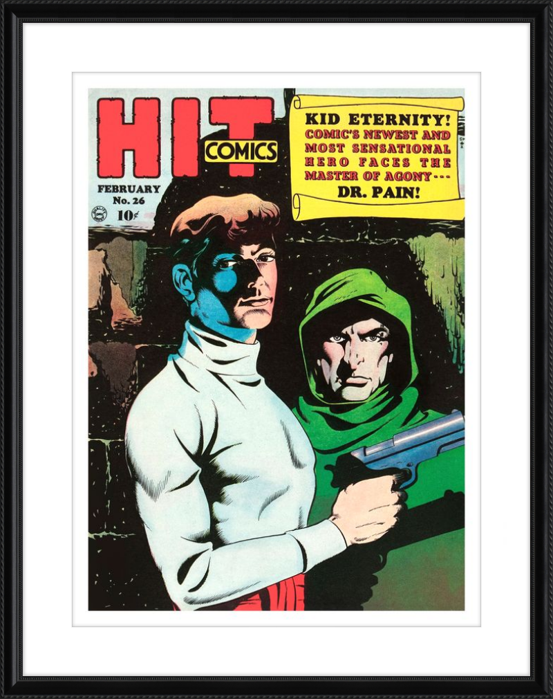The February 1943 cover of Hit Comics #26, illustrated by Ruben Moreira, captures a dramatic confrontation between Kid Eternity and the sinister Dr. Pain. The composition is steeped in wartime pulp aesthetics, with bold colors and sharp contrasts emphasizing the tension of the scene.