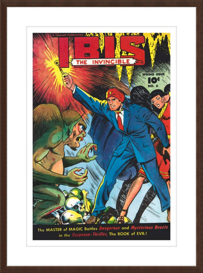 This striking cover captures the Golden Age fascination with mysticism and adventure, as Ibis, clad in a sharp blue suit, wields the Ibistick against a grotesque winged creature amidst a macabre pile of skulls. The dynamic composition emphasizes movement and peril, with vivid primary colors and dramatic lighting creating an otherworldly glow around the Ibistick.