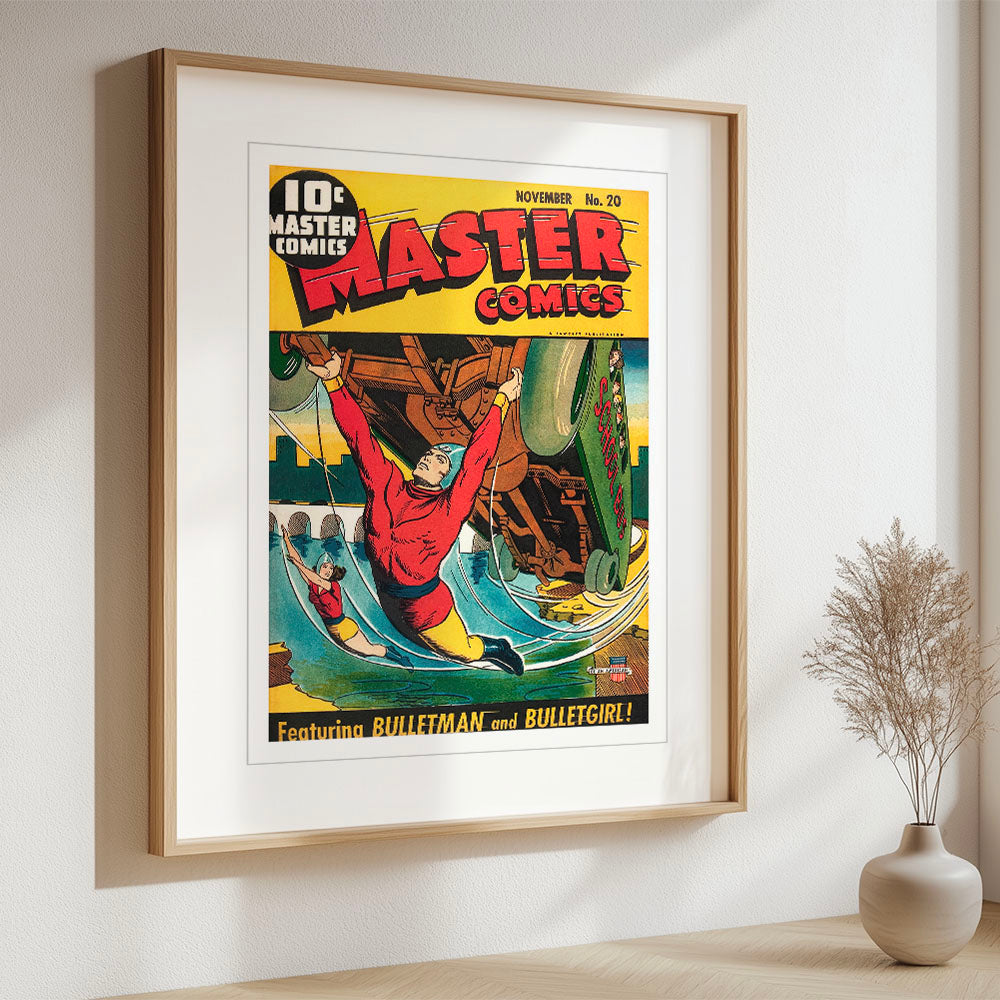 This November 1941 issue of Master Comics captures the dynamic heroism of Bulletman and Bulletgirl, two of Fawcett Comics' most enduring Golden Age characters. The cover depicts the duo in a daring rescue as they prevent a school bus from plunging into perilous waters, showcasing their strength and agility.