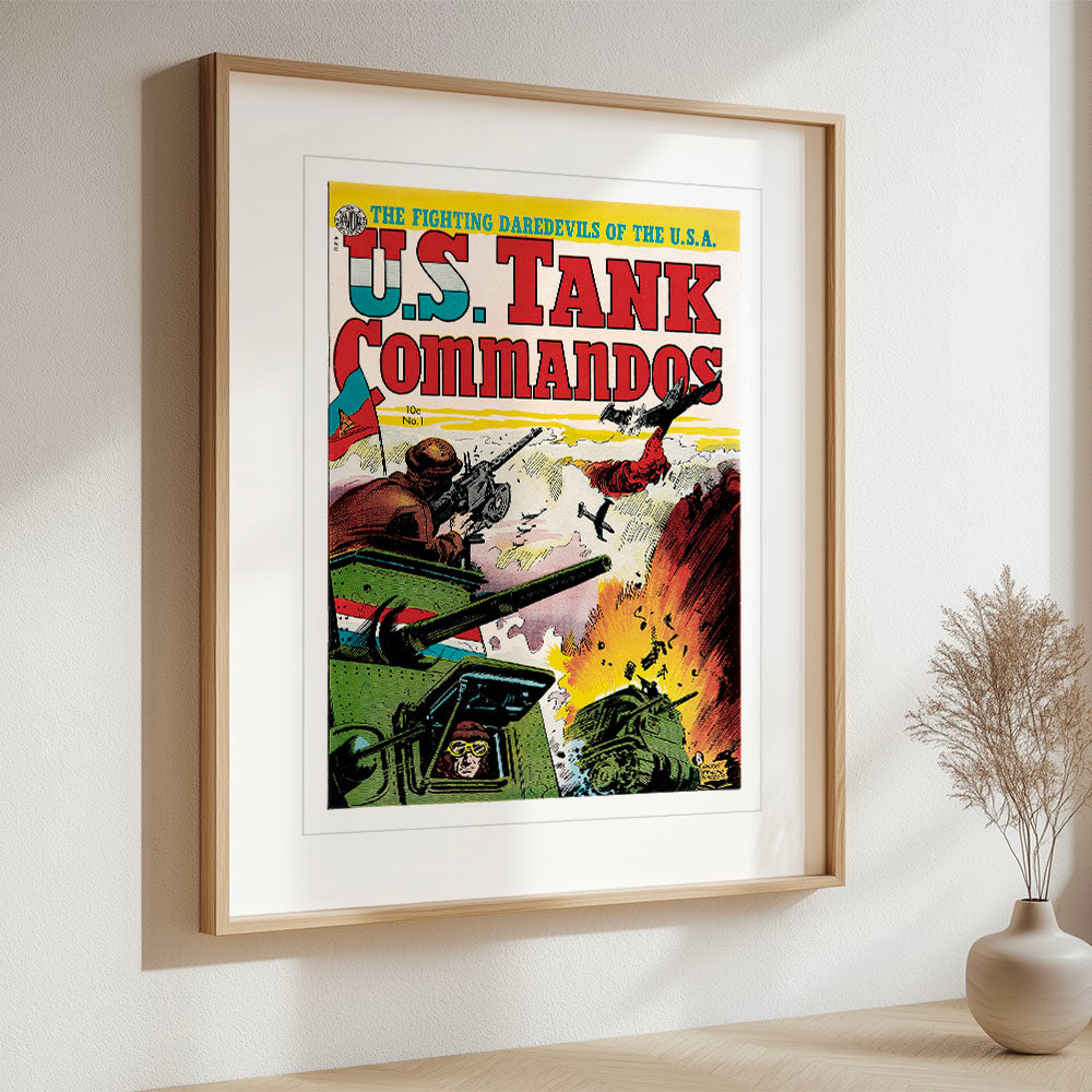 This dynamic cover from Avon Periodicals captures the explosive intensity of wartime action, emblematic of post-WWII popular media. The detailed illustration showcases U.S. tank crews in combat, with soldiers manning machine guns and tanks unleashing firepower amidst chaos. The vivid use of reds and yellows in the explosion conveys urgency and destruction, while the bold typography emphasizes the patriotic theme central to the era’s storytelling.
