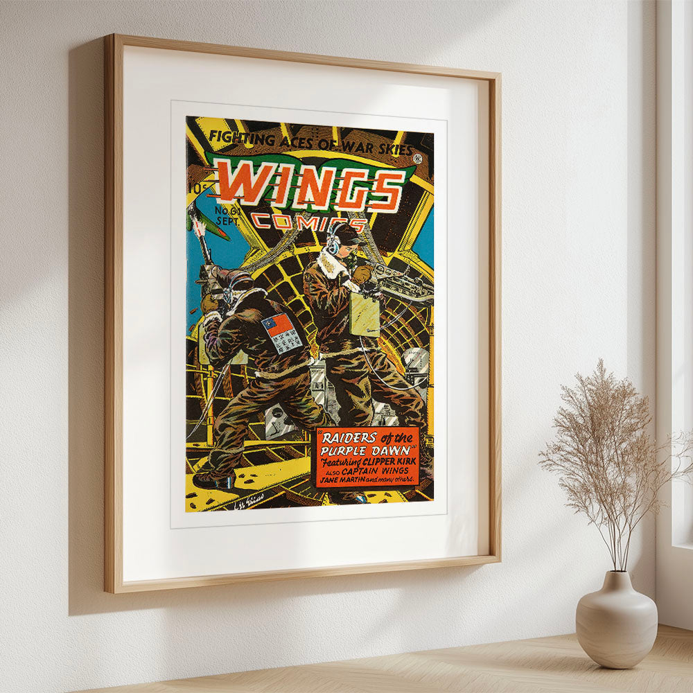 This striking cover from Wings Comics #61 showcases the dynamic artistry characteristic of the Golden Age of comics, with Lee Elias' meticulous attention to detail in rendering the interior of a bomber plane. The Taiwanese flag patch on the airman’s jacket reflects the global alliances of World War II, emphasizing the era's geopolitical significance. The bold typography and vibrant palette evoke wartime propaganda, while the tagline "Raiders of the Purple Dawn" hints at high-stakes aerial drama.
