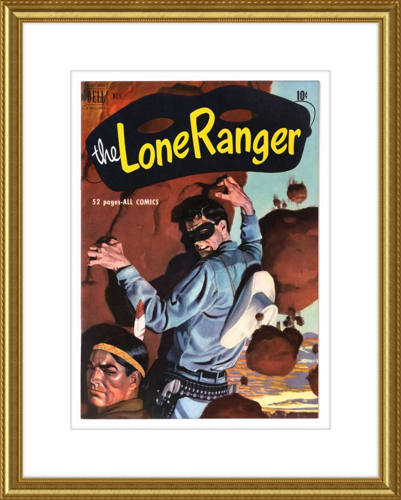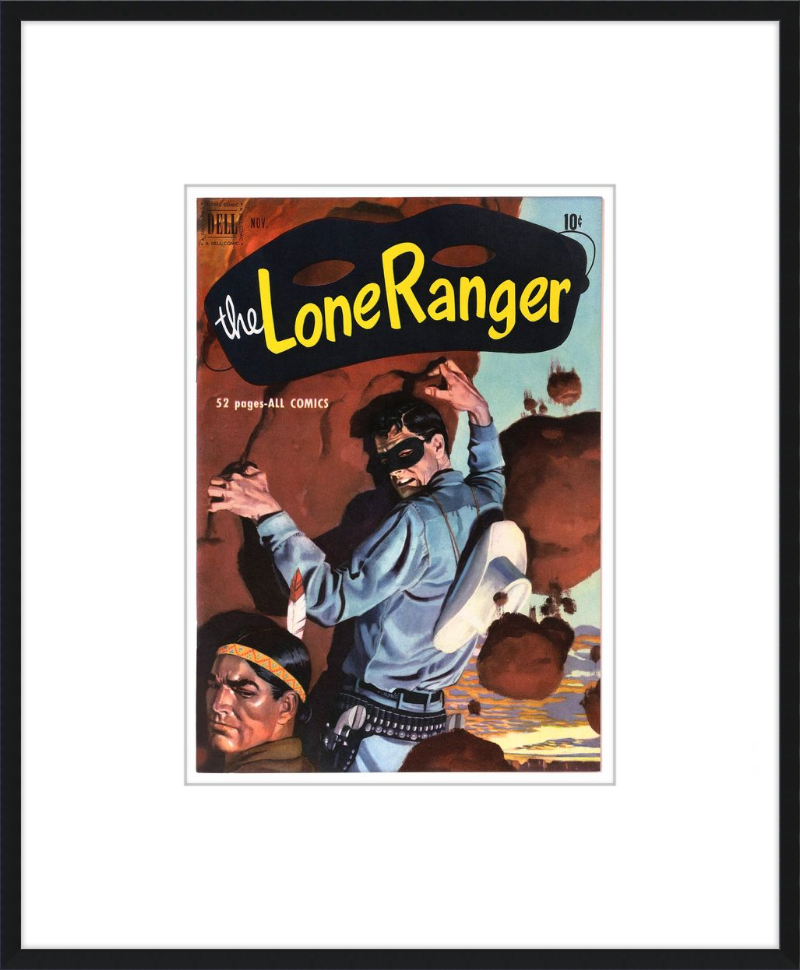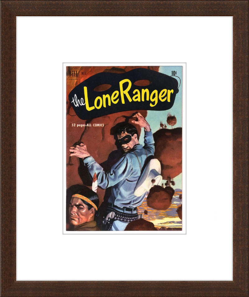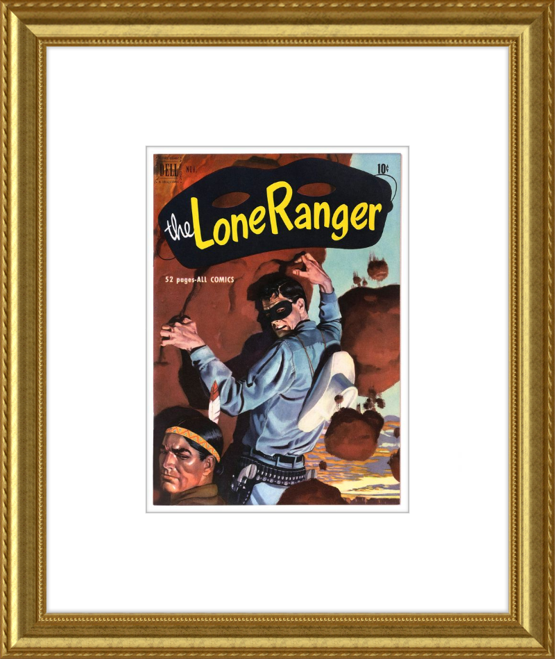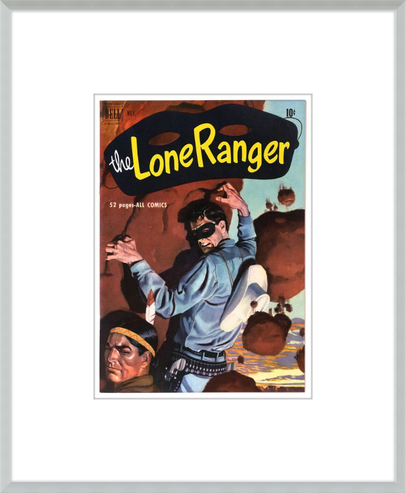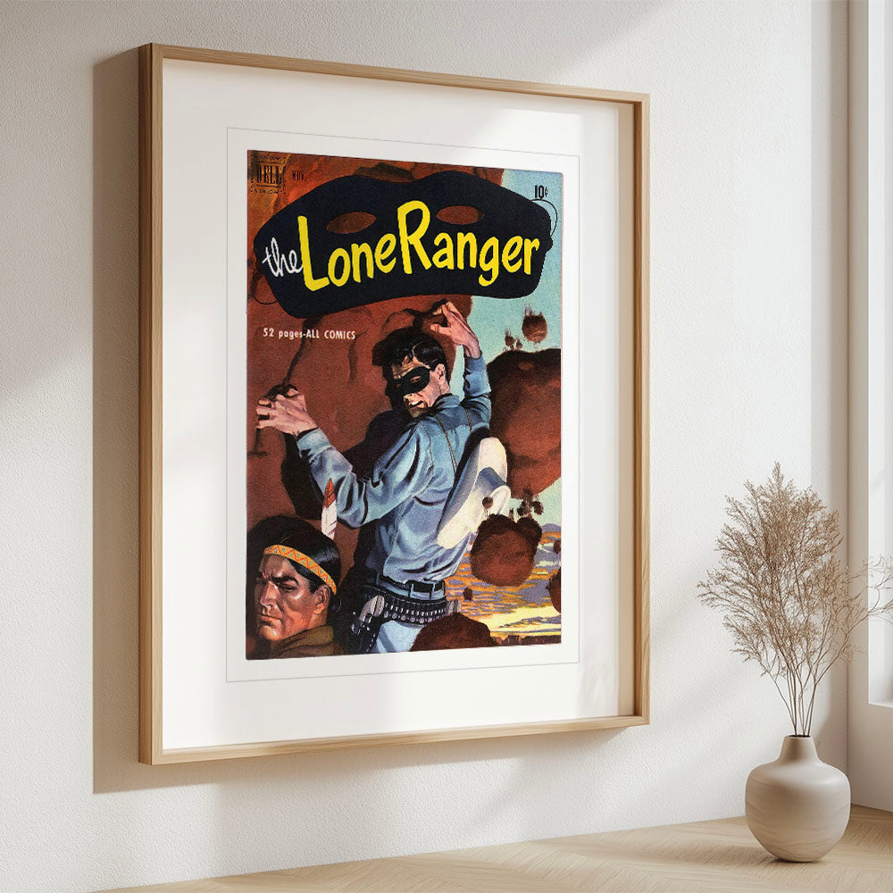 This dynamic cover from Dell Comics encapsulates the rugged tension of the American West, with the Lone Ranger caught mid-action amidst a perilous rockfall. The dramatic composition highlights his iconic blue shirt and white hat, symbols of justice and resilience, while Tonto’s feathered headband nods to his Native American heritage, reflecting the era's cultural fascination with frontier alliances.