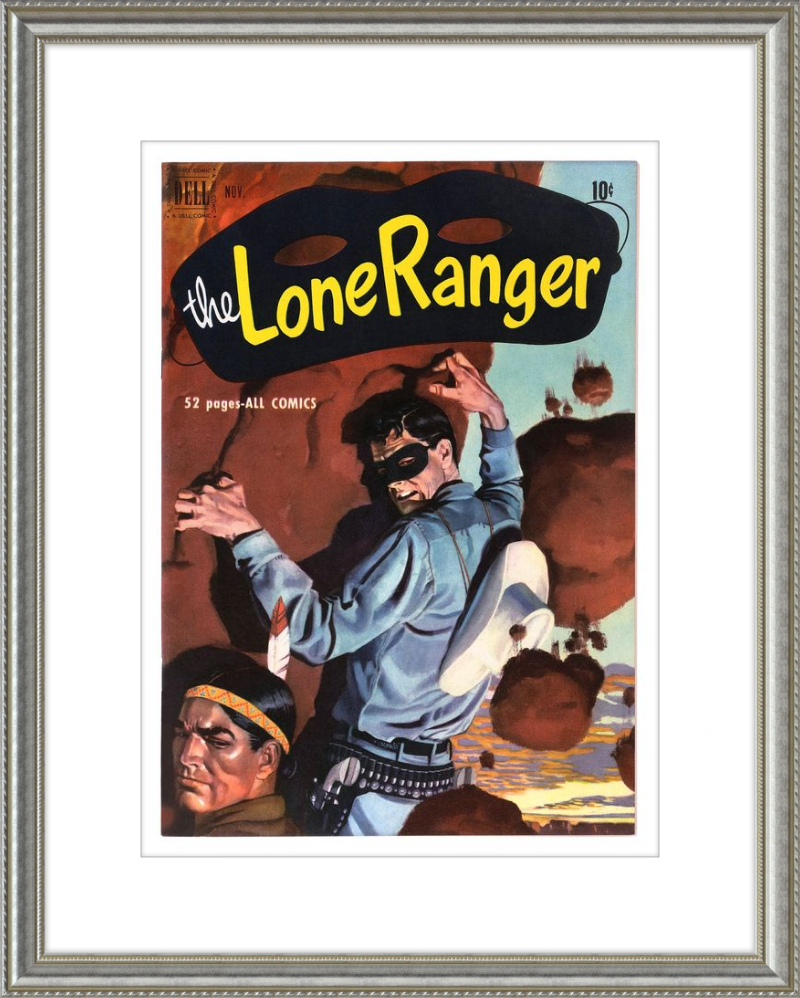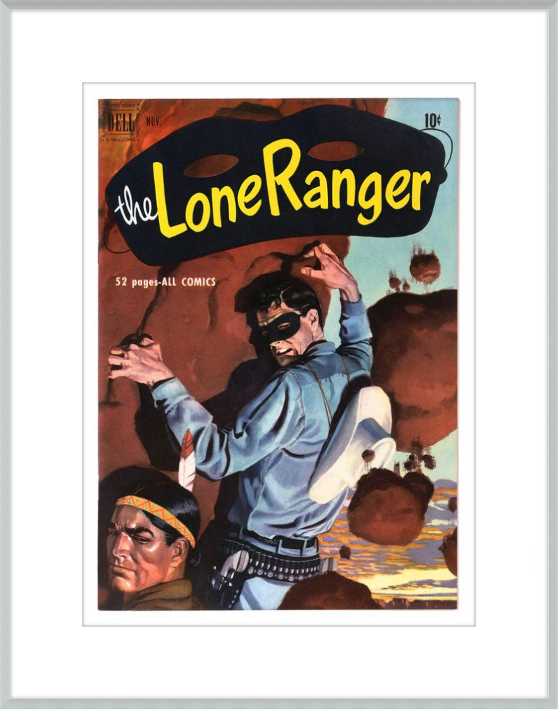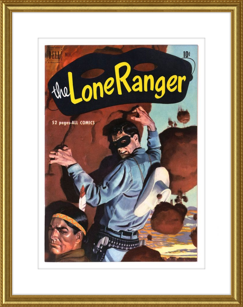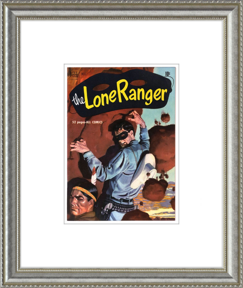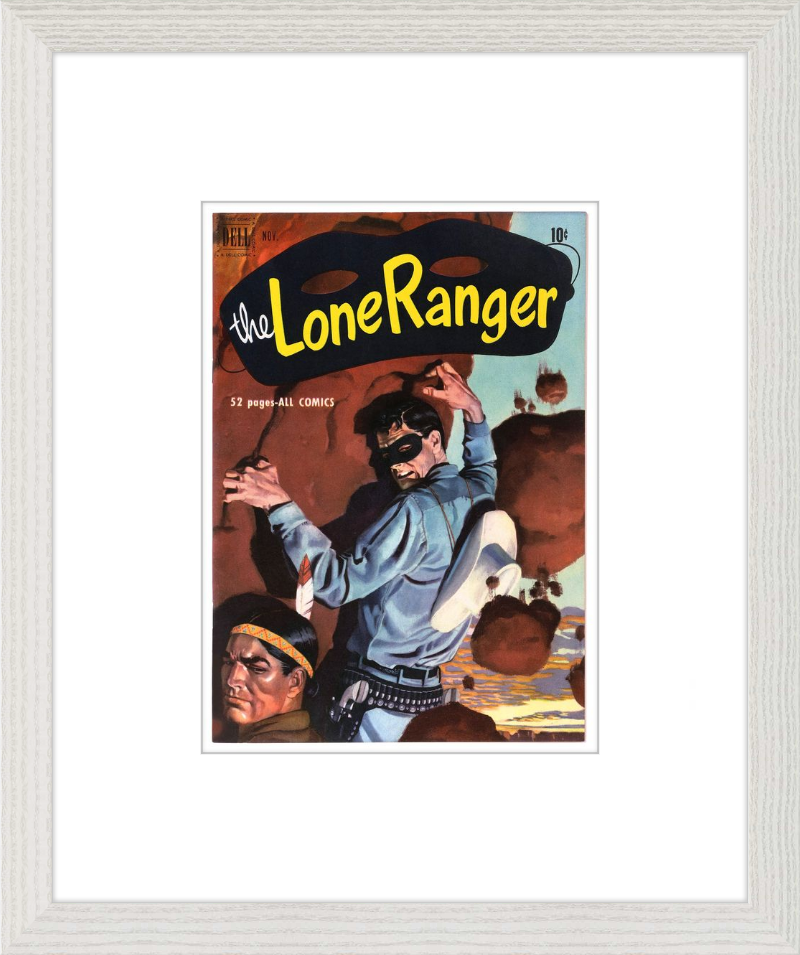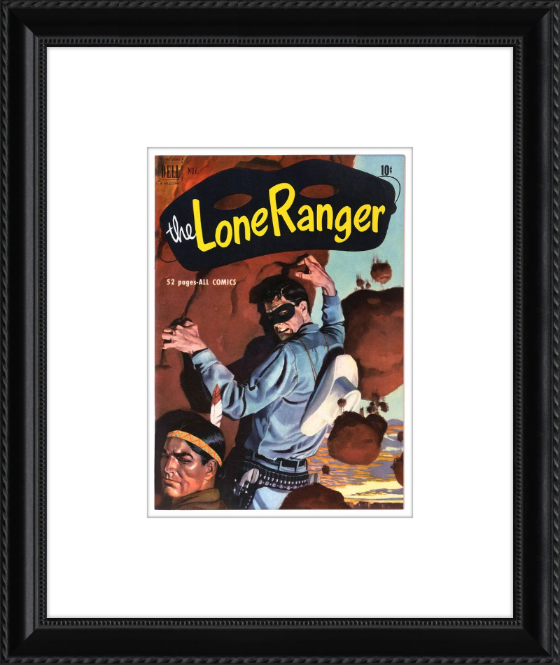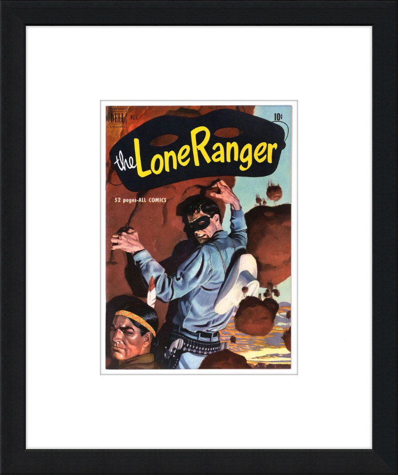 This dynamic cover from Dell Comics encapsulates the rugged tension of the American West, with the Lone Ranger caught mid-action amidst a perilous rockfall. The dramatic composition highlights his iconic blue shirt and white hat, symbols of justice and resilience, while Tonto’s feathered headband nods to his Native American heritage, reflecting the era's cultural fascination with frontier alliances.