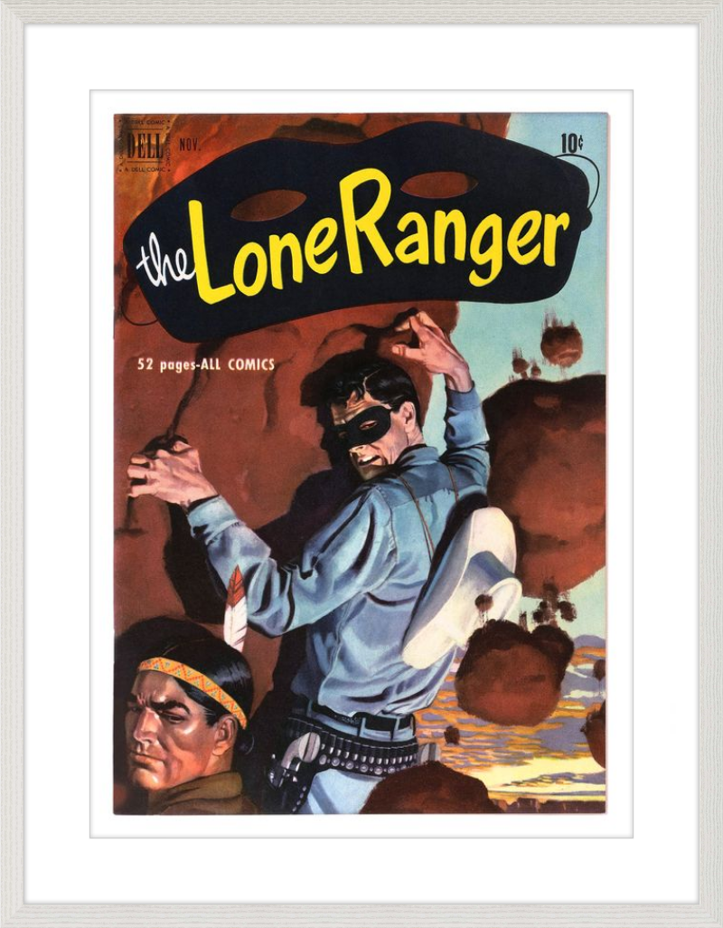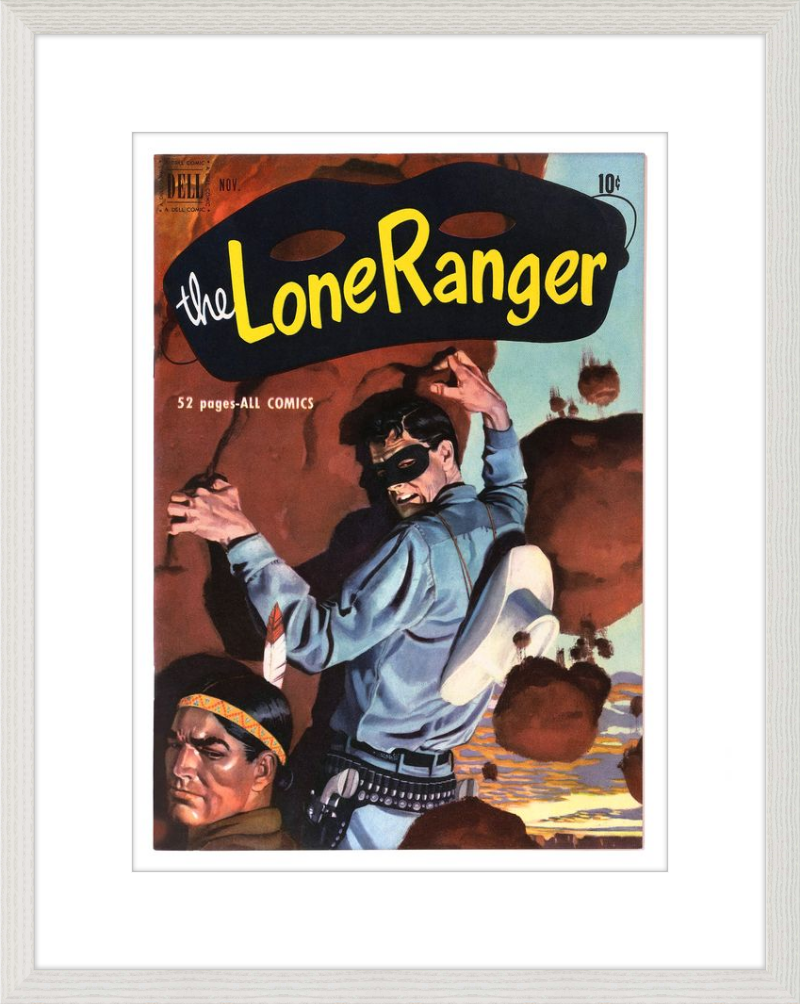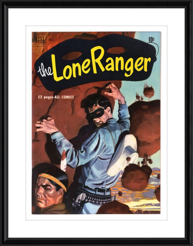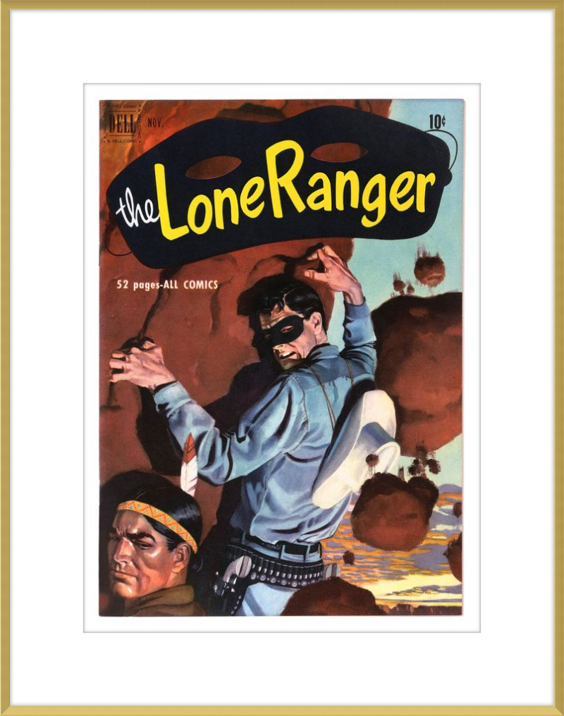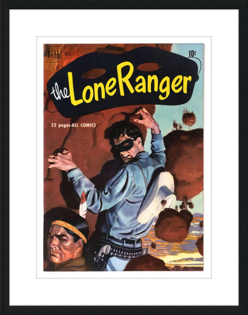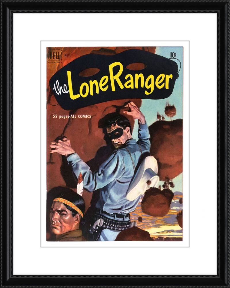 This dynamic cover from Dell Comics encapsulates the rugged tension of the American West, with the Lone Ranger caught mid-action amidst a perilous rockfall. The dramatic composition highlights his iconic blue shirt and white hat, symbols of justice and resilience, while Tonto’s feathered headband nods to his Native American heritage, reflecting the era's cultural fascination with frontier alliances.