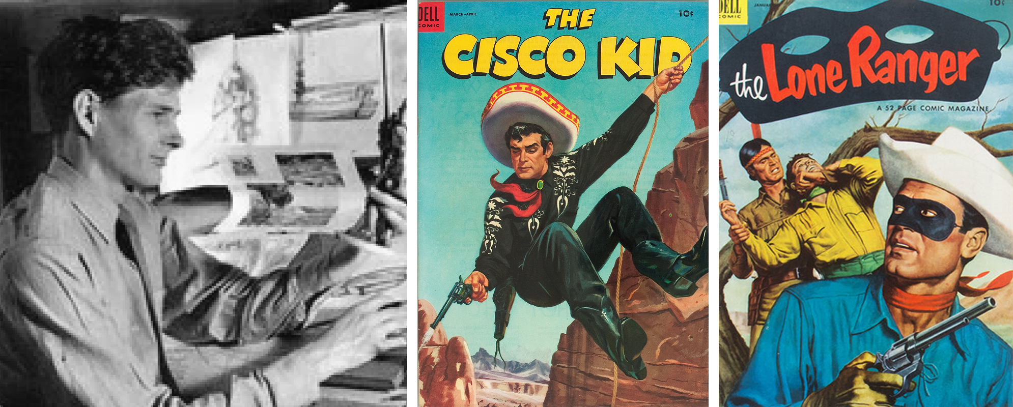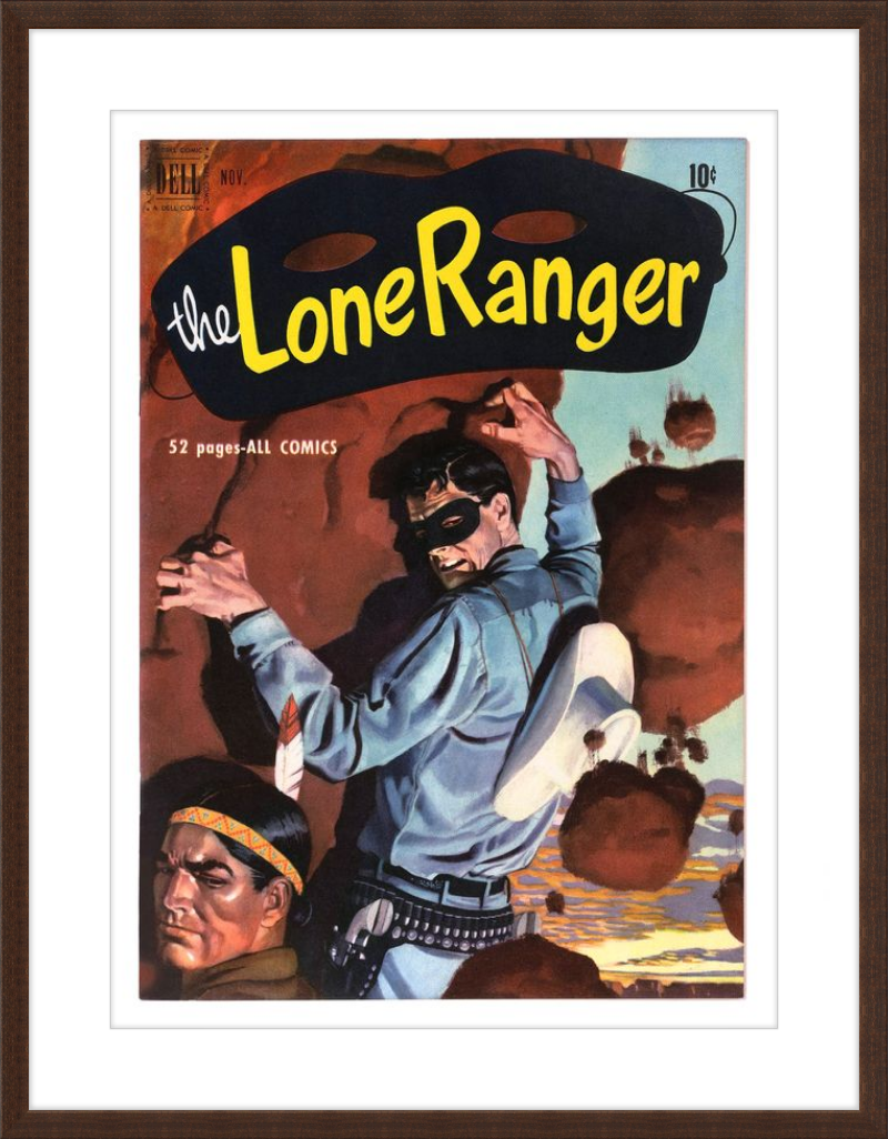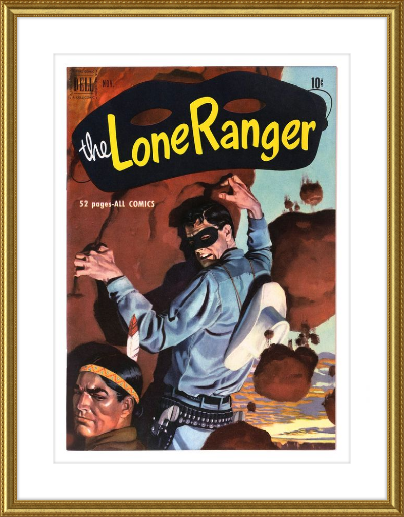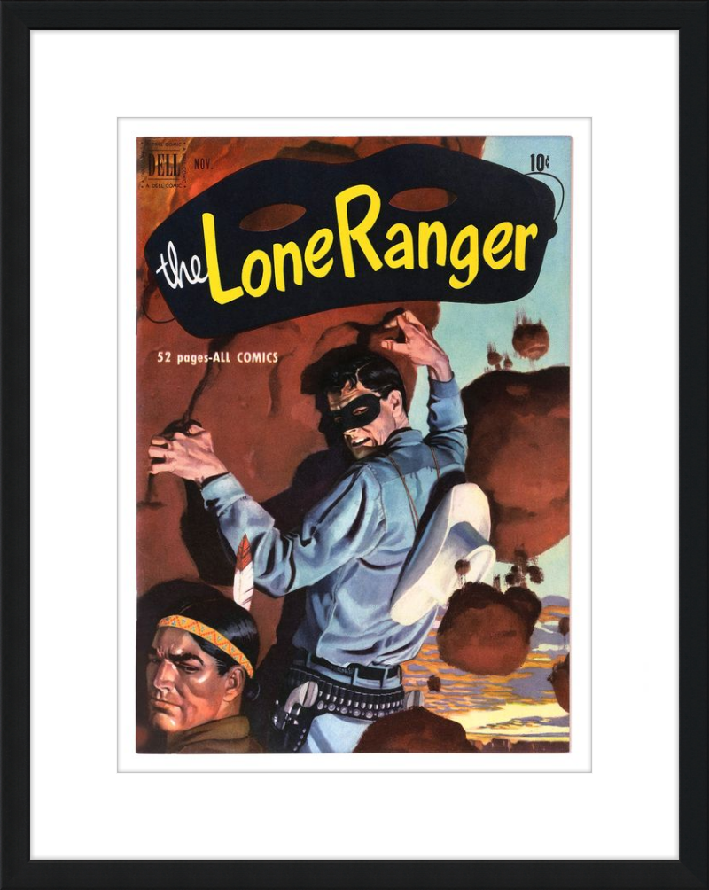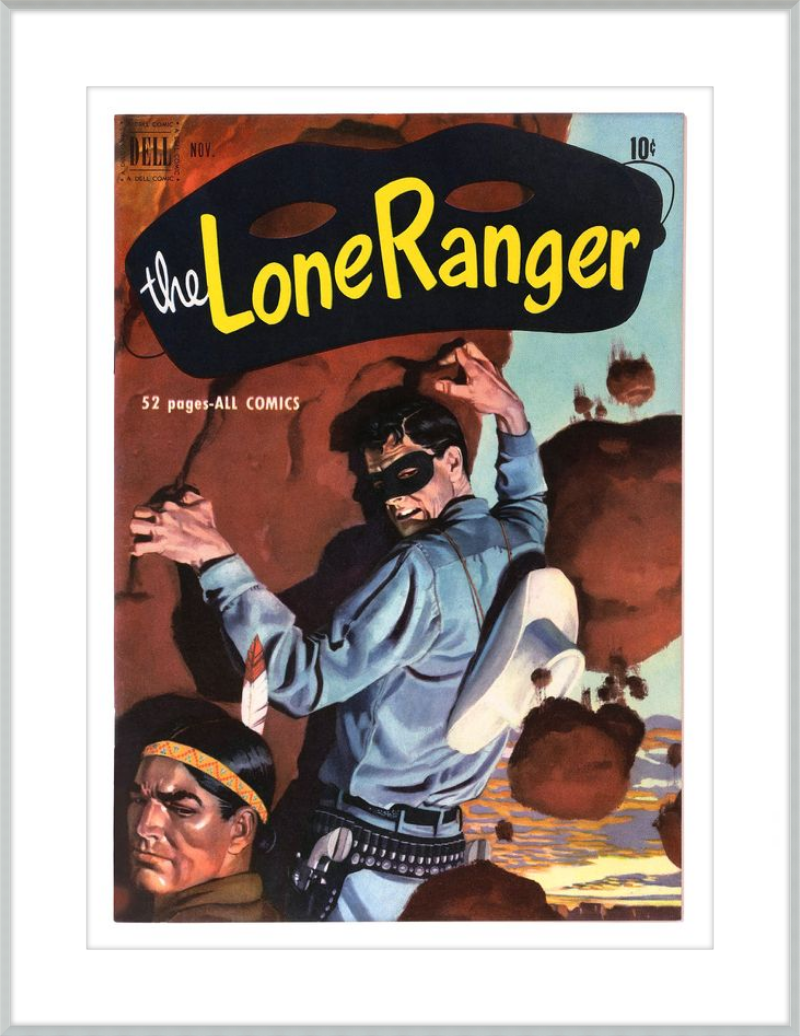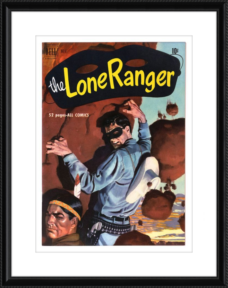 This dynamic cover from Dell Comics encapsulates the rugged tension of the American West, with the Lone Ranger caught mid-action amidst a perilous rockfall. The dramatic composition highlights his iconic blue shirt and white hat, symbols of justice and resilience, while Tonto’s feathered headband nods to his Native American heritage, reflecting the era's cultural fascination with frontier alliances.