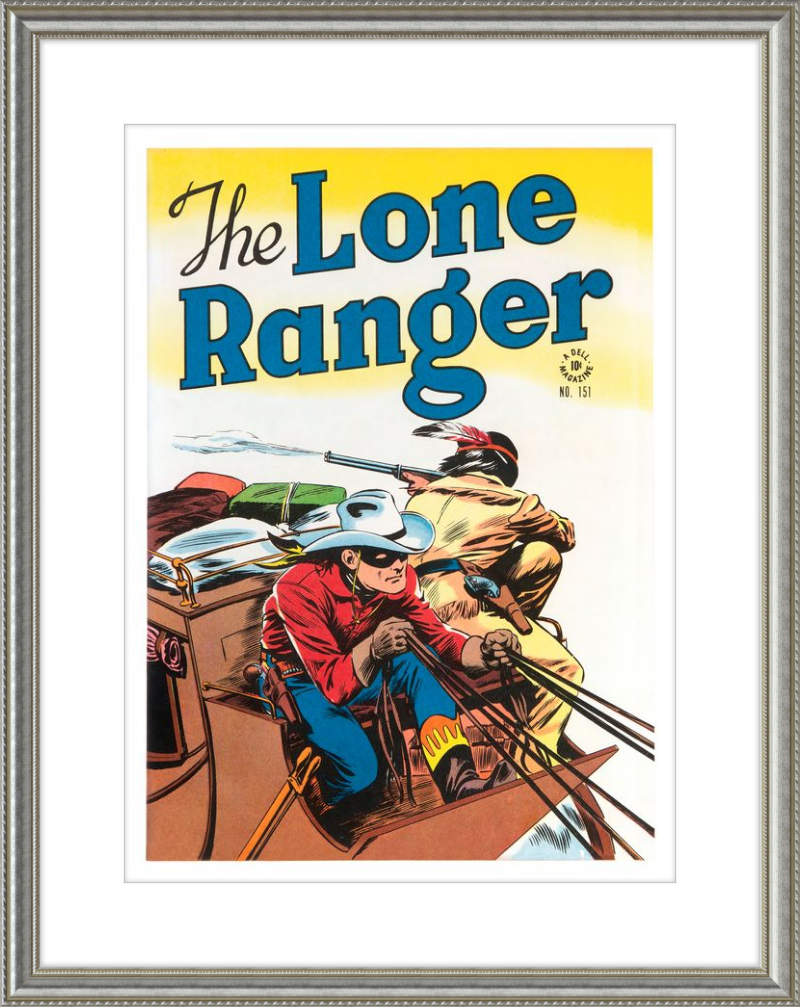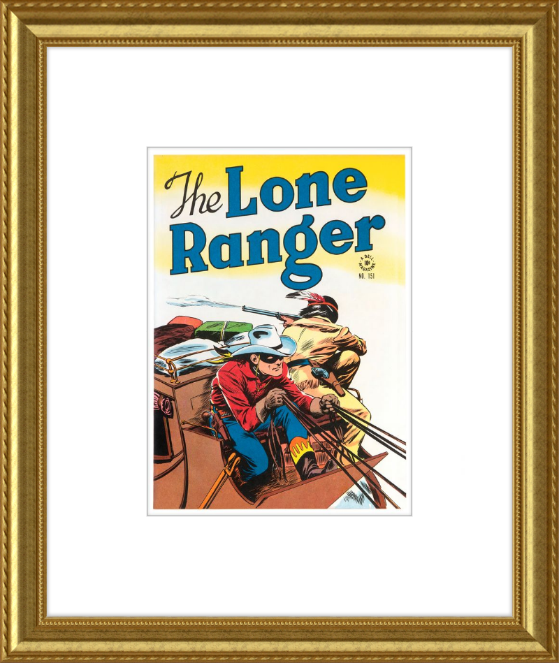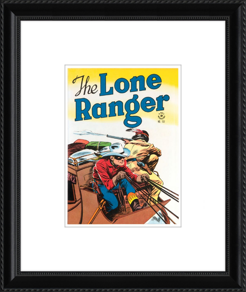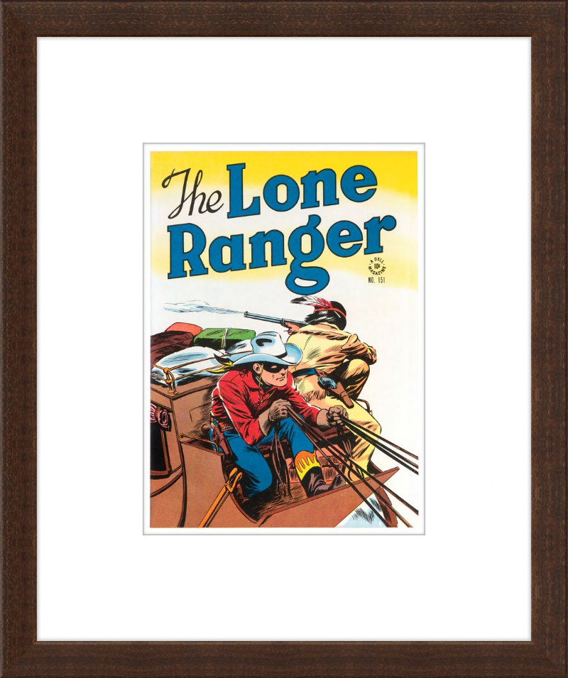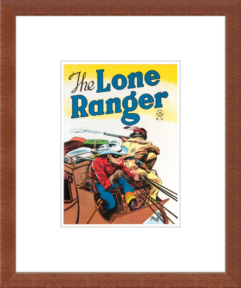 This 1947 issue of Four Color Comics features the Lone Ranger, a cultural icon of American Western lore, in a dynamic stagecoach chase alongside his loyal companion, Tonto. The cover's bold composition captures mid-century pulp artistry, with rich, saturated colors and dramatic action that evoke the rugged spirit of the Golden Age of Comics. The Lone Ranger's red shirt and white hat contrast sharply with Tonto's earth-toned attire, reflecting their distinct yet complementary roles.