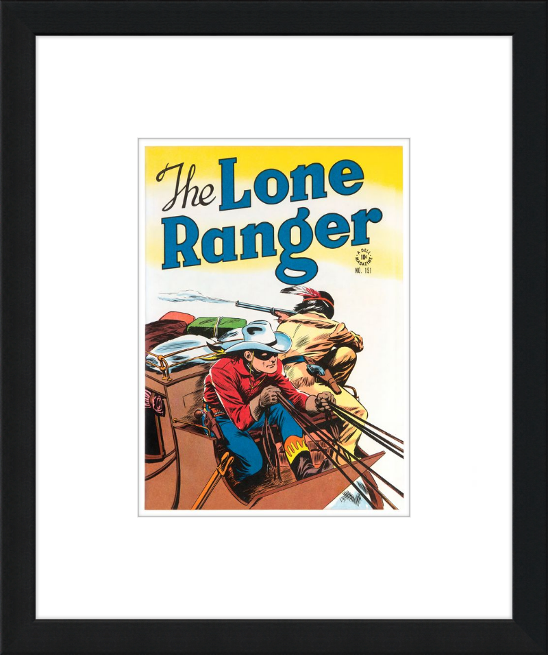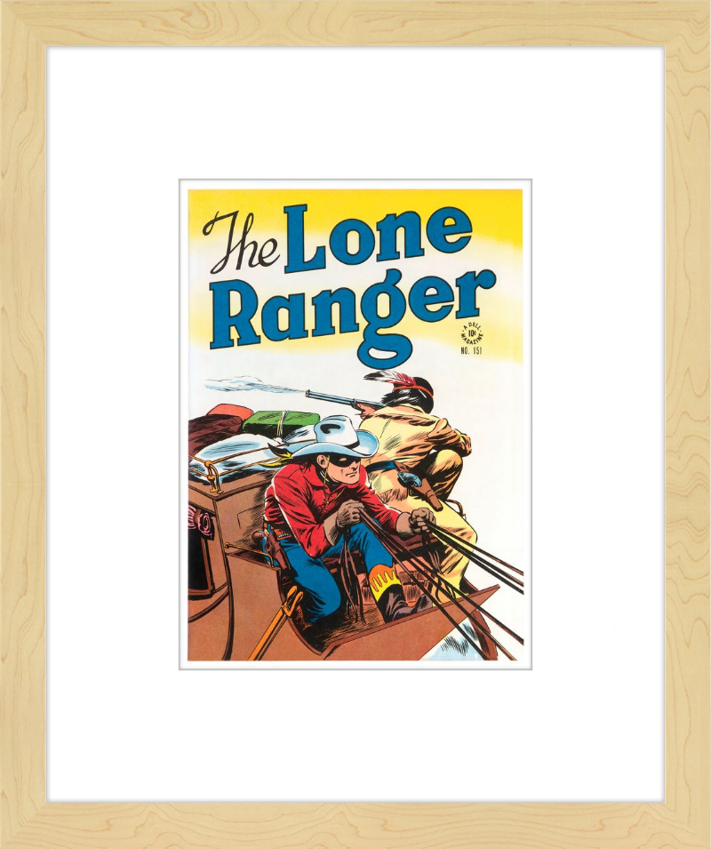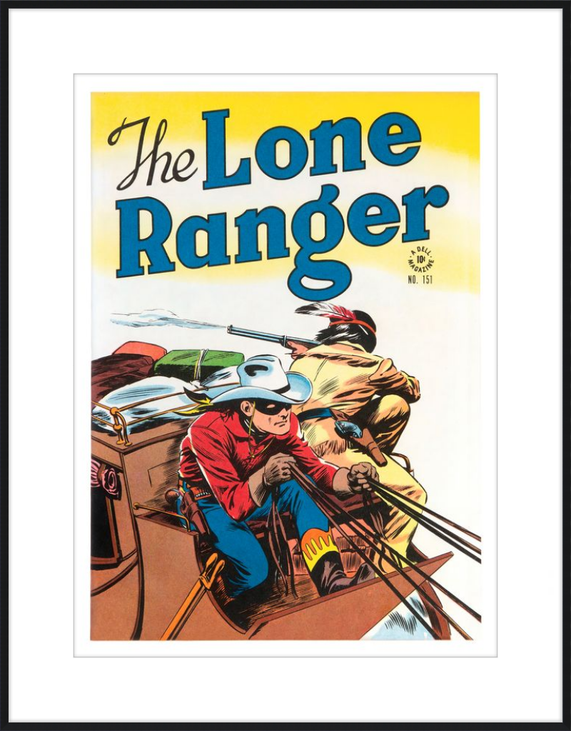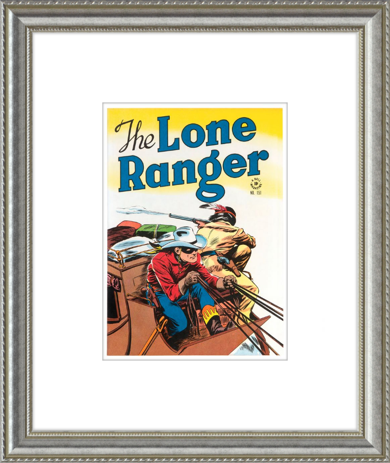 This 1947 issue of Four Color Comics features the Lone Ranger, a cultural icon of American Western lore, in a dynamic stagecoach chase alongside his loyal companion, Tonto. The cover's bold composition captures mid-century pulp artistry, with rich, saturated colors and dramatic action that evoke the rugged spirit of the Golden Age of Comics. The Lone Ranger's red shirt and white hat contrast sharply with Tonto's earth-toned attire, reflecting their distinct yet complementary roles.