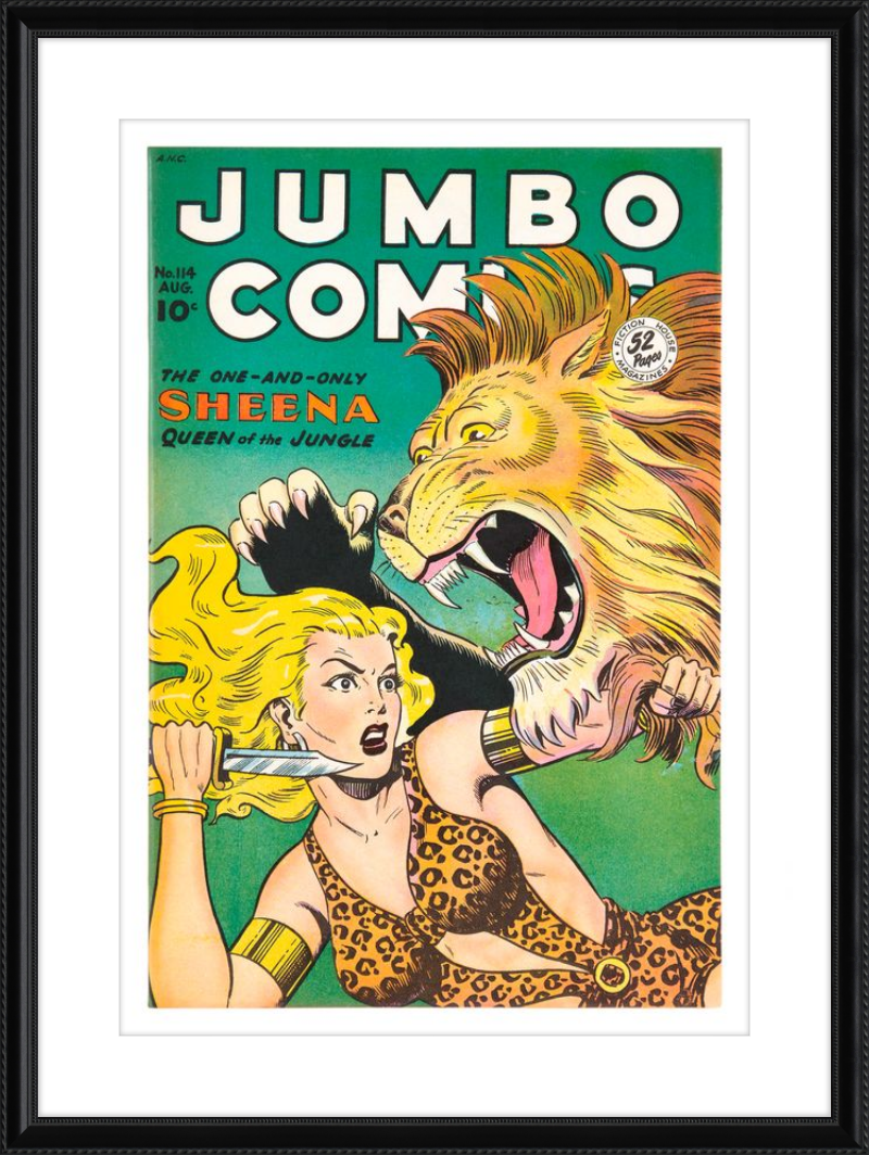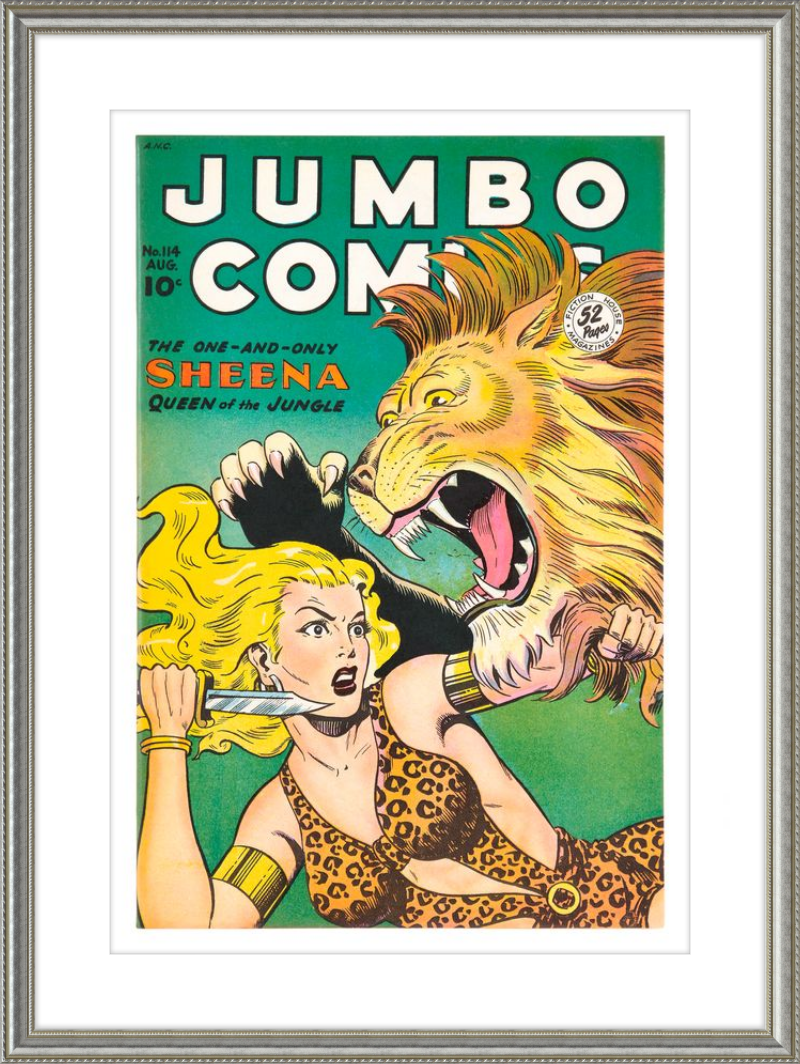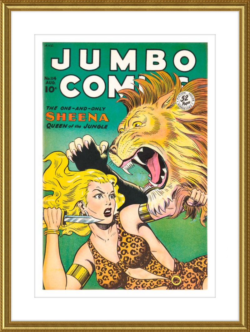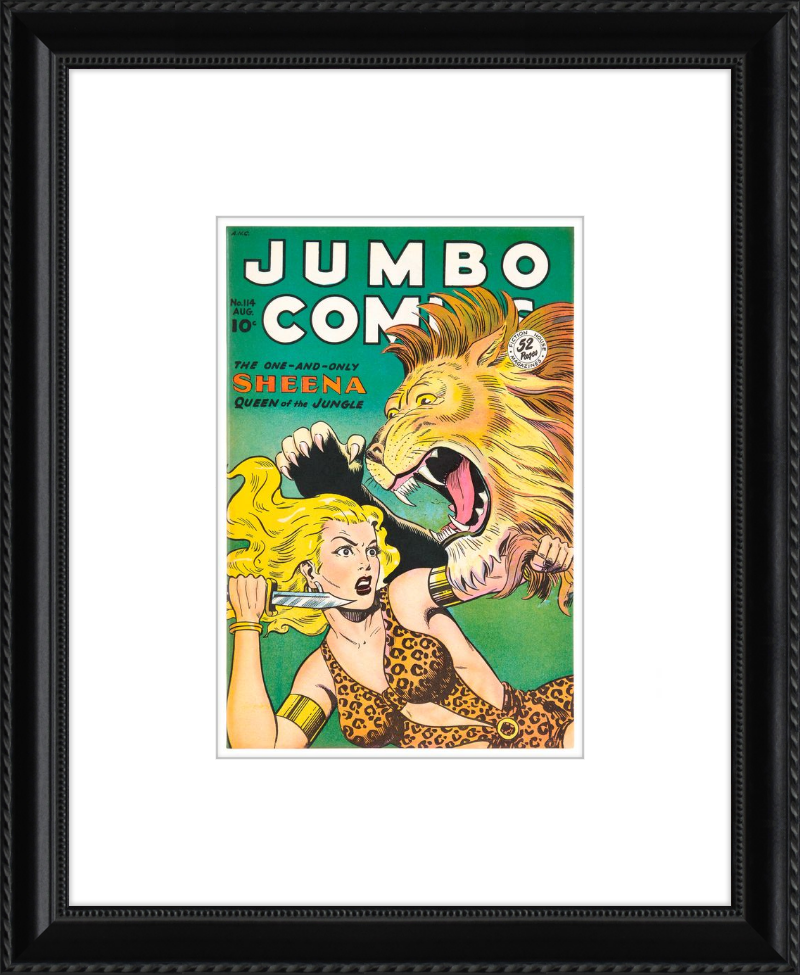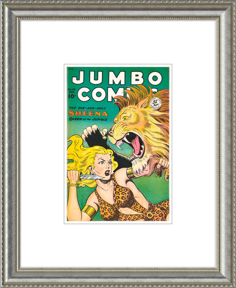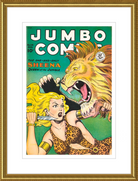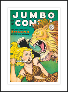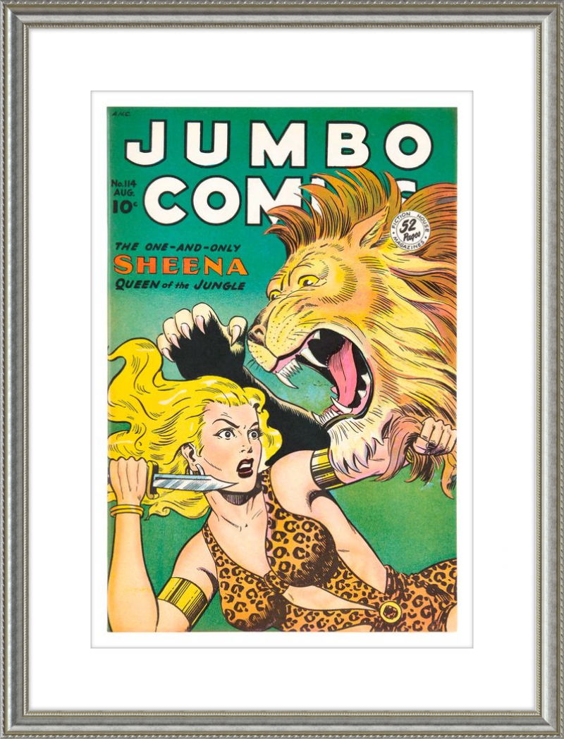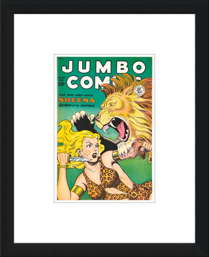 This August 1948 issue of Jumbo Comics showcases Sheena, Queen of the Jungle, in a dramatic encounter with a roaring lion, exemplifying the Golden Age's fascination with adventure and exoticism. Illustrated by Matt Baker, a pioneering African American artist celebrated for his dynamic compositions and expressive linework, the cover captures Sheena’s cultural significance as one of the earliest female action heroes in comics.