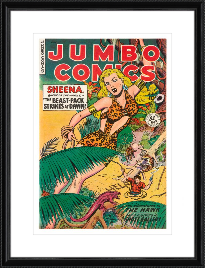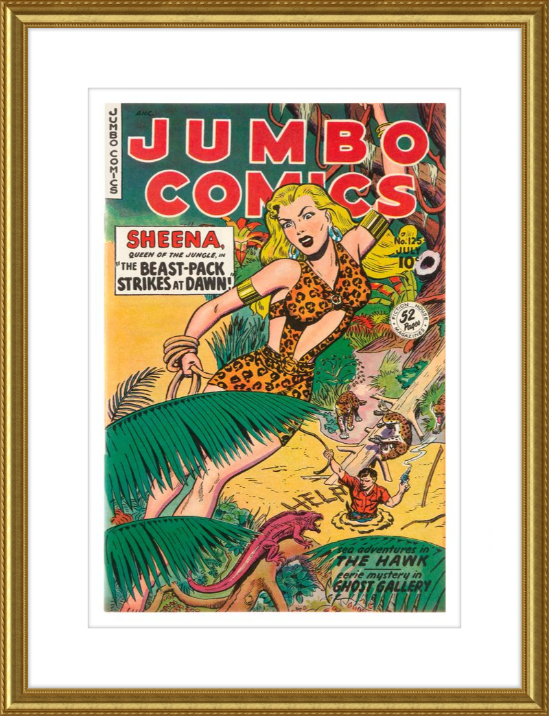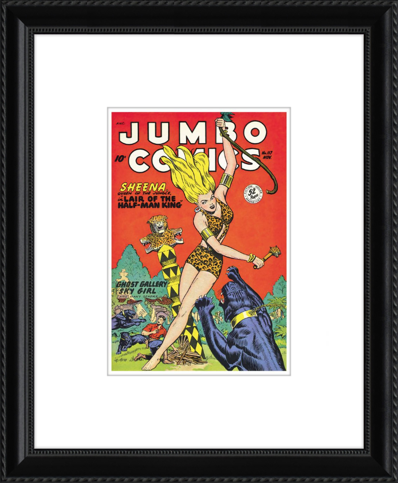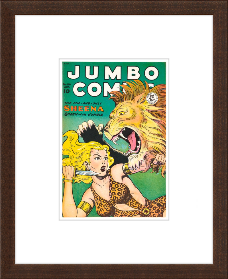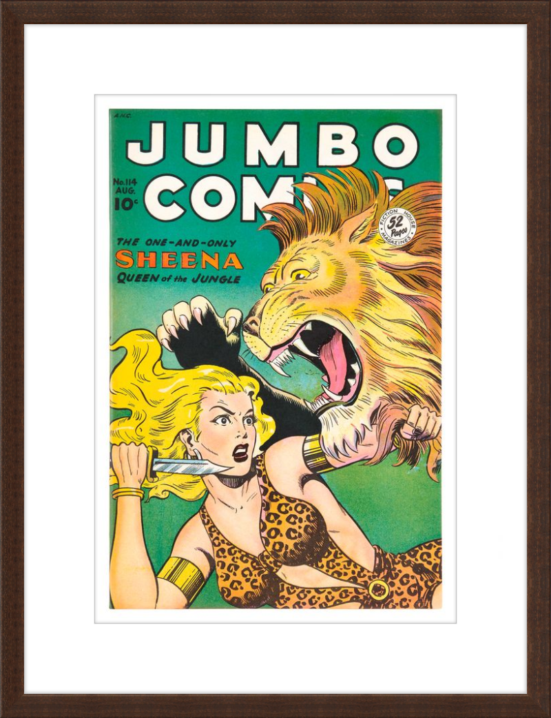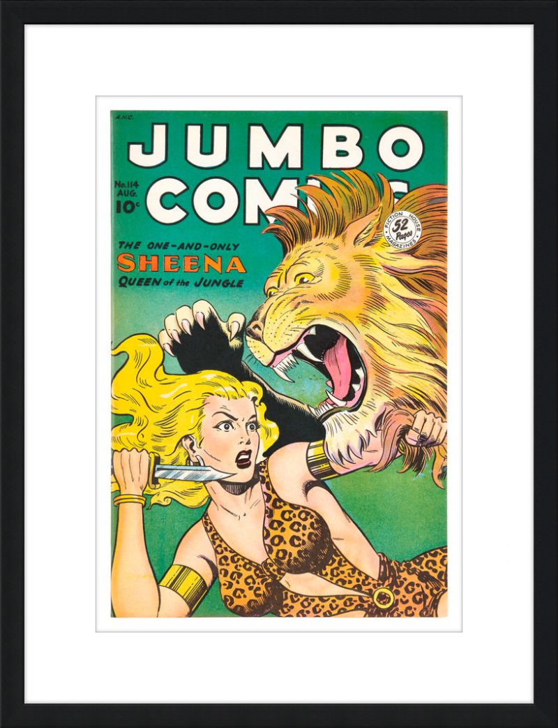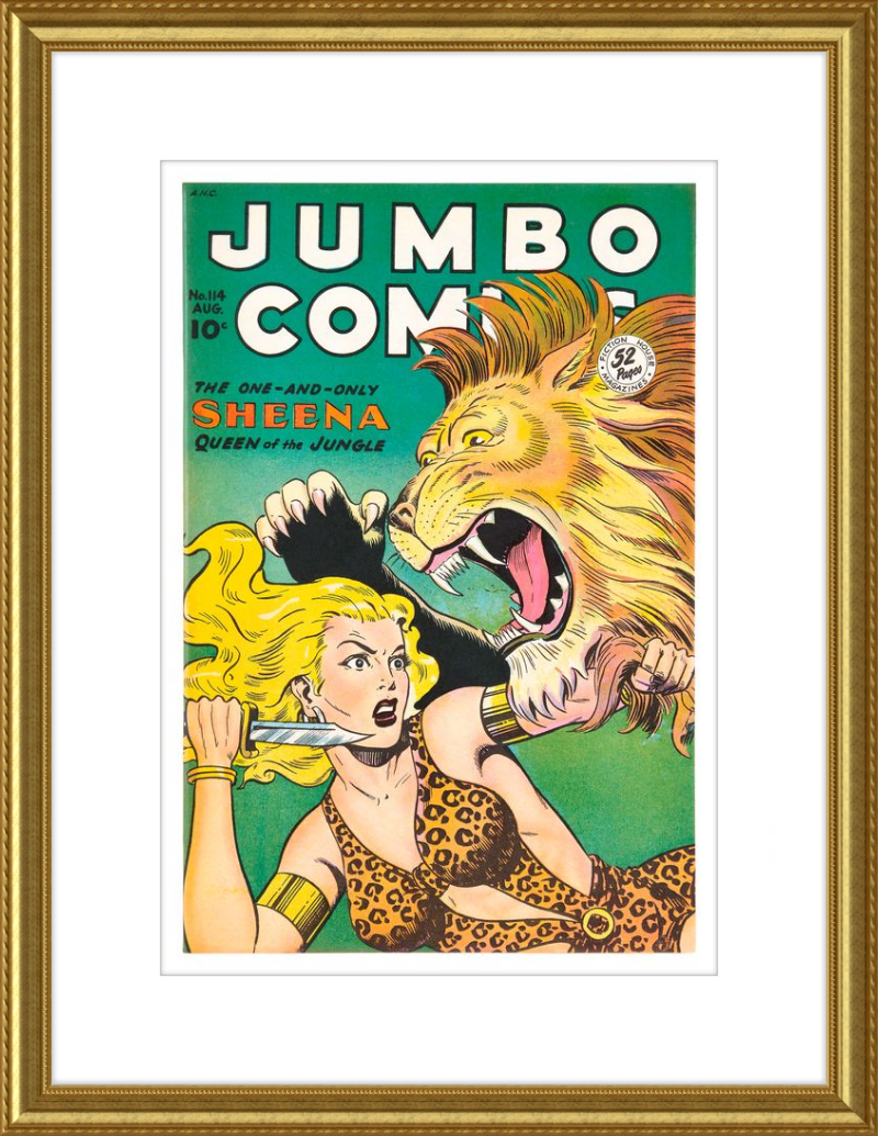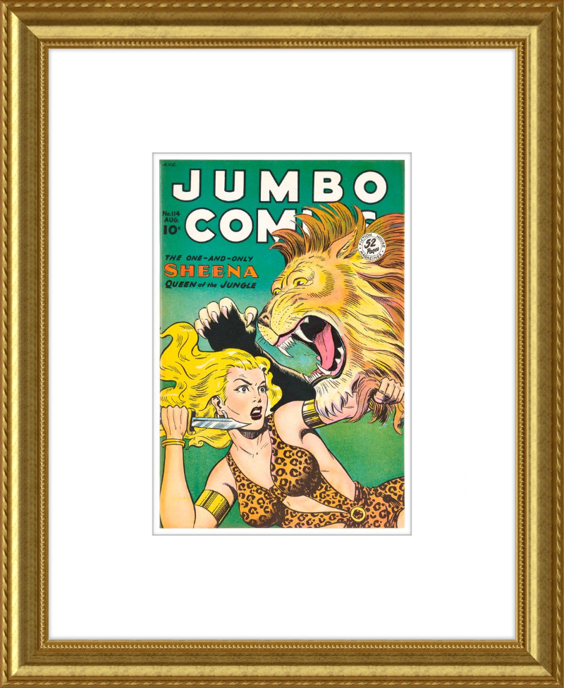 This August 1948 issue of Jumbo Comics showcases Sheena, Queen of the Jungle, in a dramatic encounter with a roaring lion, exemplifying the Golden Age's fascination with adventure and exoticism. Illustrated by Matt Baker, a pioneering African American artist celebrated for his dynamic compositions and expressive linework, the cover captures Sheena’s cultural significance as one of the earliest female action heroes in comics.