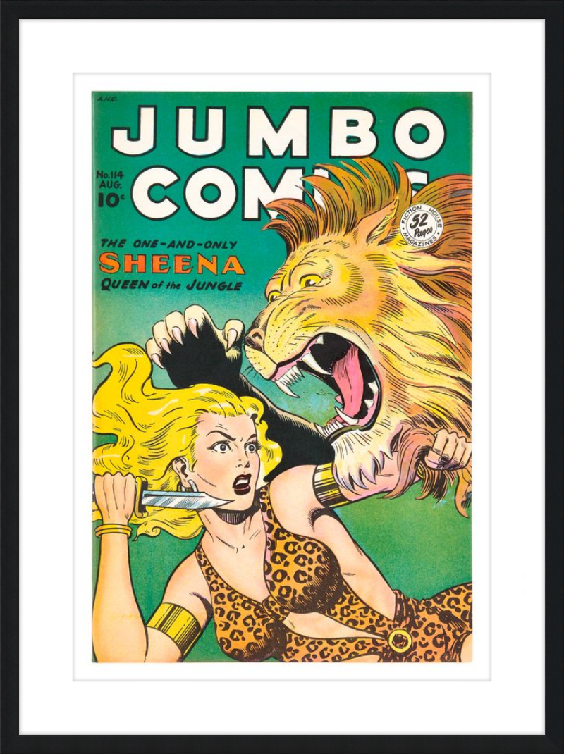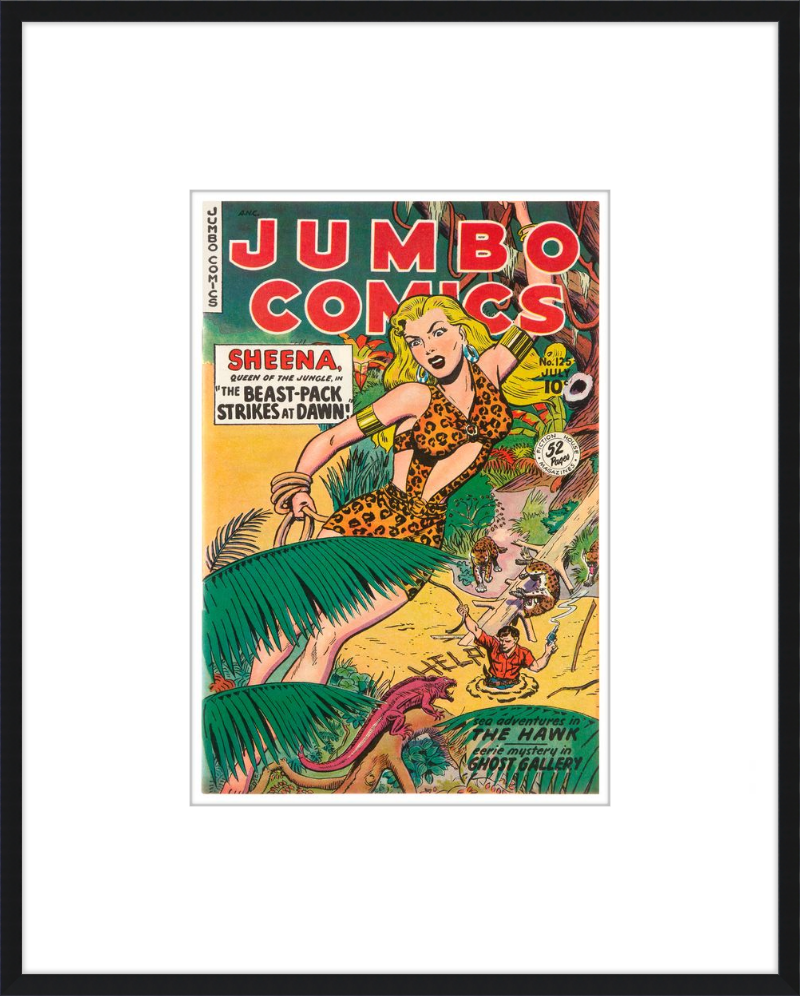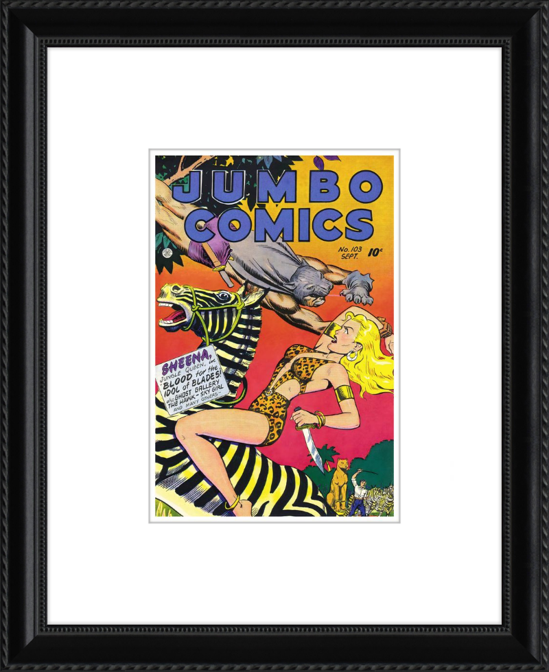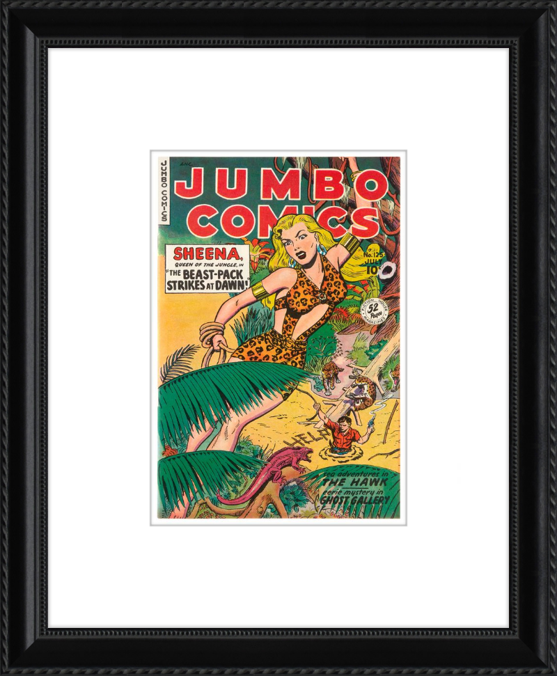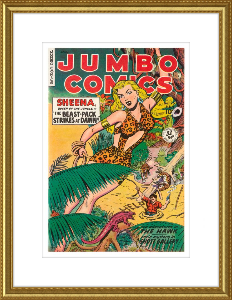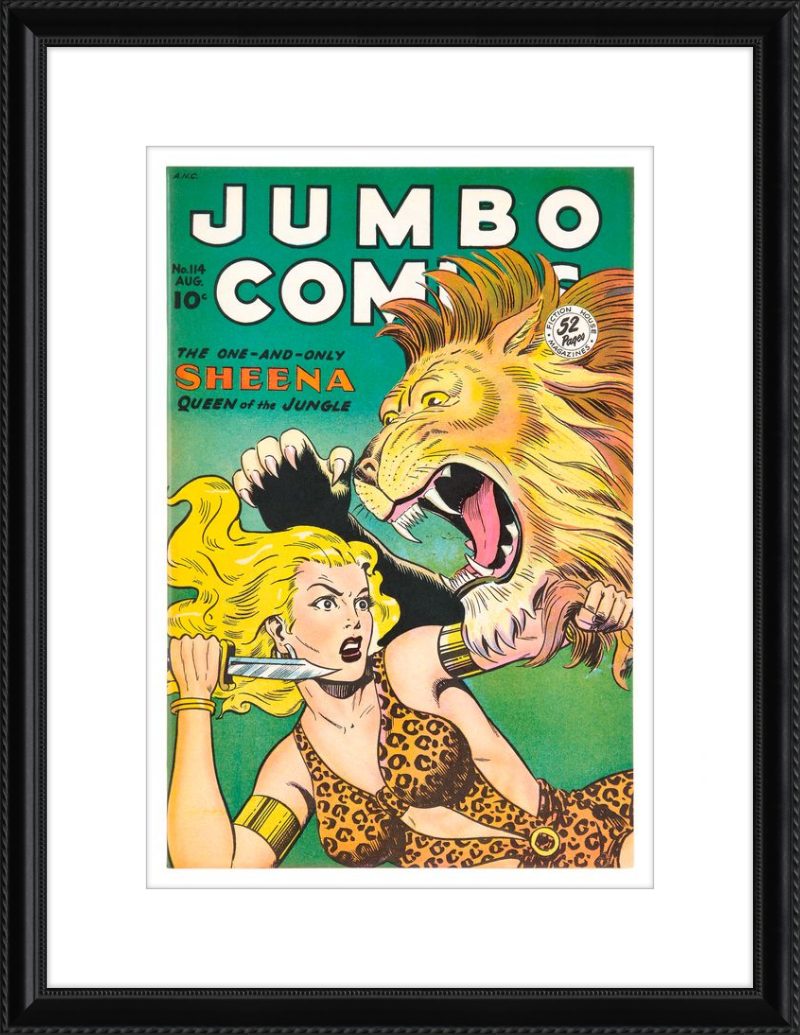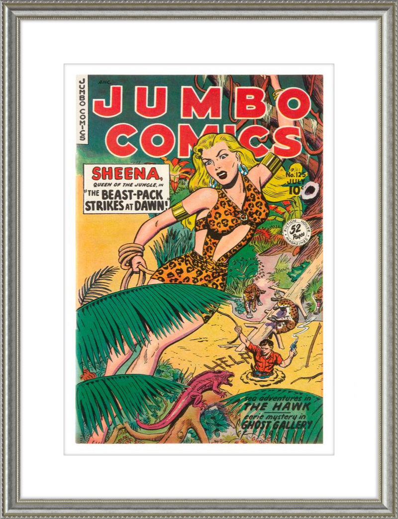 This August 1948 issue of Jumbo Comics showcases Sheena, Queen of the Jungle, in a dramatic encounter with a roaring lion, exemplifying the Golden Age's fascination with adventure and exoticism. Illustrated by Matt Baker, a pioneering African American artist celebrated for his dynamic compositions and expressive linework, the cover captures Sheena’s cultural significance as one of the earliest female action heroes in comics.