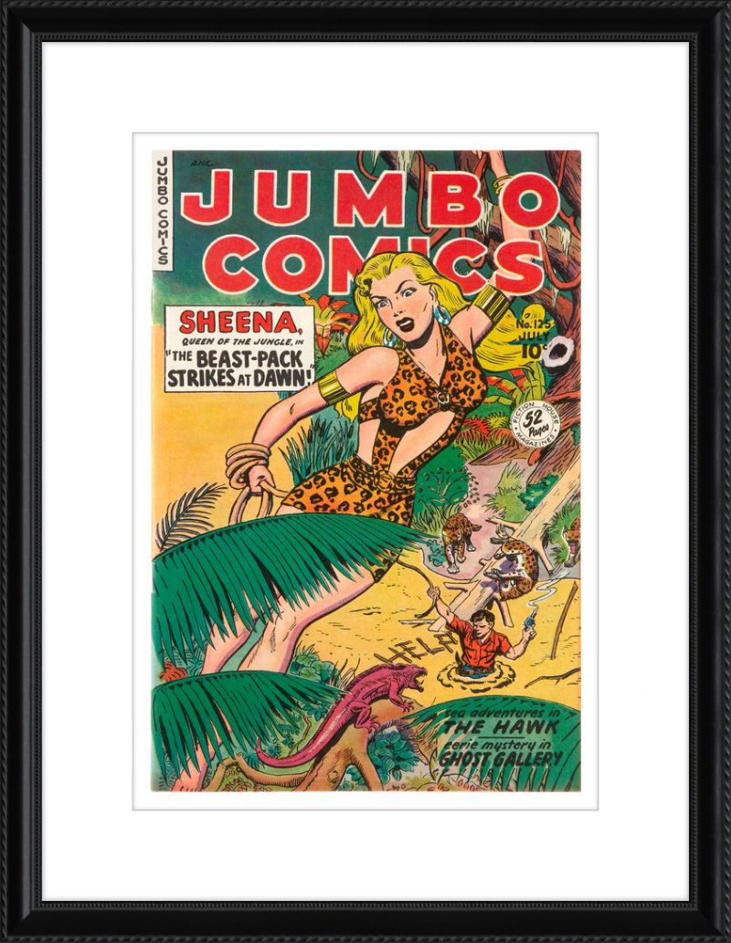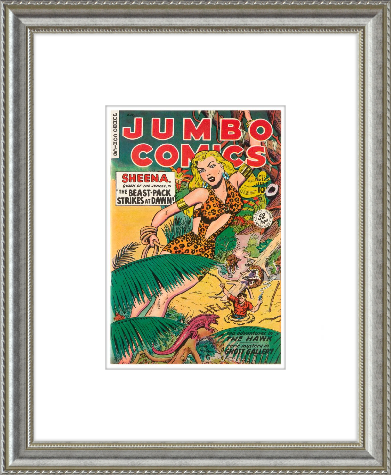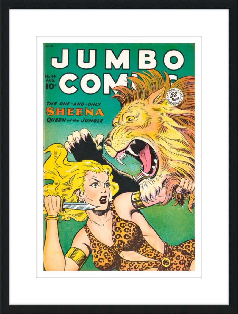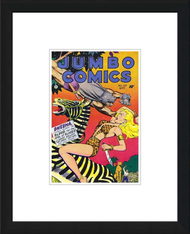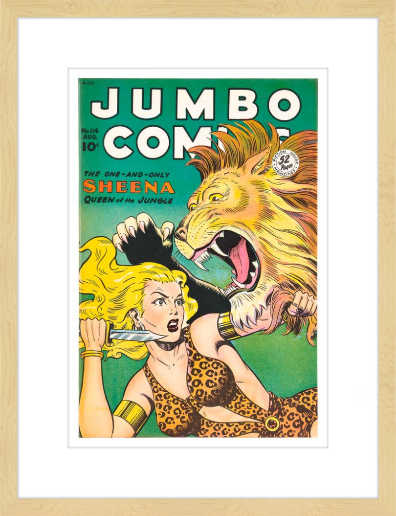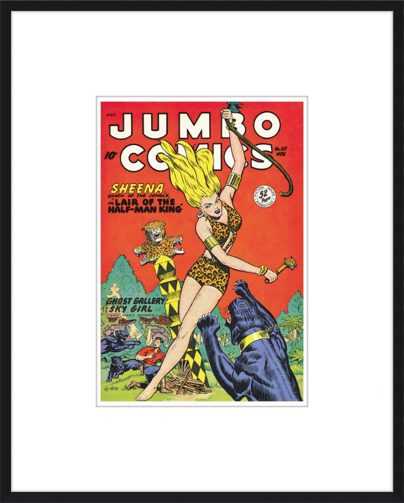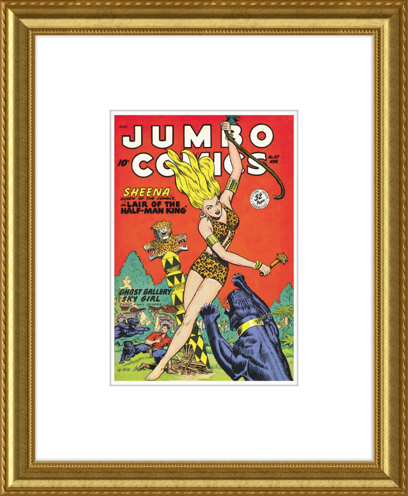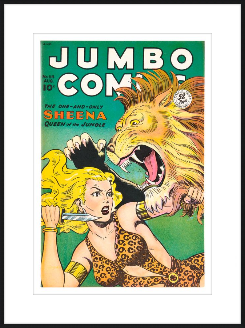This August 1948 issue of Jumbo Comics showcases Sheena, Queen of the Jungle, in a dramatic encounter with a roaring lion, exemplifying the Golden Age's fascination with adventure and exoticism. Illustrated by Matt Baker, a pioneering African American artist celebrated for his dynamic compositions and expressive linework, the cover captures Sheena’s cultural significance as one of the earliest female action heroes in comics.