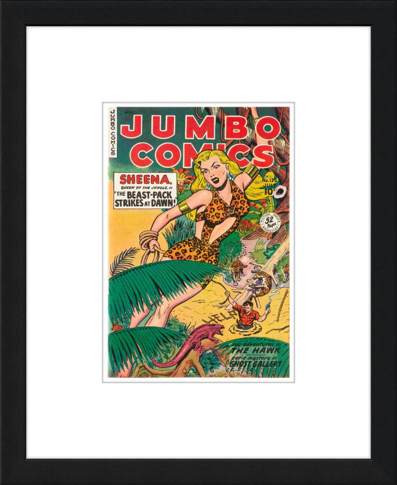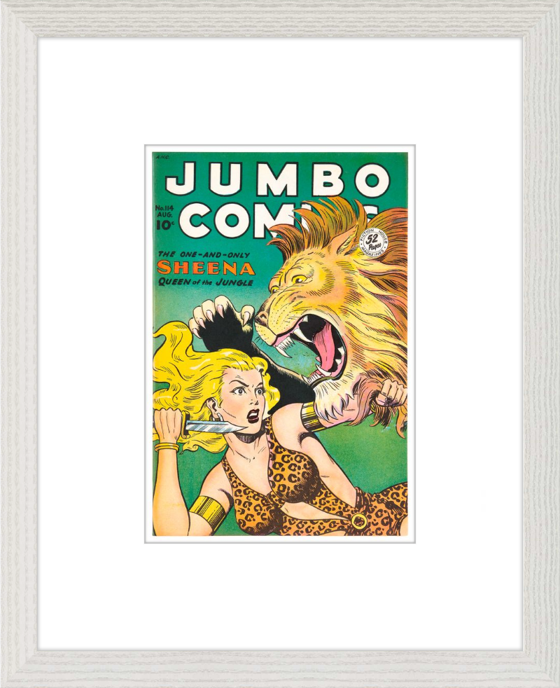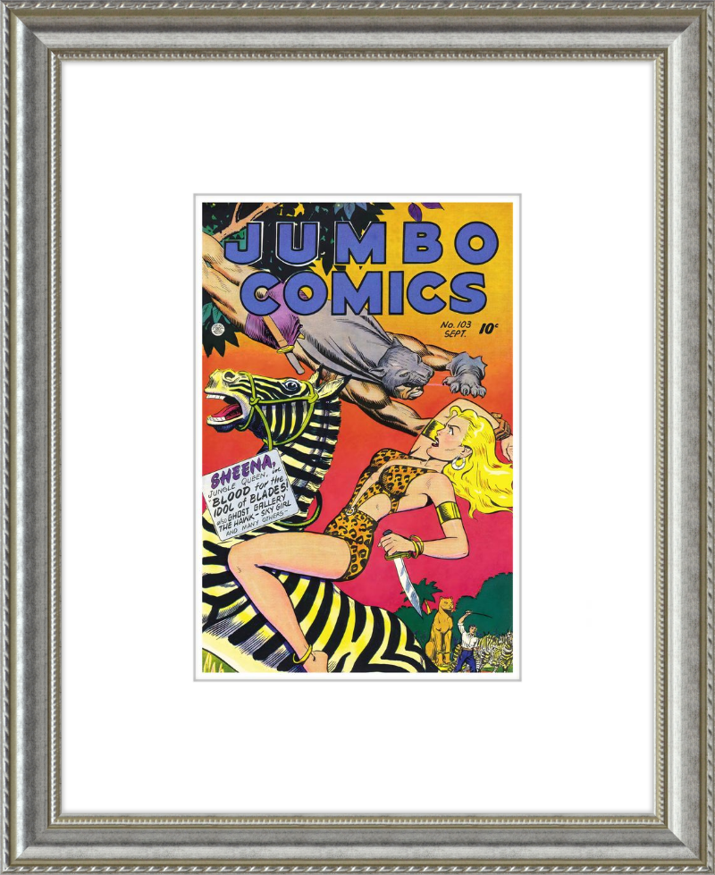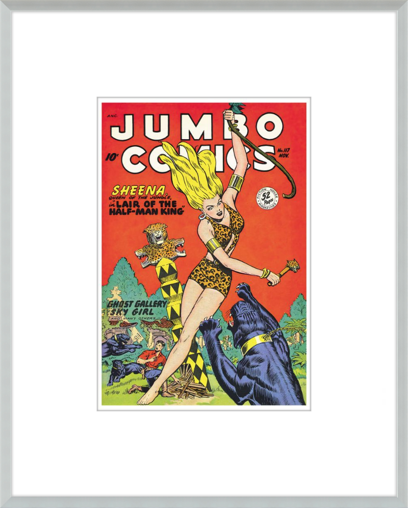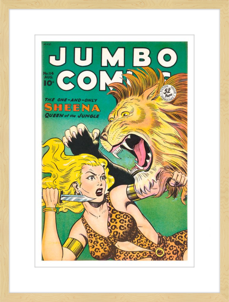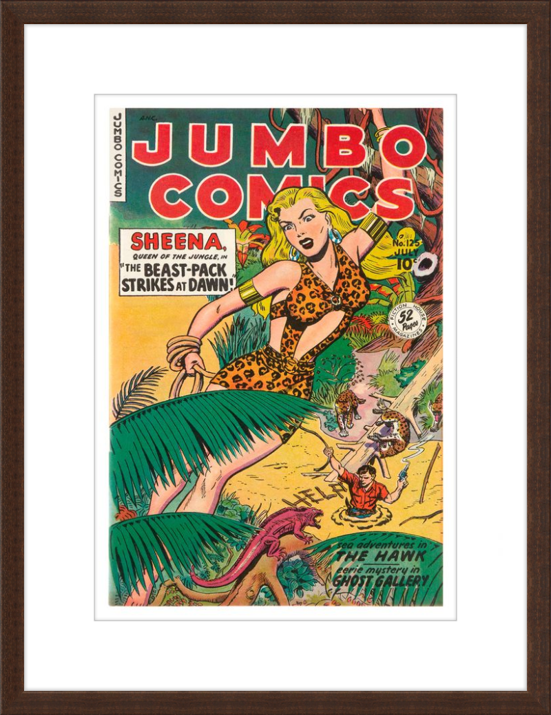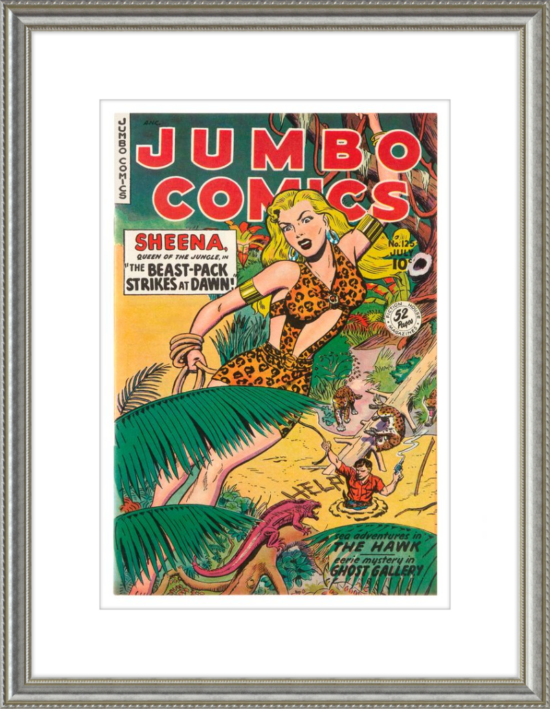 This August 1948 issue of Jumbo Comics showcases Sheena, Queen of the Jungle, in a dramatic encounter with a roaring lion, exemplifying the Golden Age's fascination with adventure and exoticism. Illustrated by Matt Baker, a pioneering African American artist celebrated for his dynamic compositions and expressive linework, the cover captures Sheena’s cultural significance as one of the earliest female action heroes in comics.