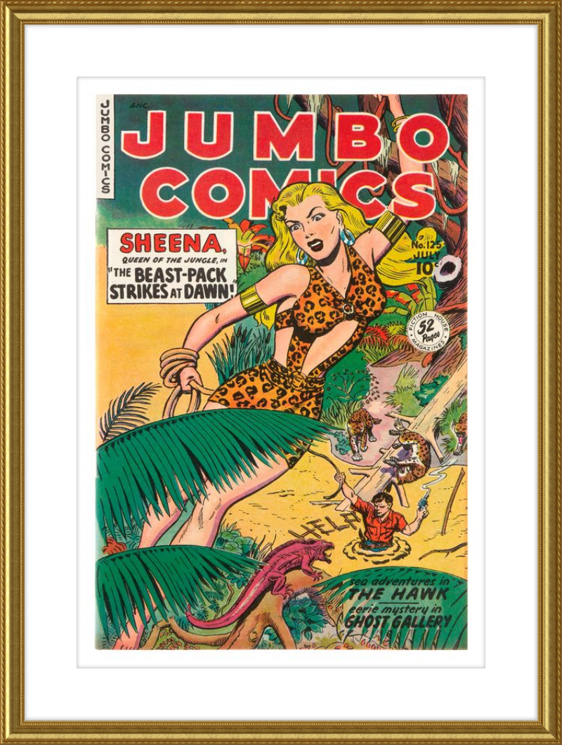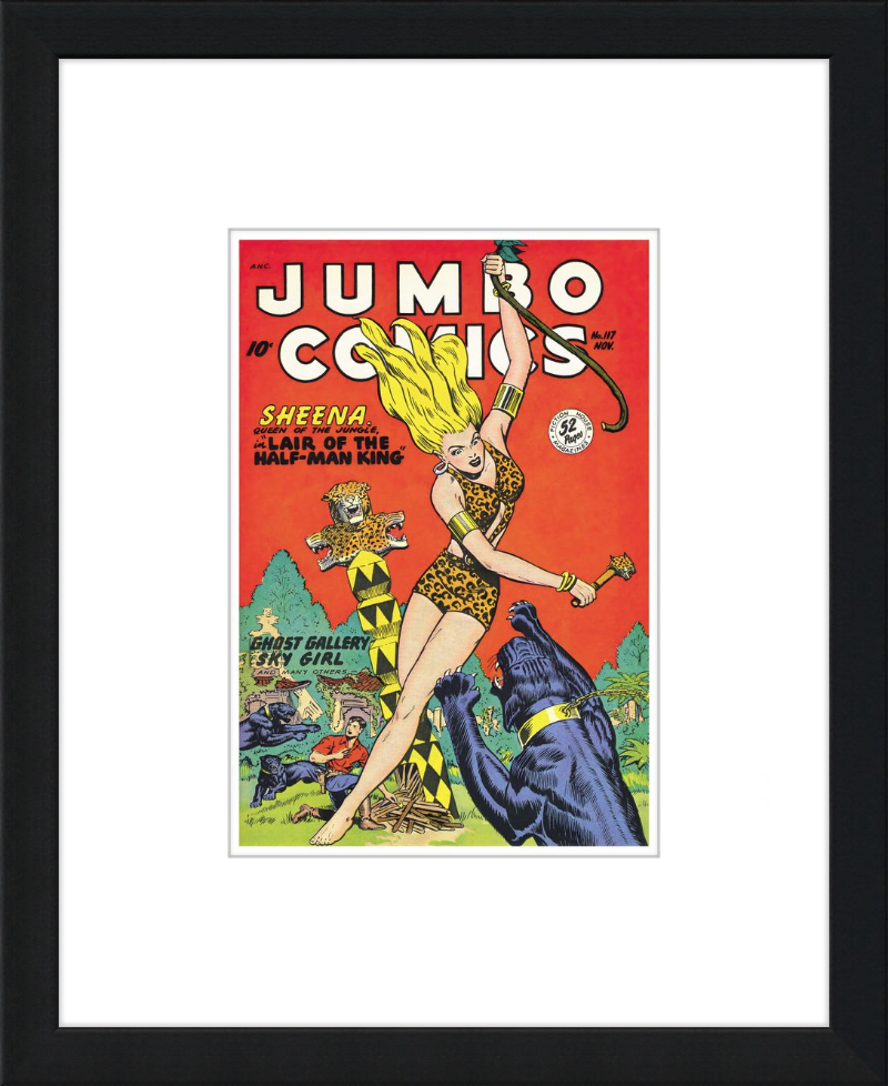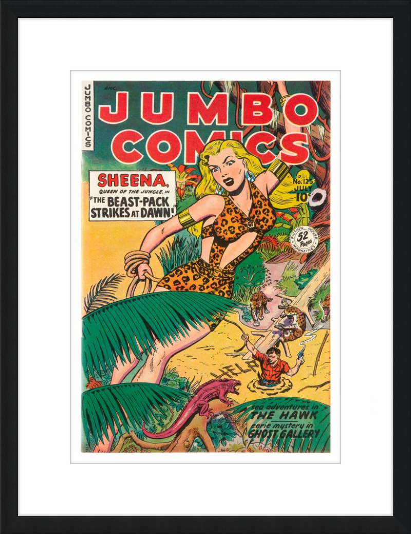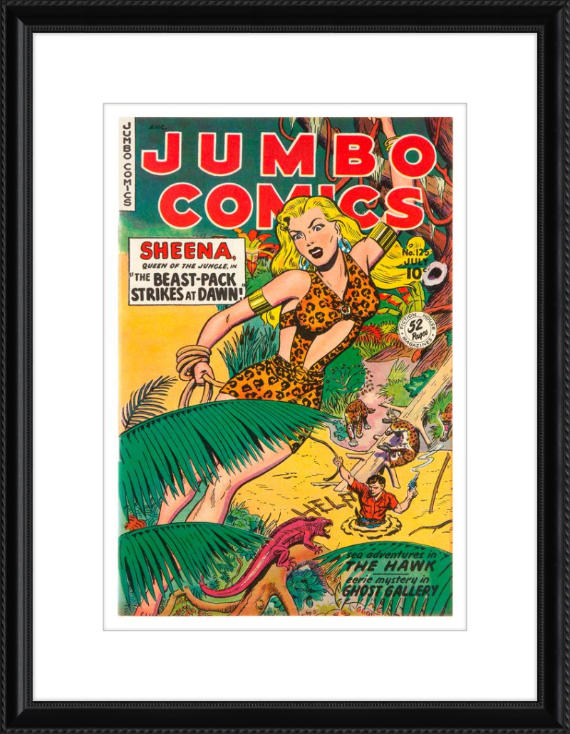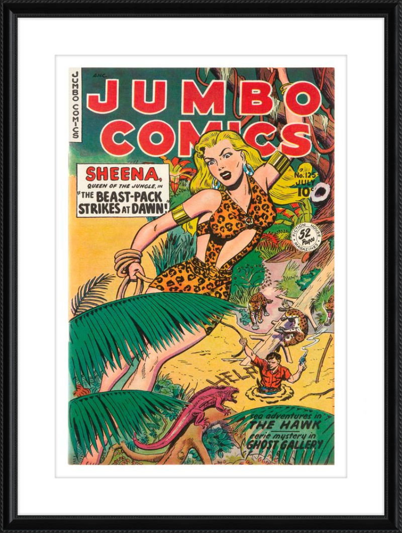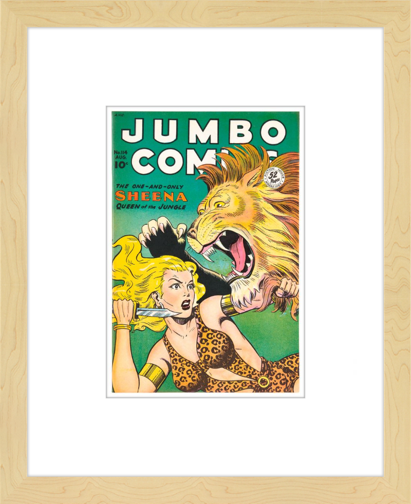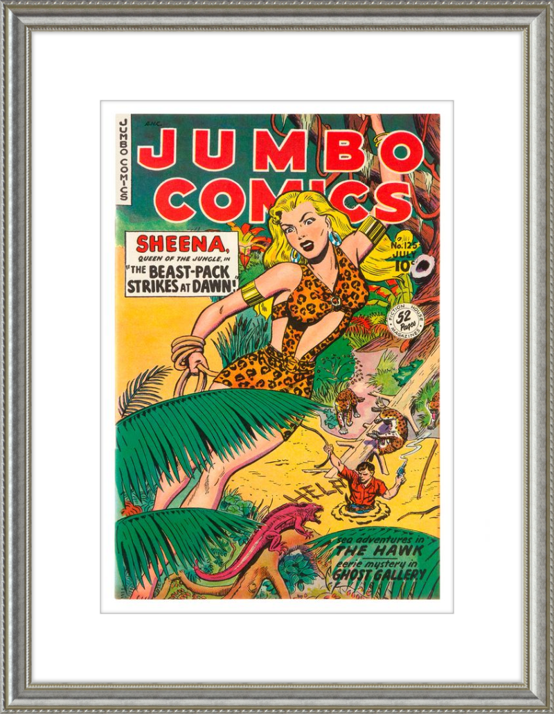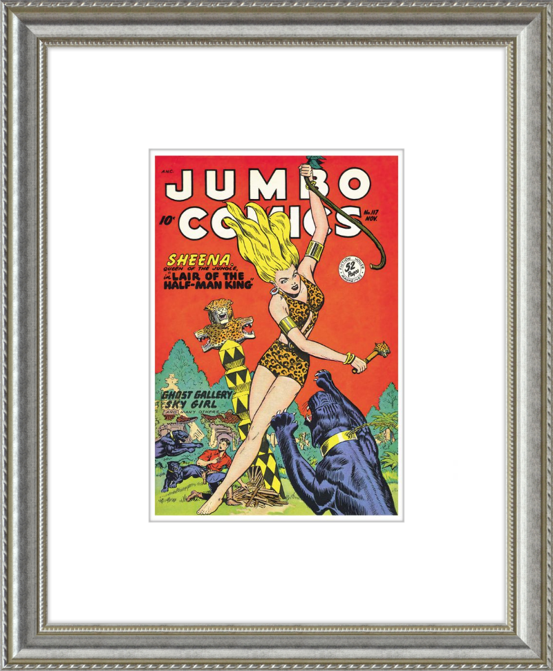 This August 1948 issue of Jumbo Comics showcases Sheena, Queen of the Jungle, in a dramatic encounter with a roaring lion, exemplifying the Golden Age's fascination with adventure and exoticism. Illustrated by Matt Baker, a pioneering African American artist celebrated for his dynamic compositions and expressive linework, the cover captures Sheena’s cultural significance as one of the earliest female action heroes in comics.