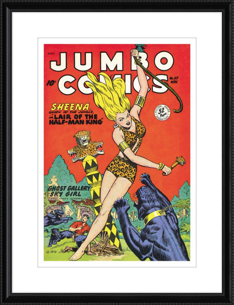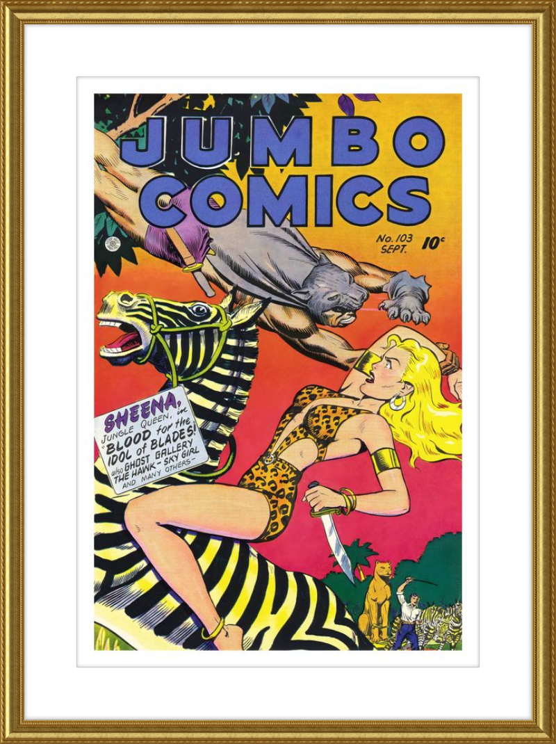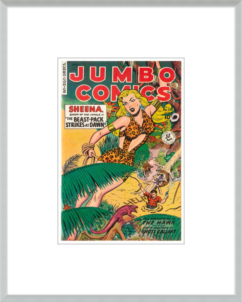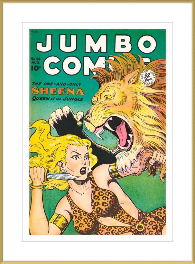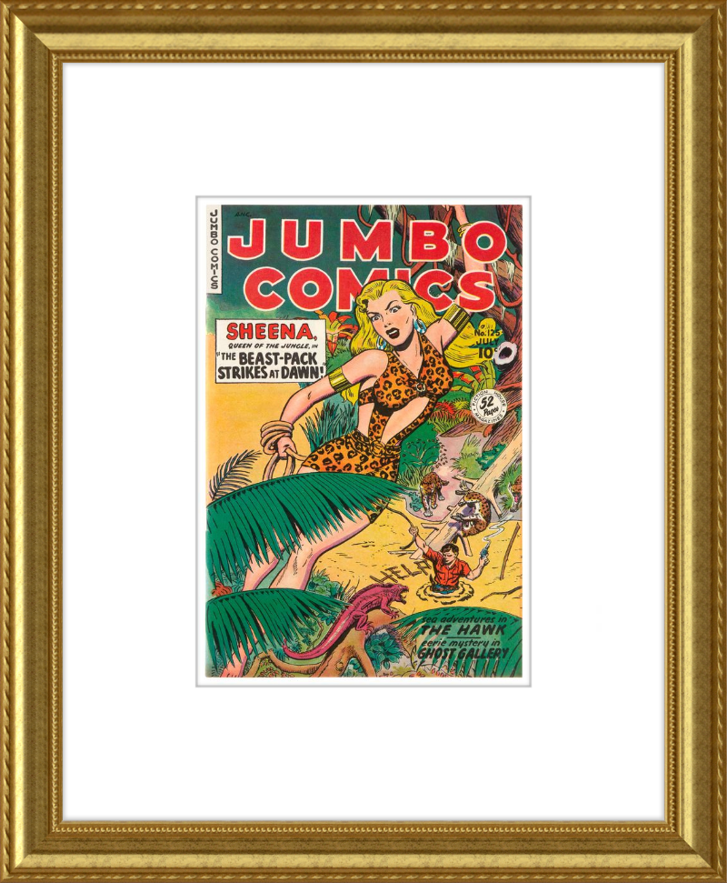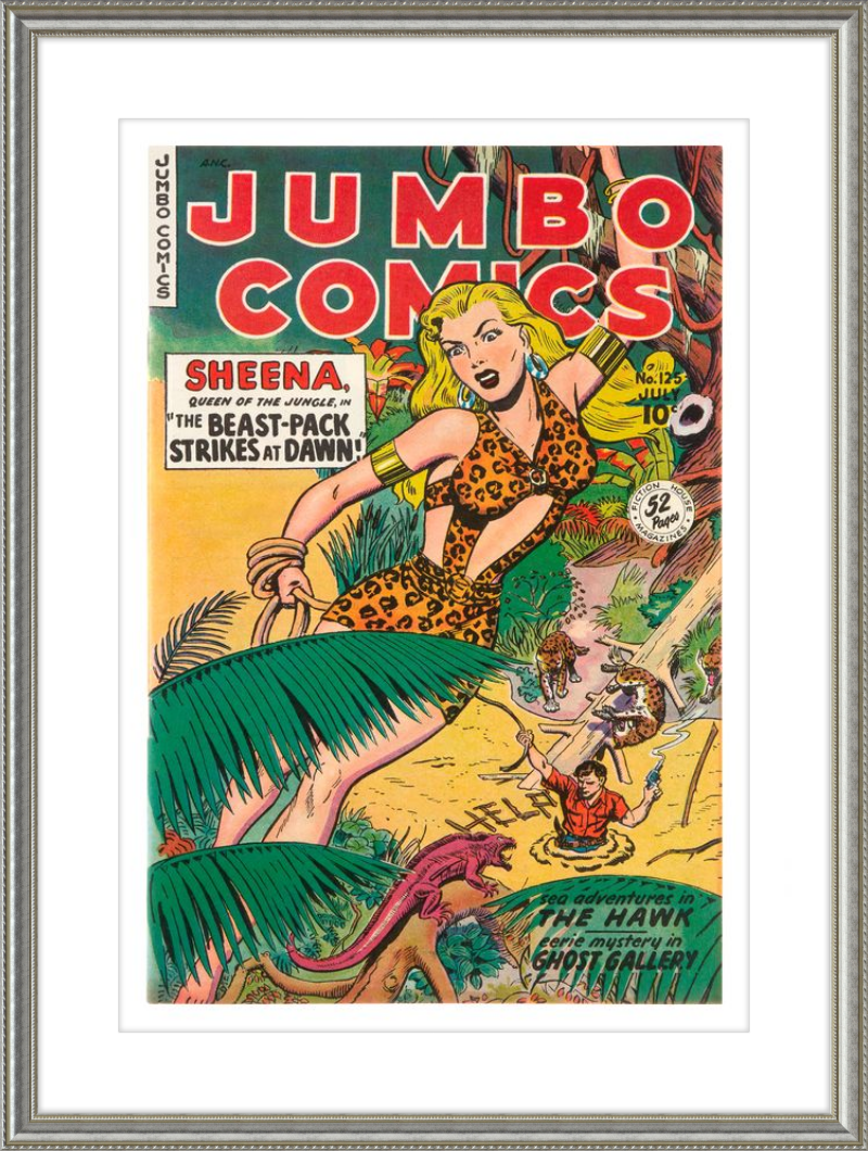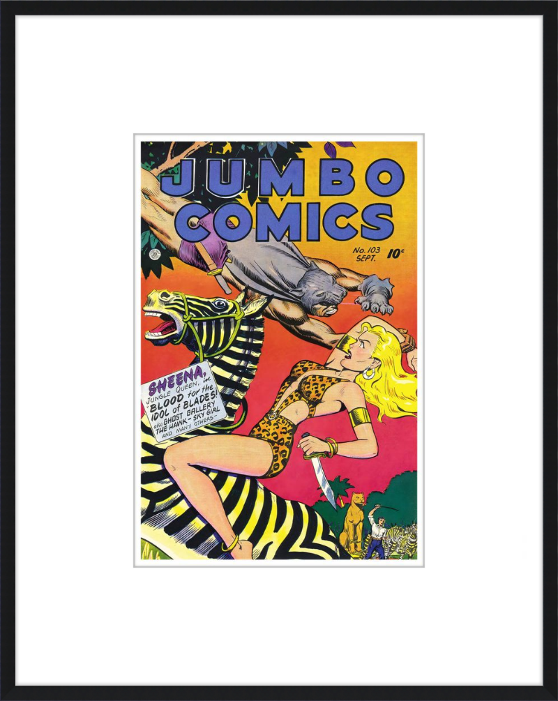 This August 1948 issue of Jumbo Comics showcases Sheena, Queen of the Jungle, in a dramatic encounter with a roaring lion, exemplifying the Golden Age's fascination with adventure and exoticism. Illustrated by Matt Baker, a pioneering African American artist celebrated for his dynamic compositions and expressive linework, the cover captures Sheena’s cultural significance as one of the earliest female action heroes in comics.