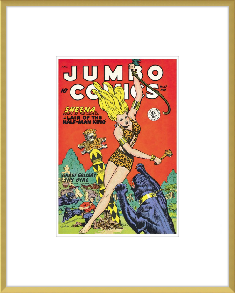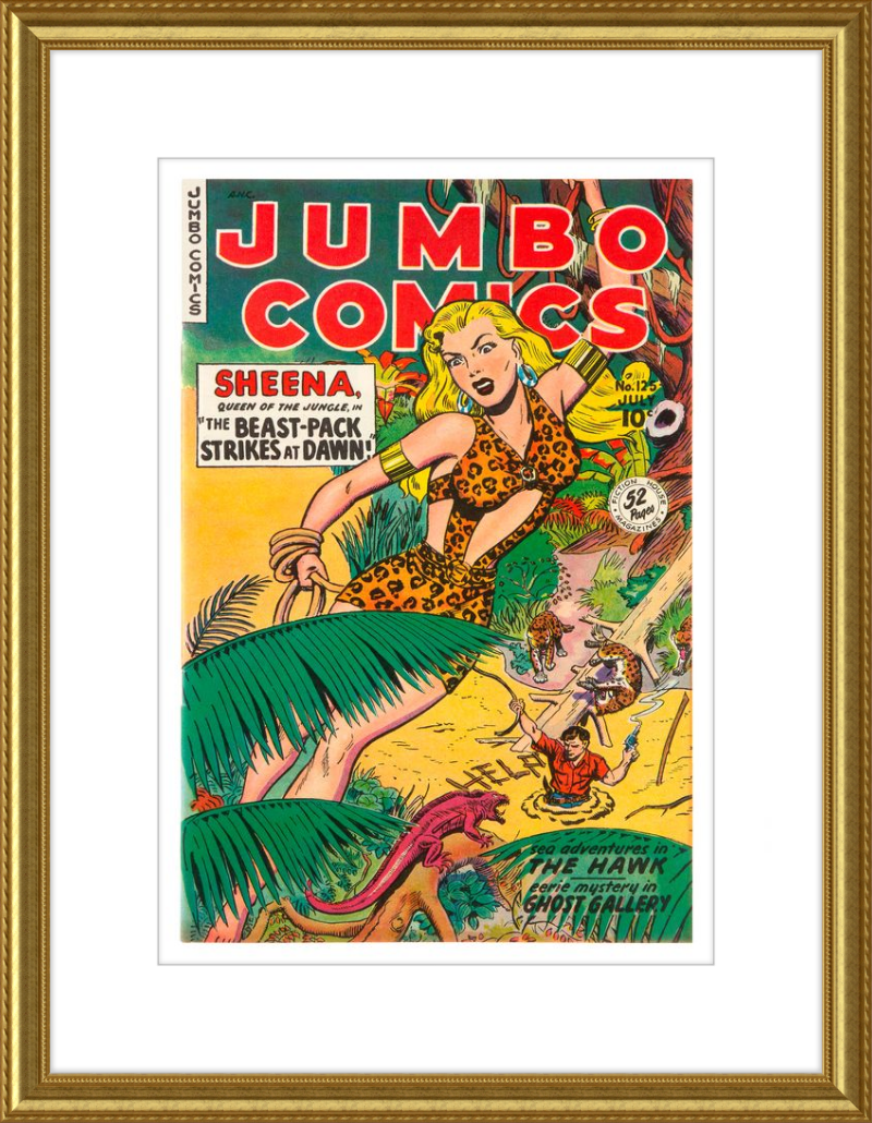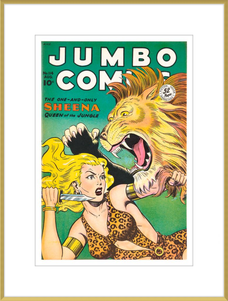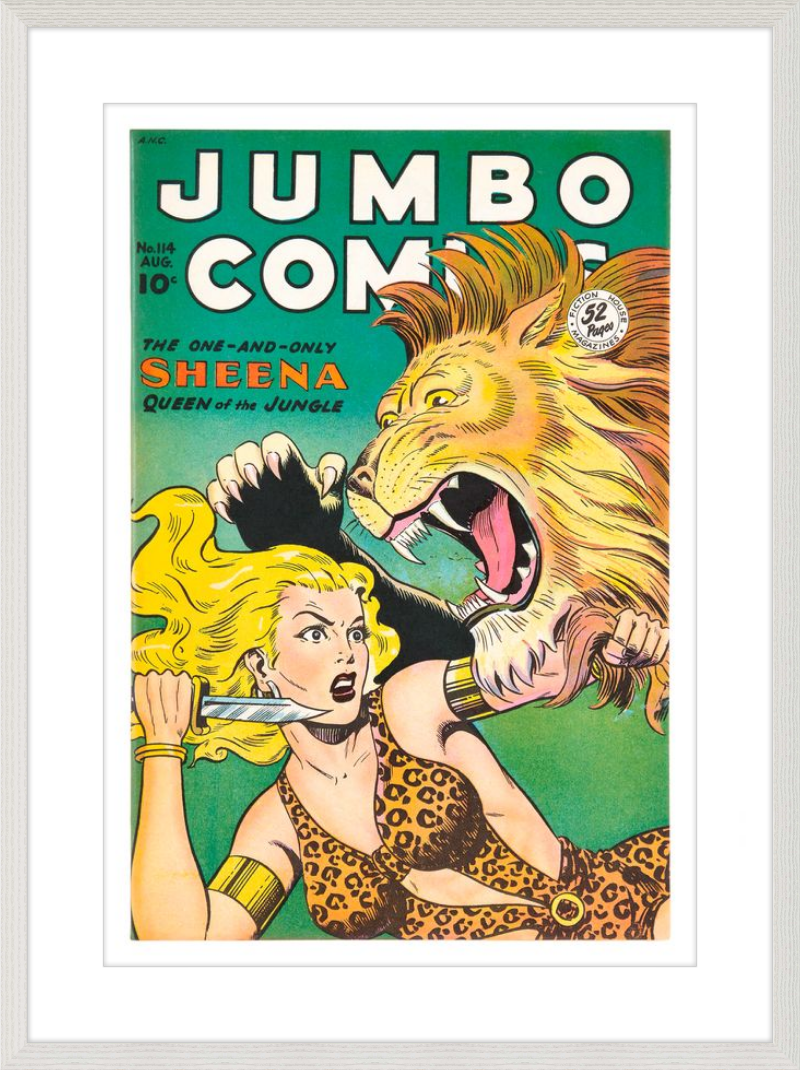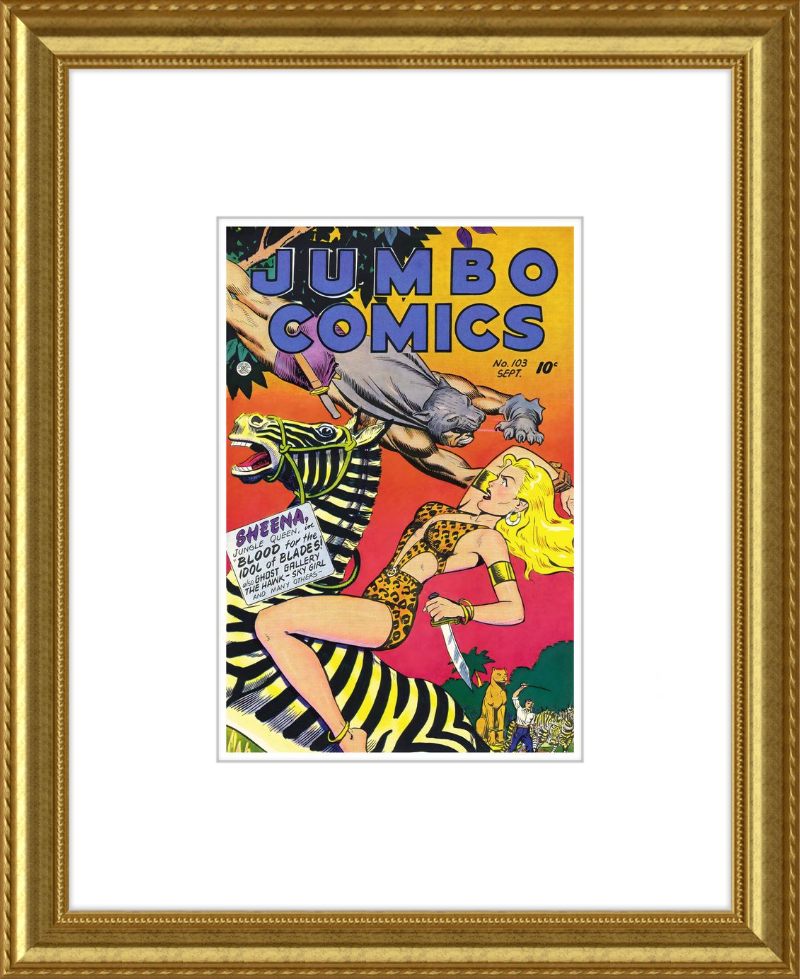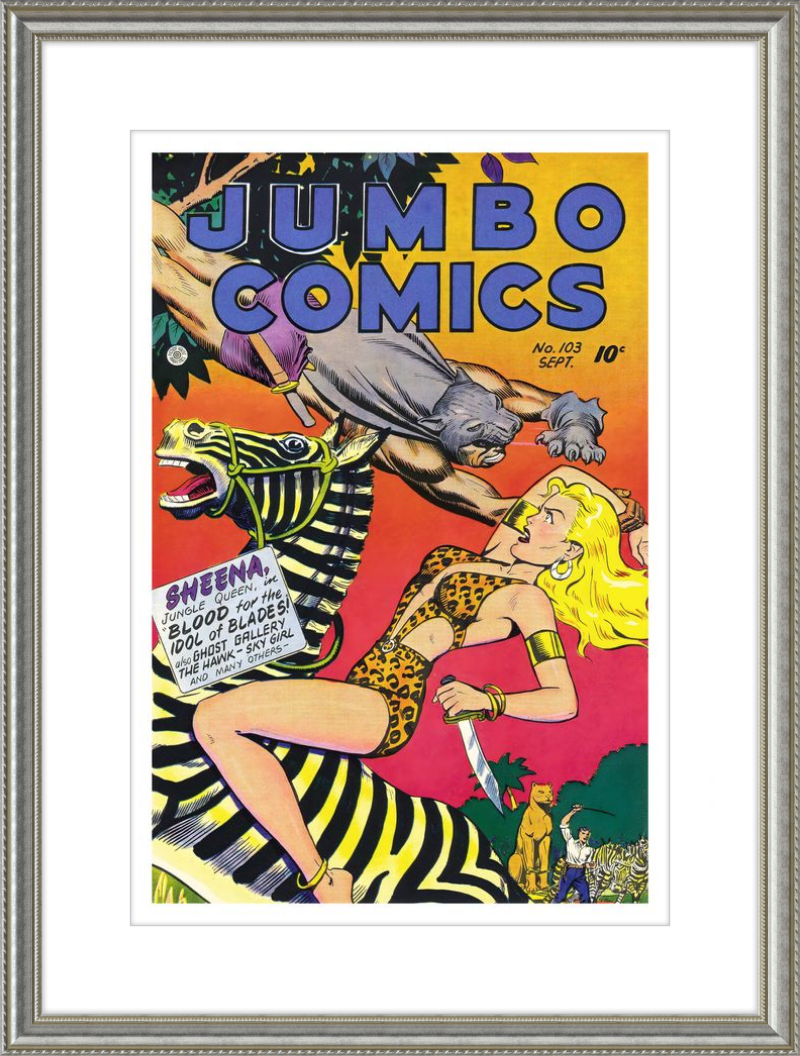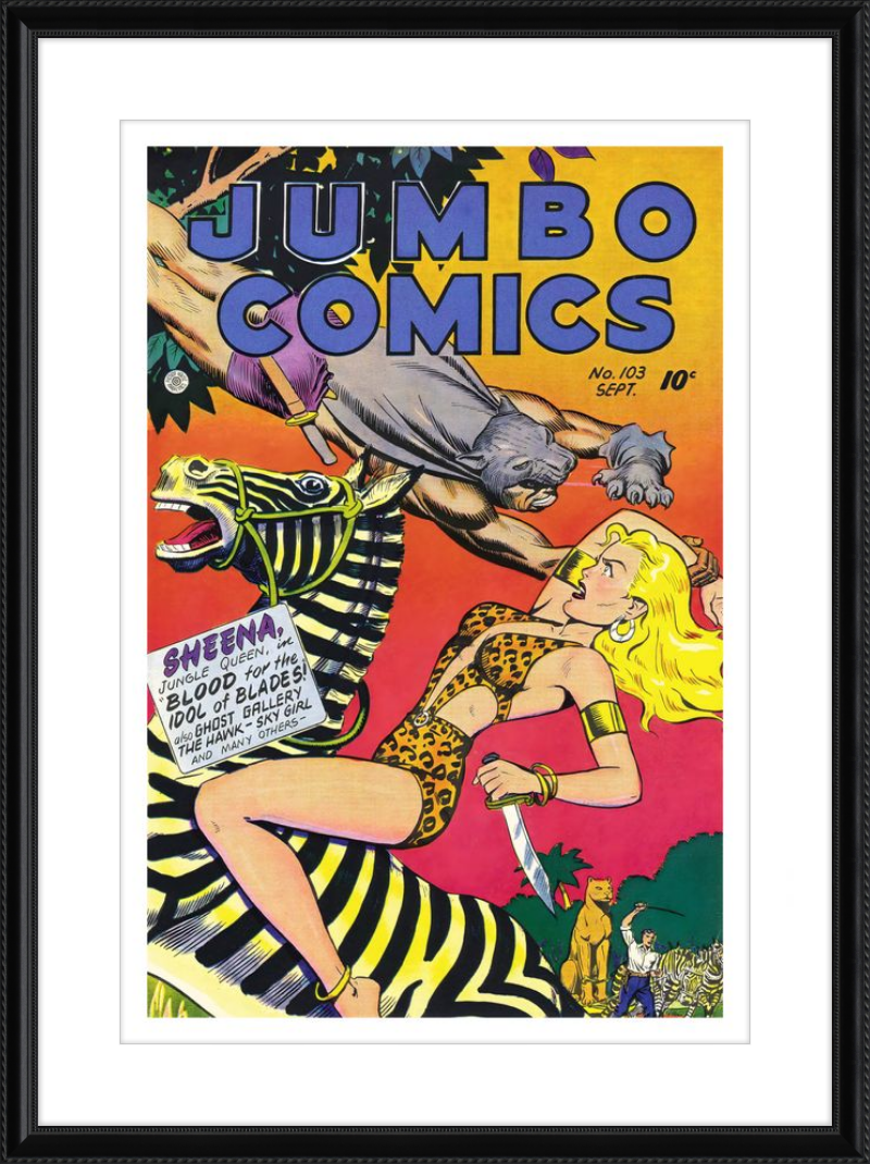 This August 1948 issue of Jumbo Comics showcases Sheena, Queen of the Jungle, in a dramatic encounter with a roaring lion, exemplifying the Golden Age's fascination with adventure and exoticism. Illustrated by Matt Baker, a pioneering African American artist celebrated for his dynamic compositions and expressive linework, the cover captures Sheena’s cultural significance as one of the earliest female action heroes in comics.