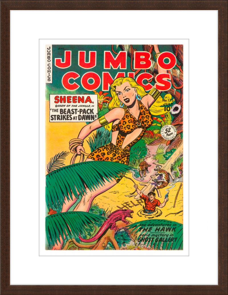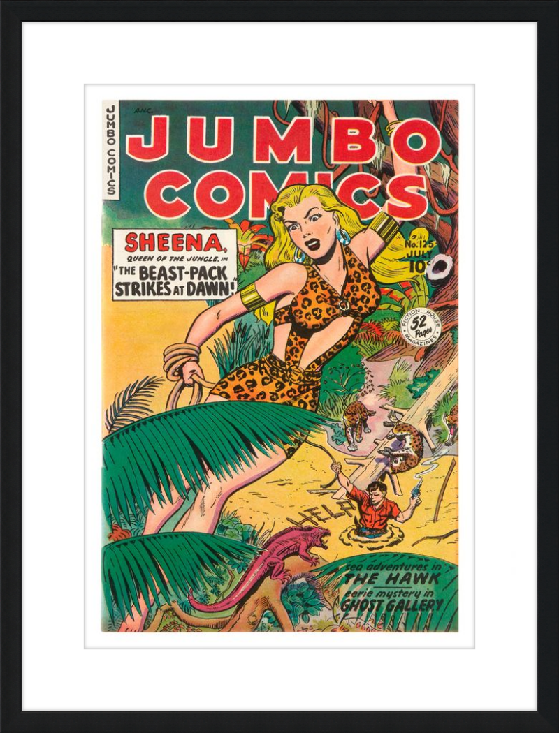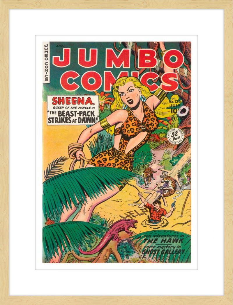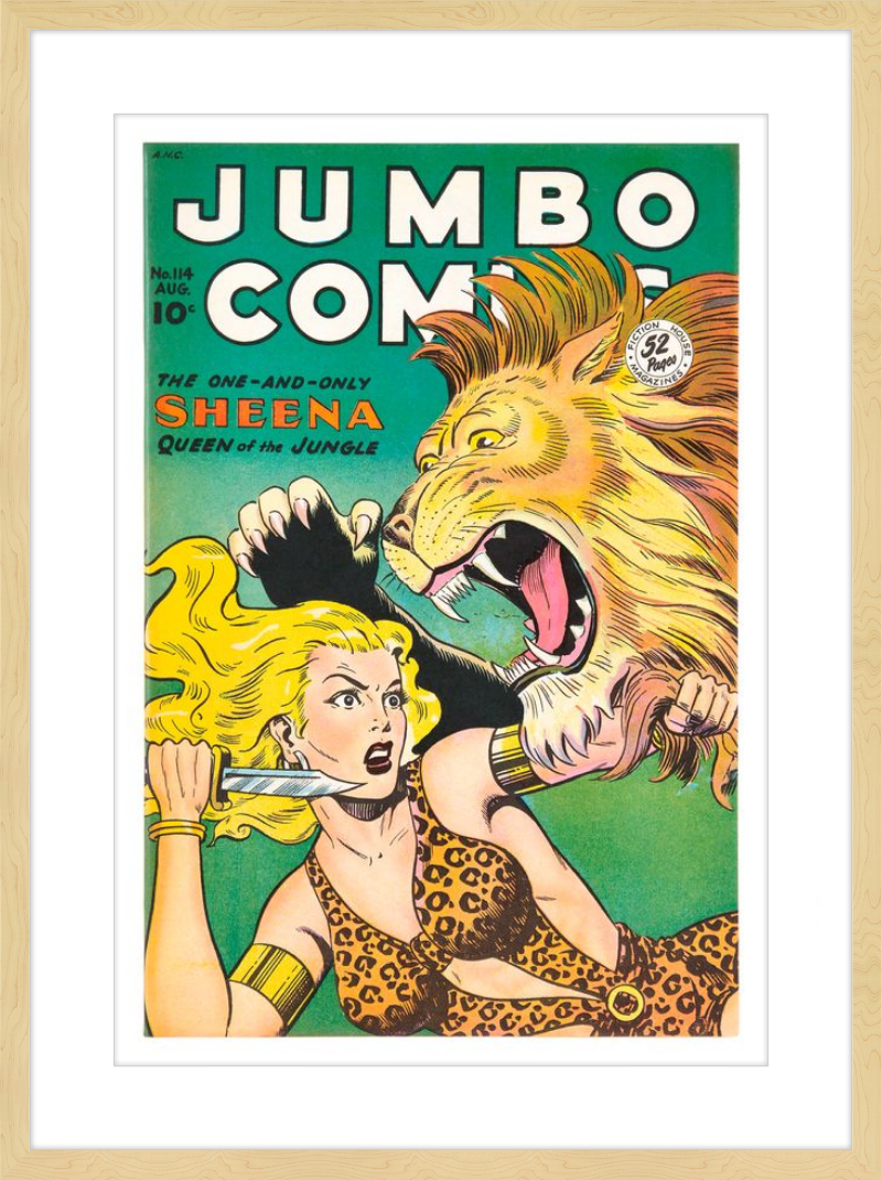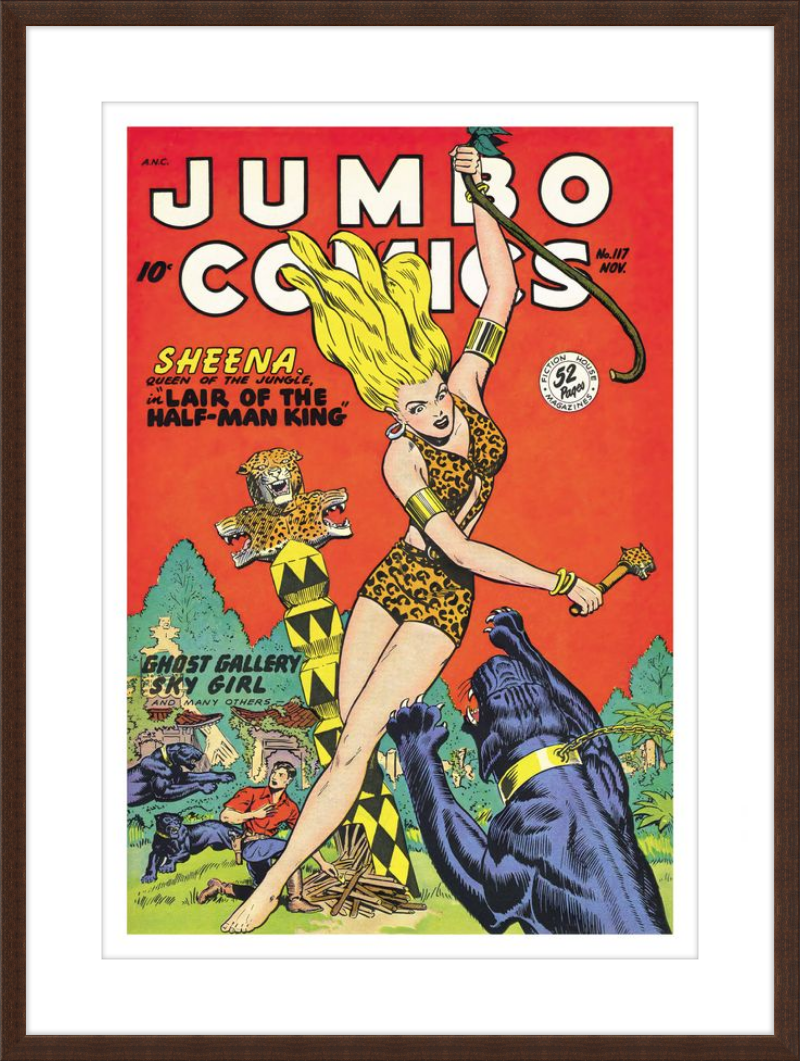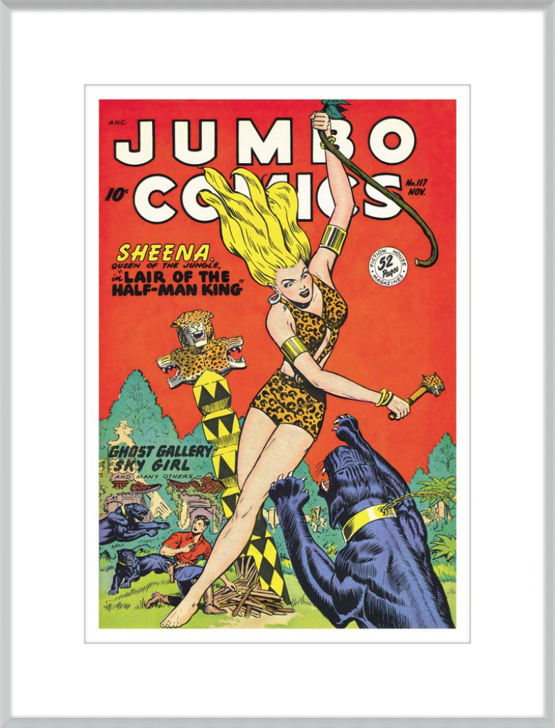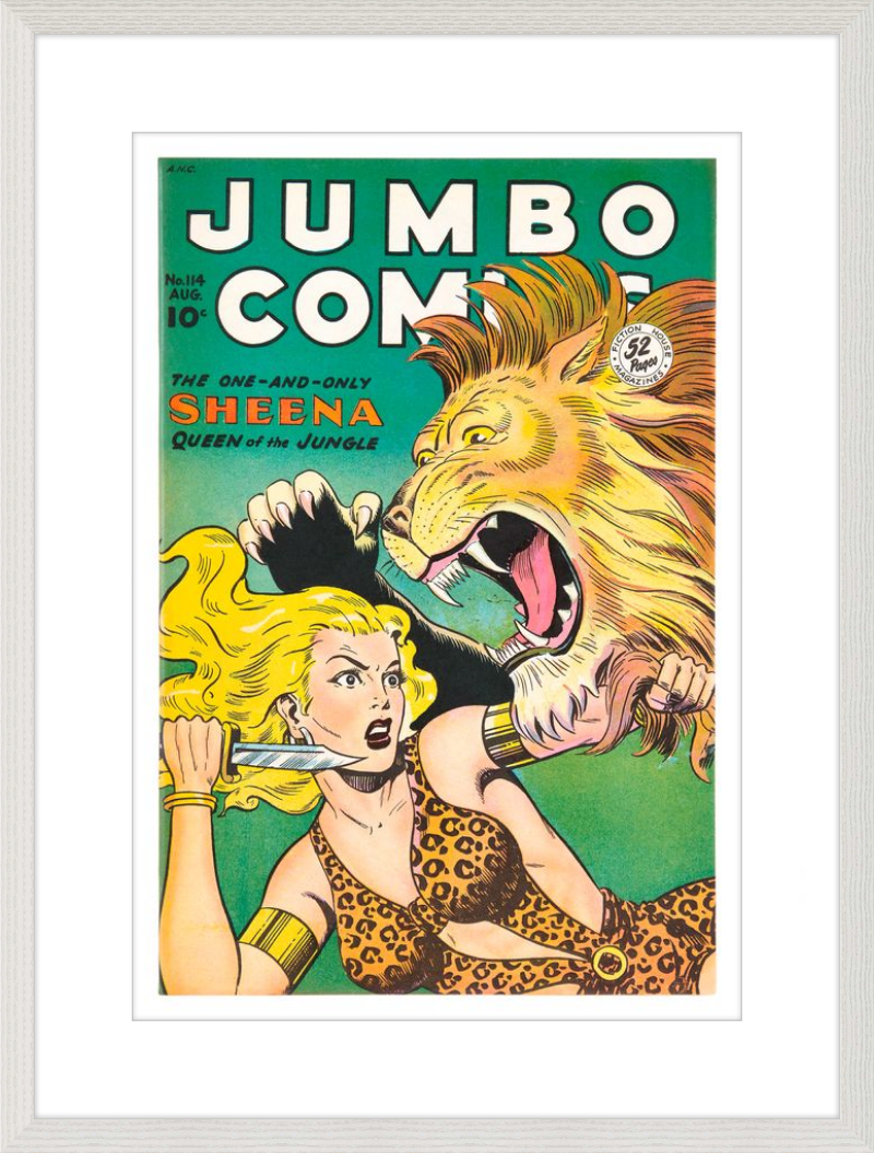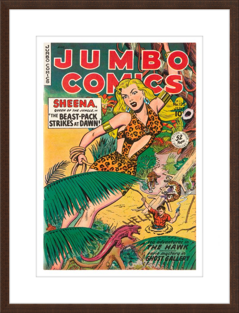 This August 1948 issue of Jumbo Comics showcases Sheena, Queen of the Jungle, in a dramatic encounter with a roaring lion, exemplifying the Golden Age's fascination with adventure and exoticism. Illustrated by Matt Baker, a pioneering African American artist celebrated for his dynamic compositions and expressive linework, the cover captures Sheena’s cultural significance as one of the earliest female action heroes in comics.