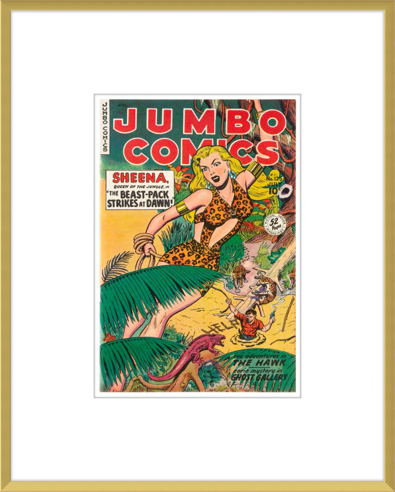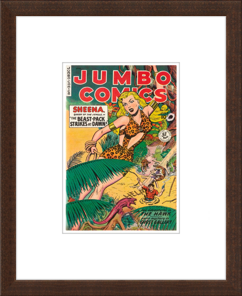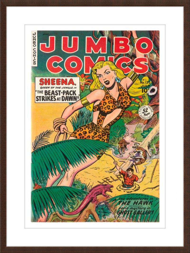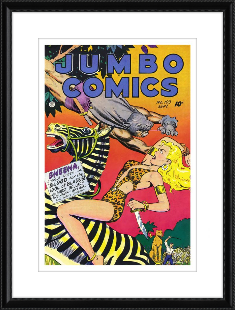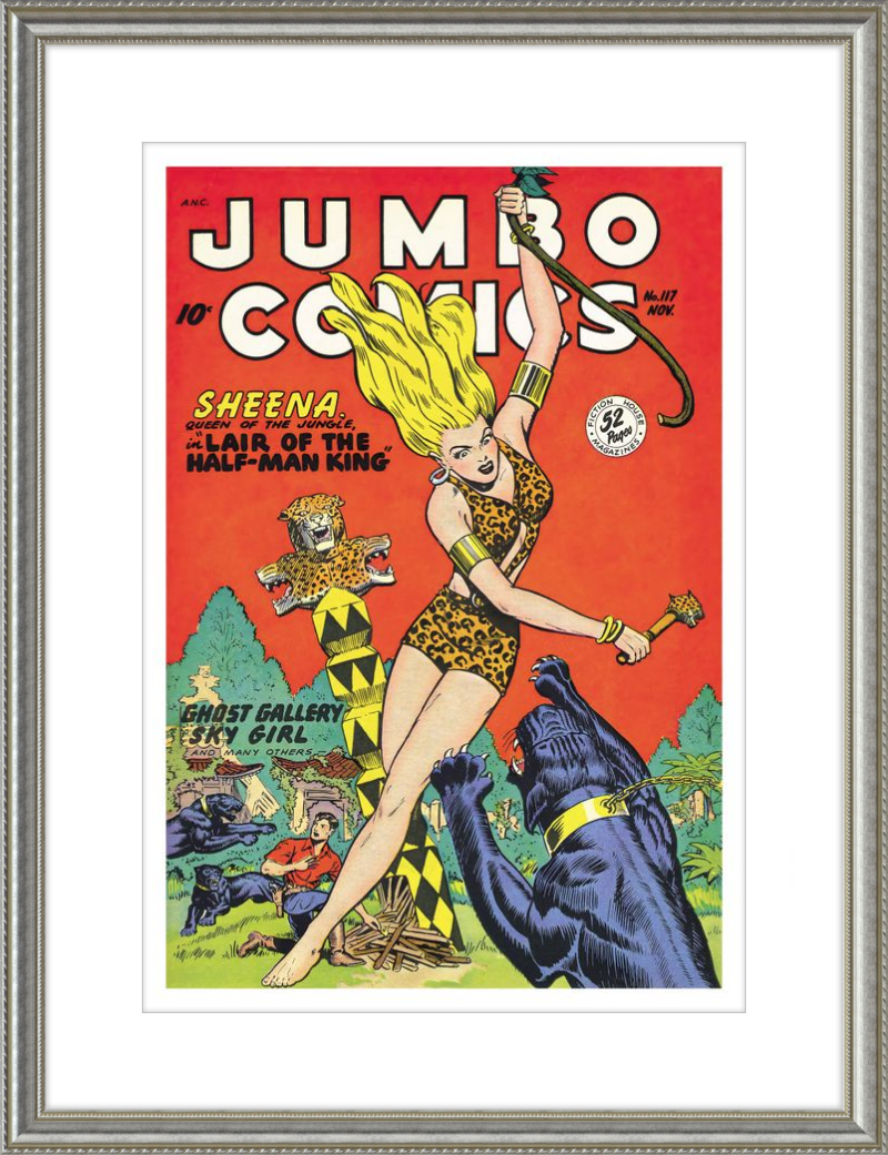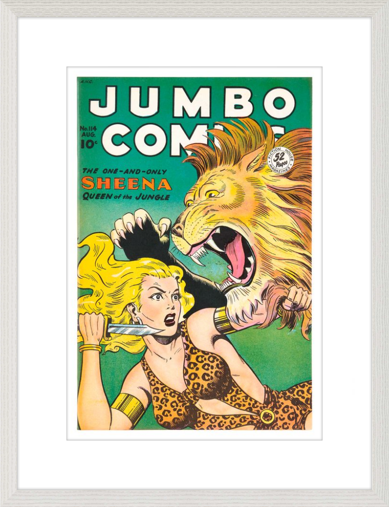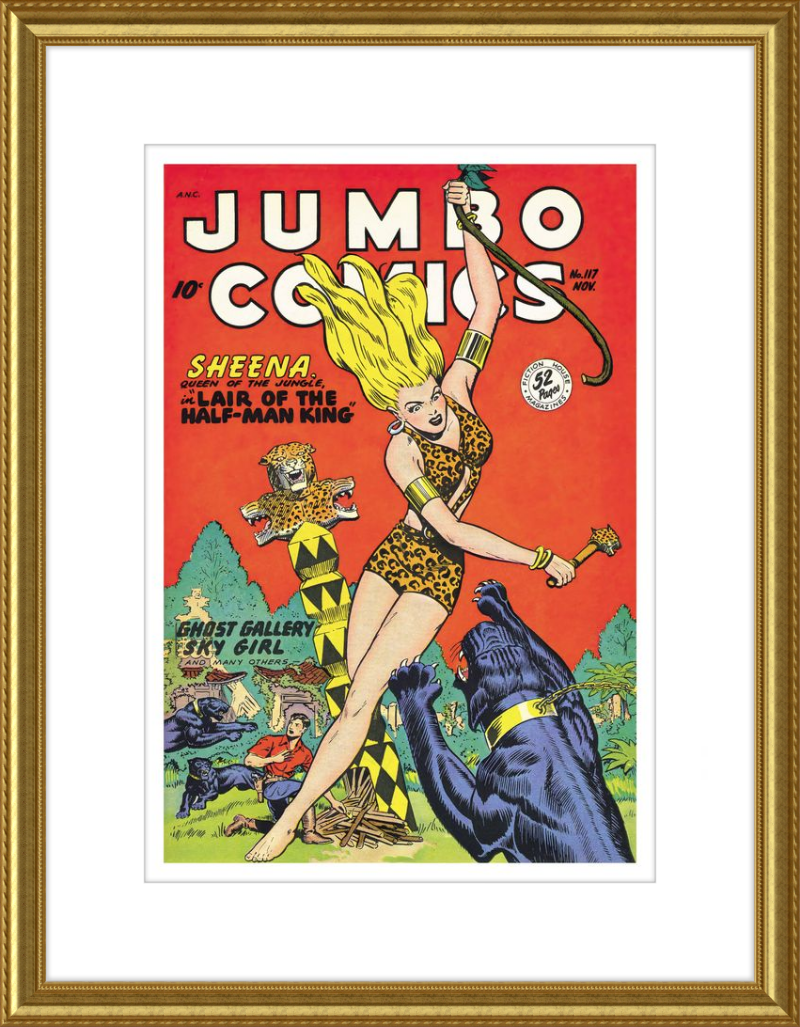 This August 1948 issue of Jumbo Comics showcases Sheena, Queen of the Jungle, in a dramatic encounter with a roaring lion, exemplifying the Golden Age's fascination with adventure and exoticism. Illustrated by Matt Baker, a pioneering African American artist celebrated for his dynamic compositions and expressive linework, the cover captures Sheena’s cultural significance as one of the earliest female action heroes in comics.