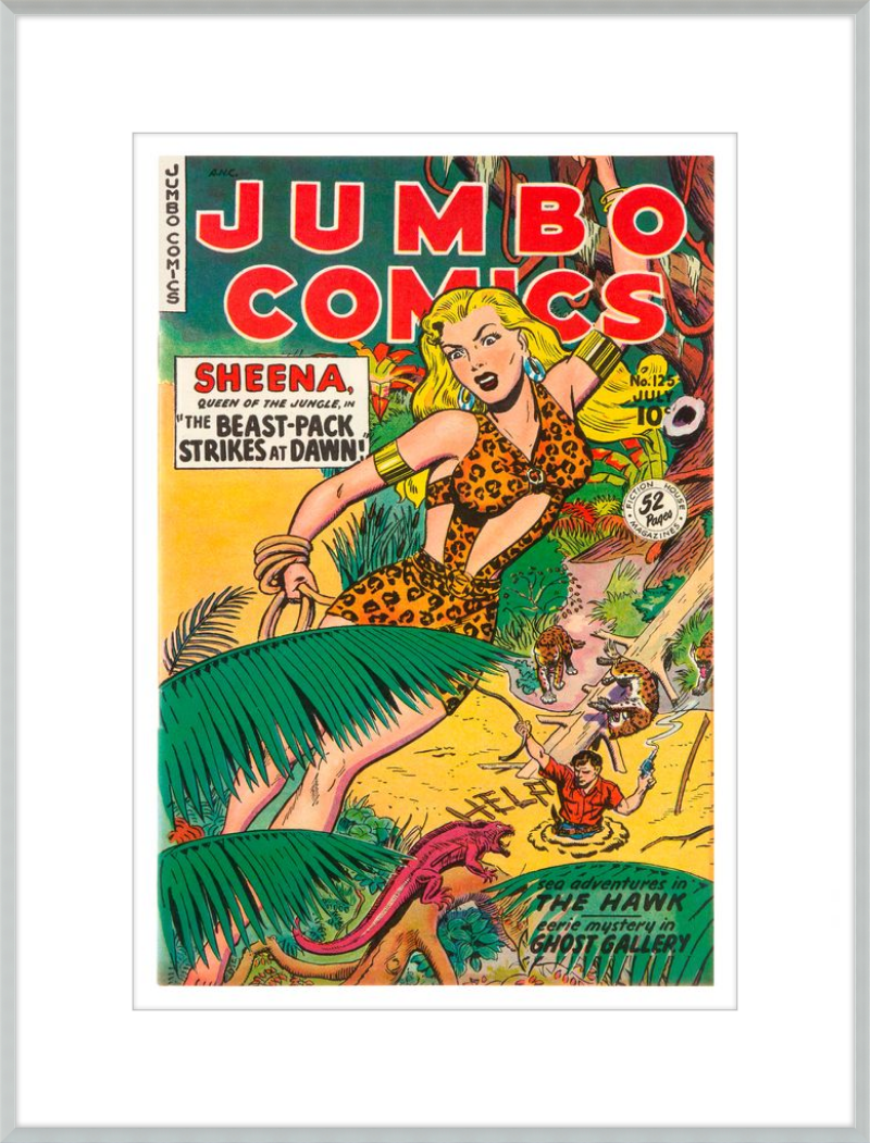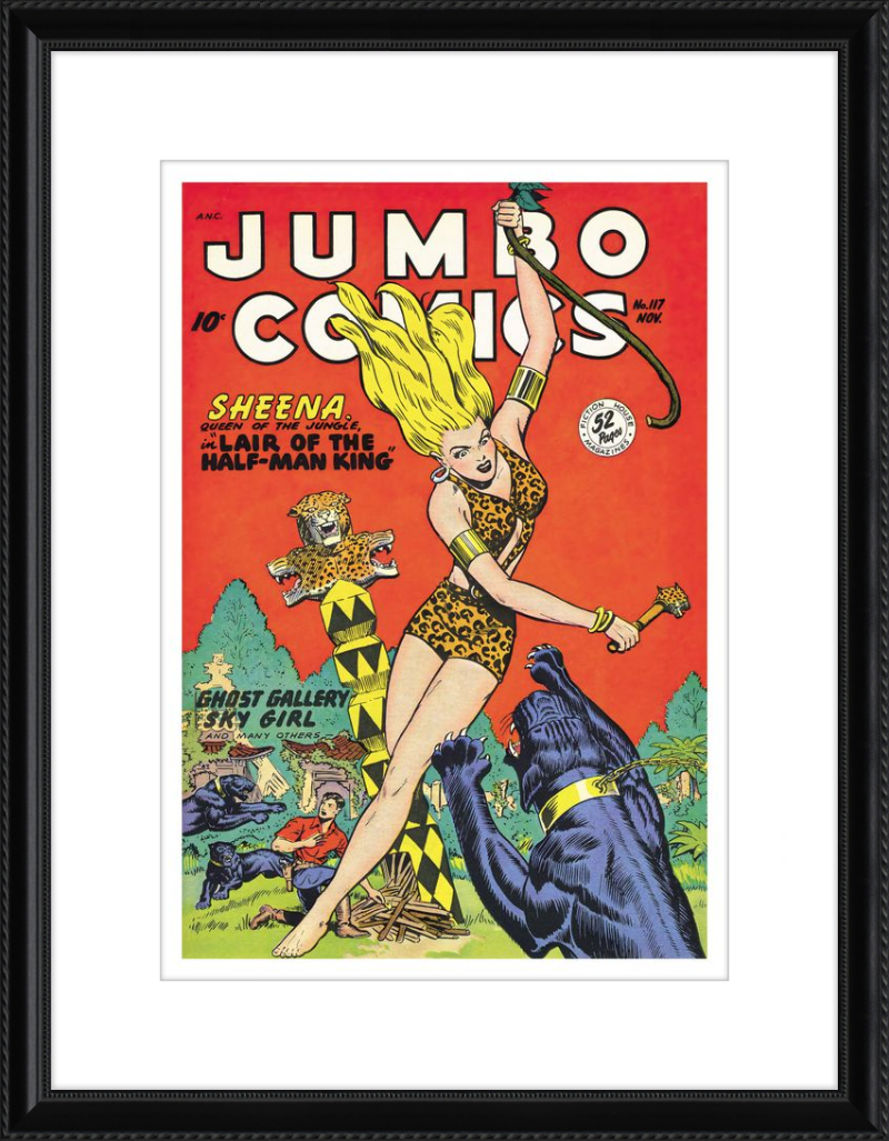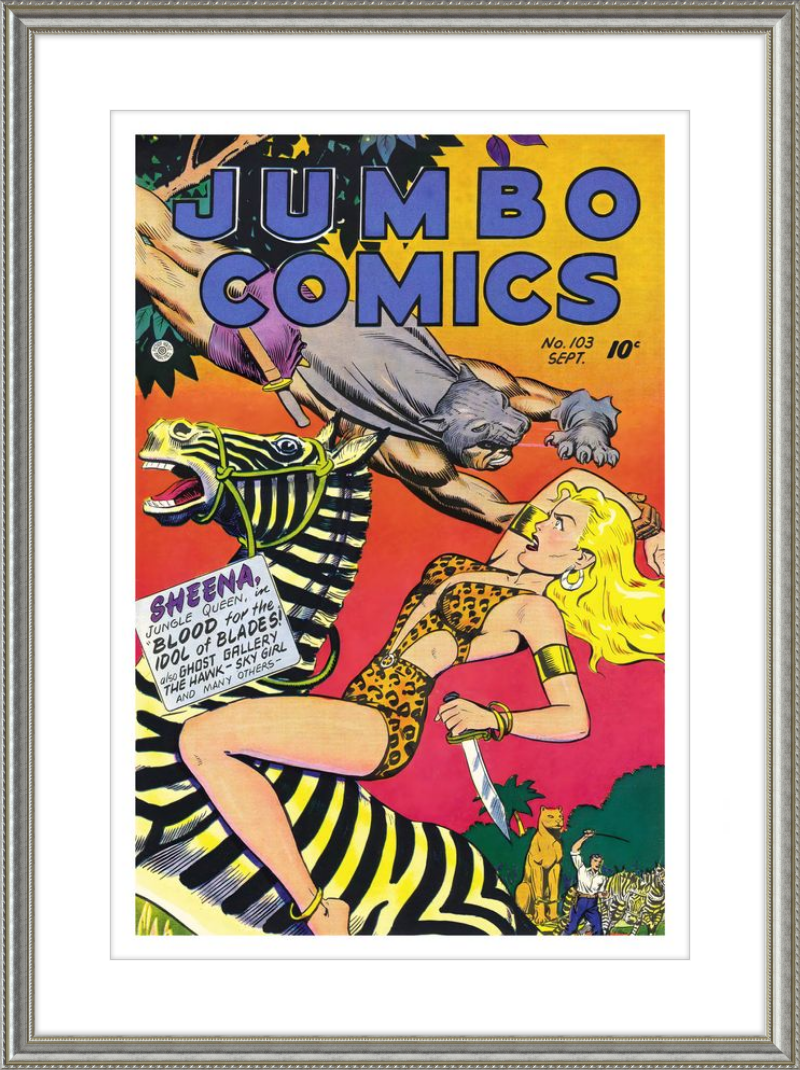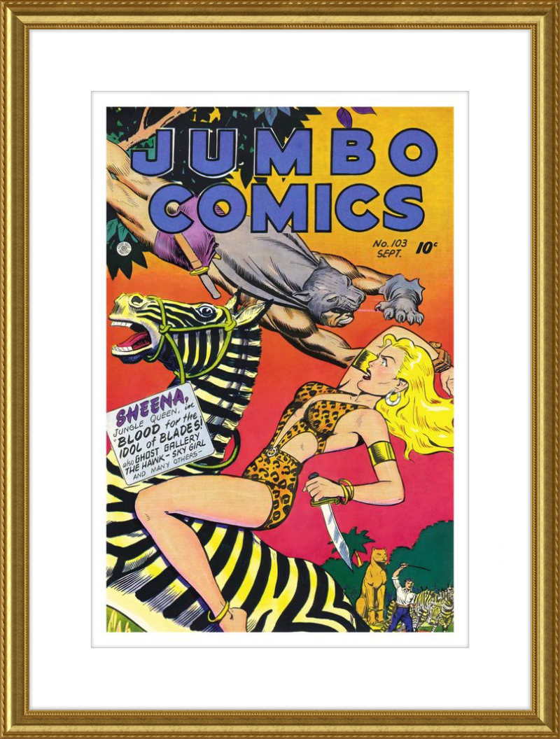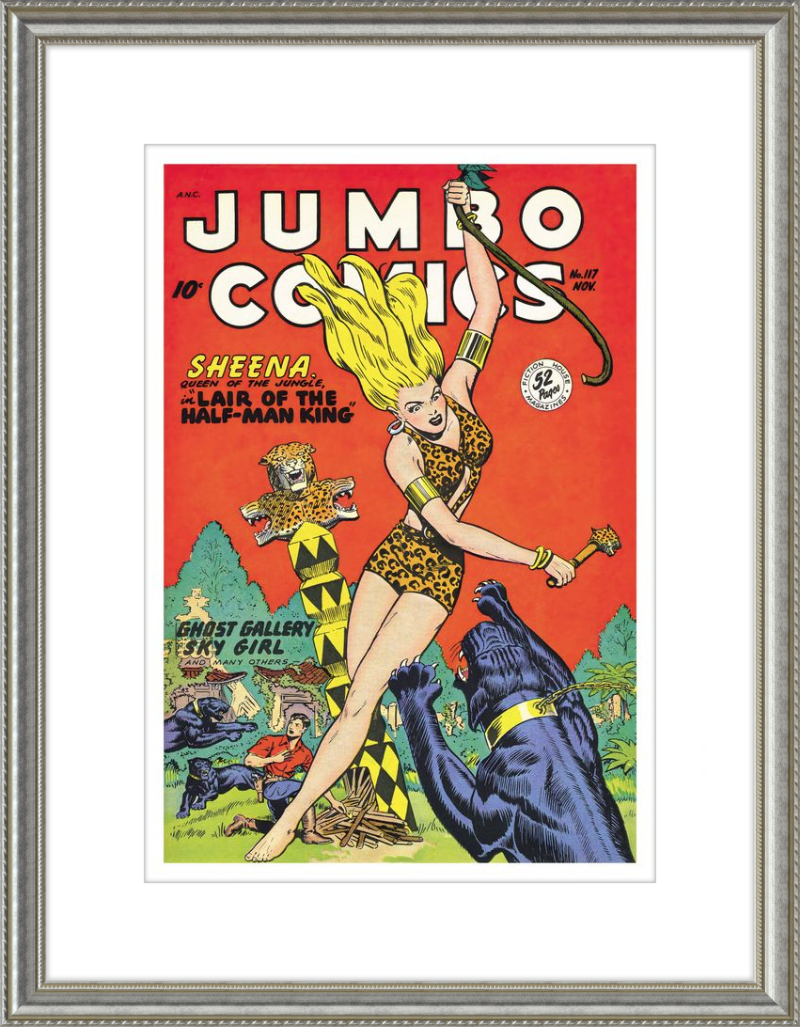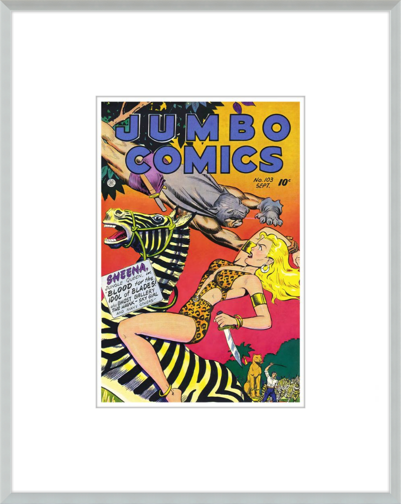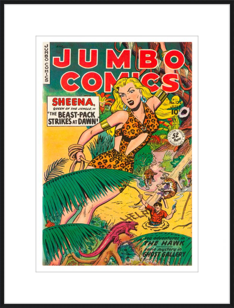 This August 1948 issue of Jumbo Comics showcases Sheena, Queen of the Jungle, in a dramatic encounter with a roaring lion, exemplifying the Golden Age's fascination with adventure and exoticism. Illustrated by Matt Baker, a pioneering African American artist celebrated for his dynamic compositions and expressive linework, the cover captures Sheena’s cultural significance as one of the earliest female action heroes in comics.