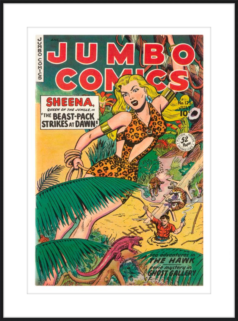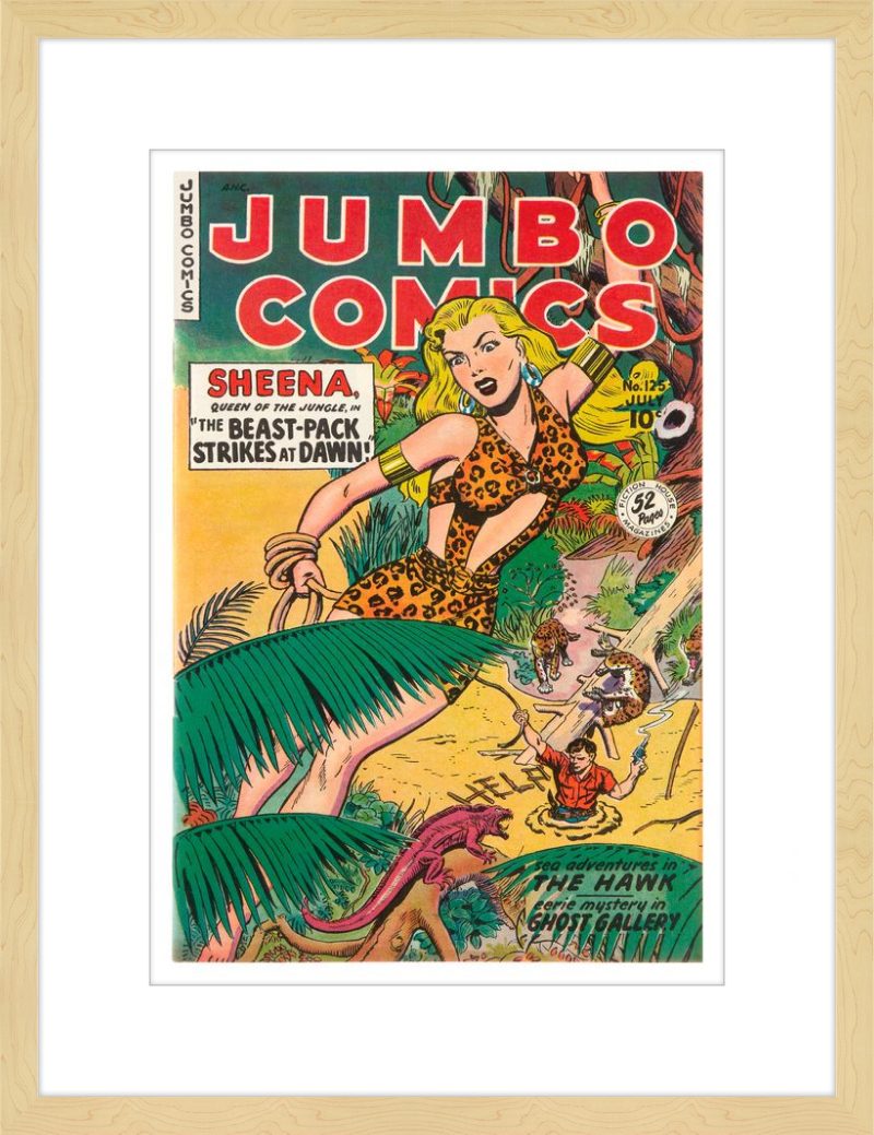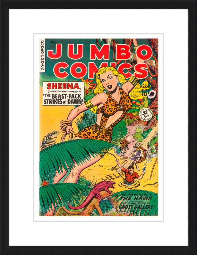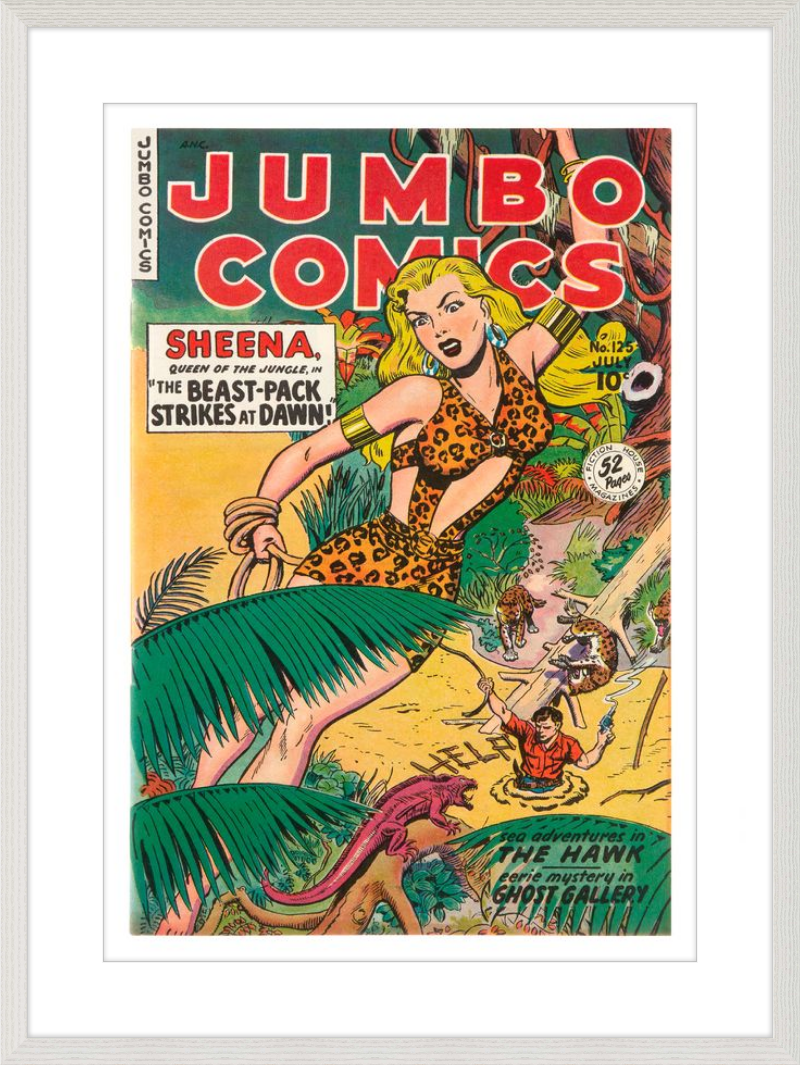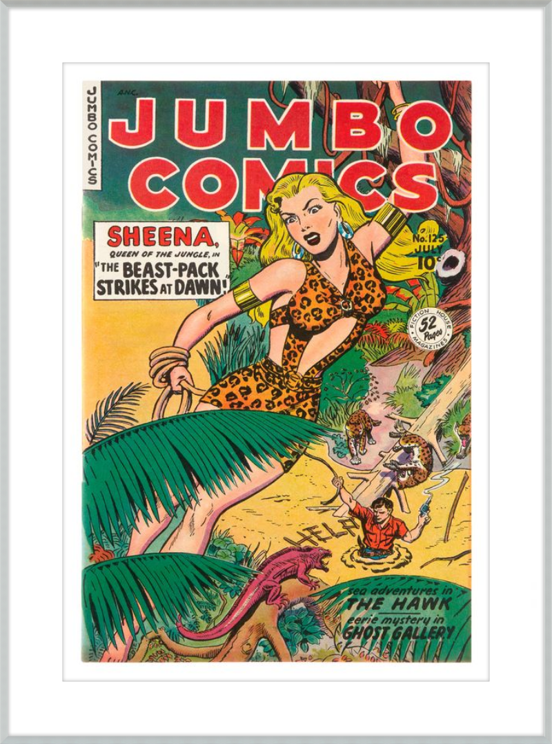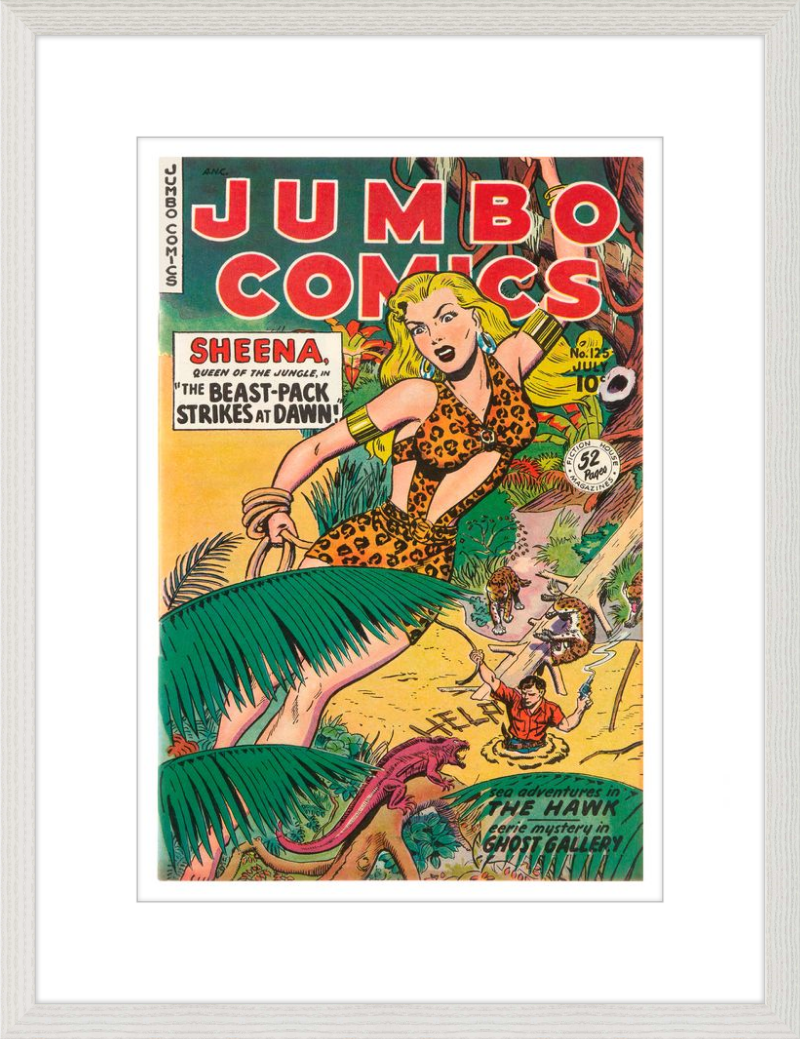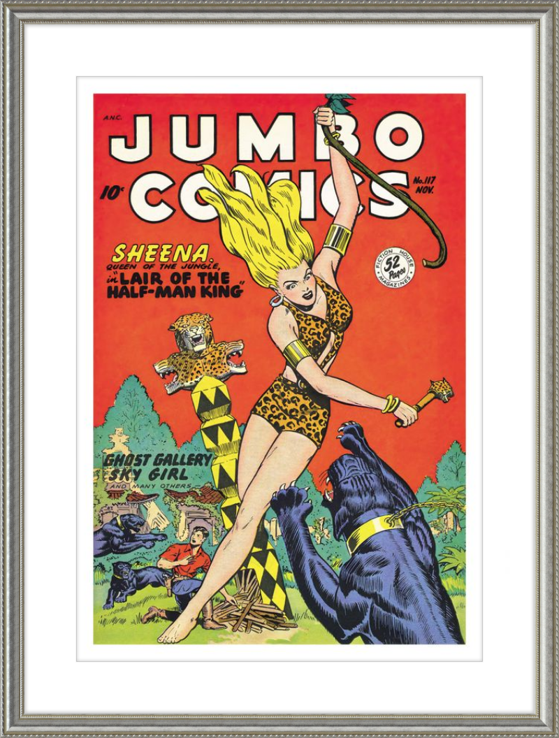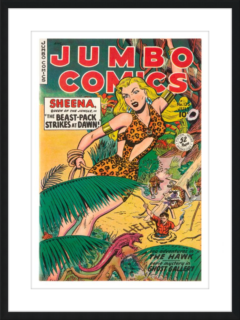 This August 1948 issue of Jumbo Comics showcases Sheena, Queen of the Jungle, in a dramatic encounter with a roaring lion, exemplifying the Golden Age's fascination with adventure and exoticism. Illustrated by Matt Baker, a pioneering African American artist celebrated for his dynamic compositions and expressive linework, the cover captures Sheena’s cultural significance as one of the earliest female action heroes in comics.