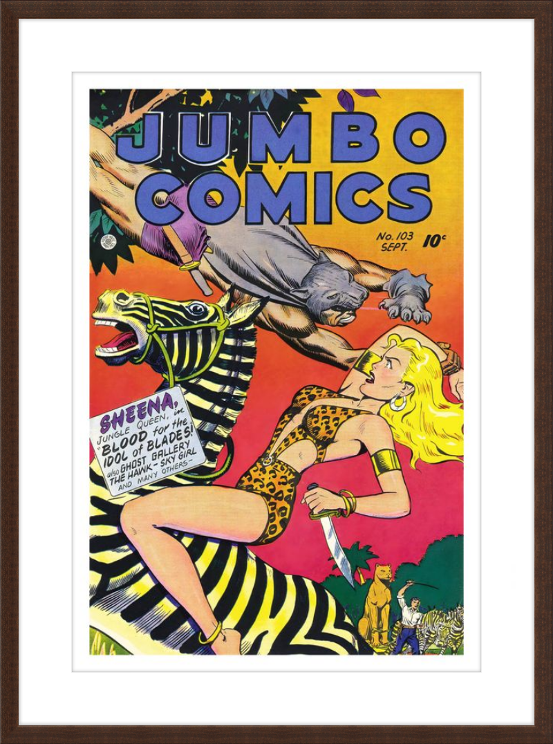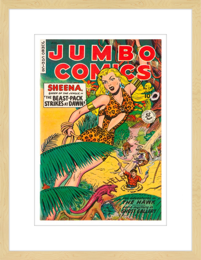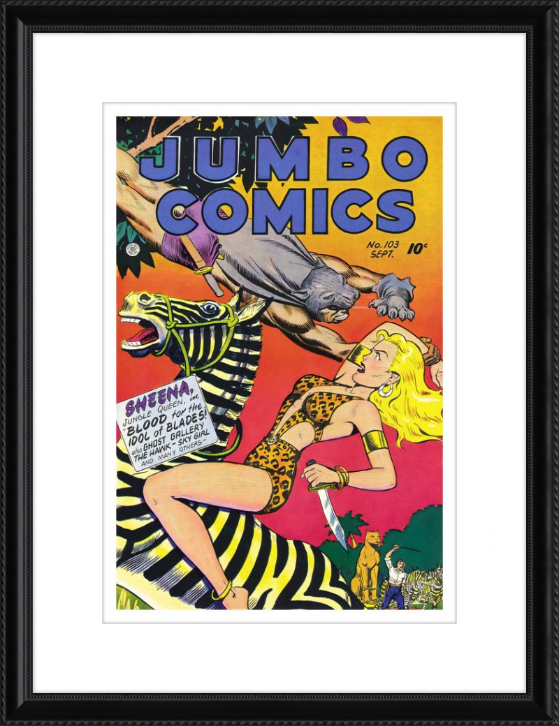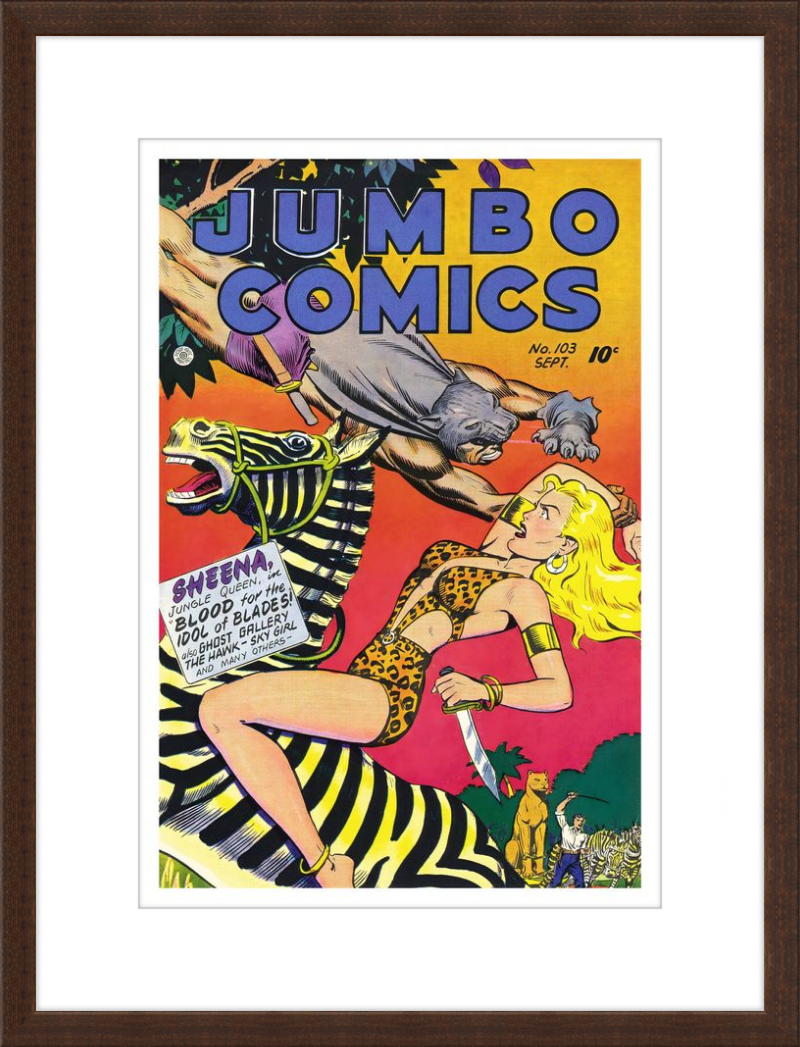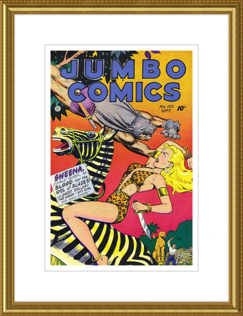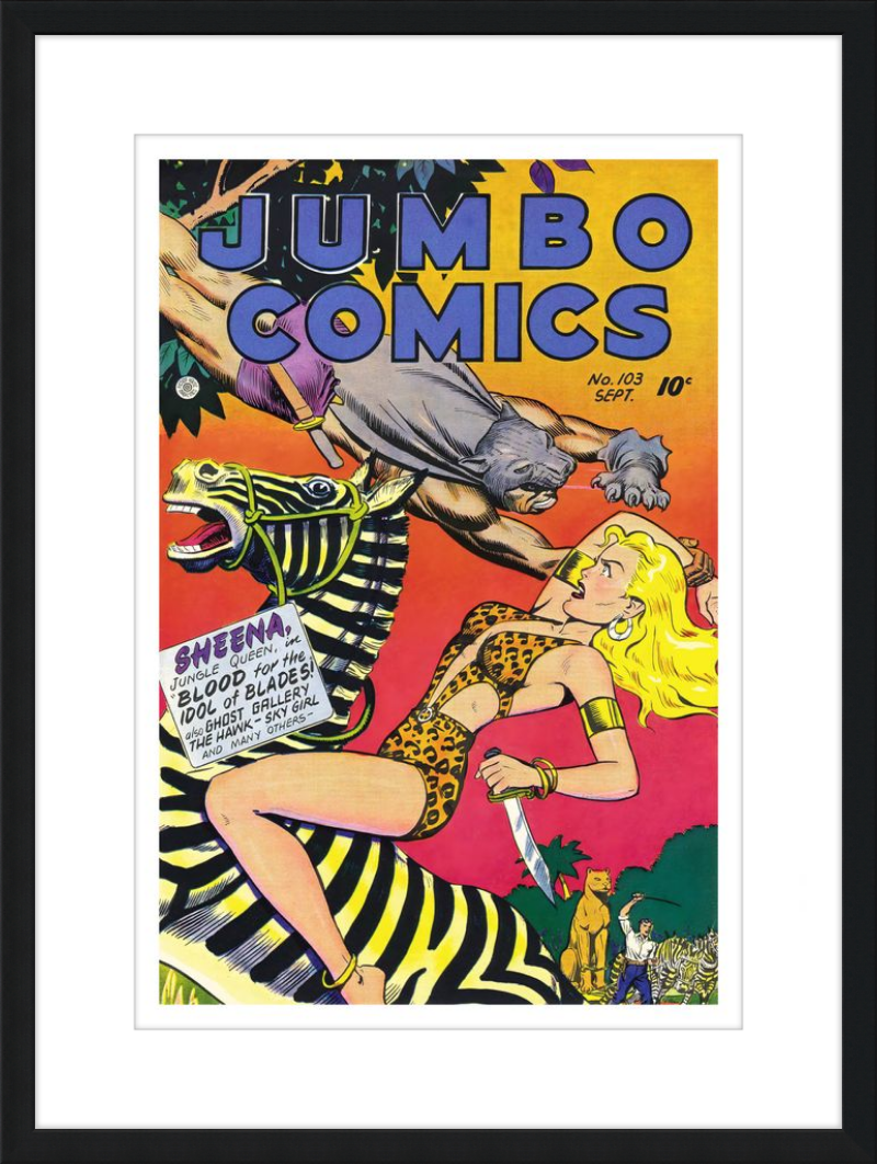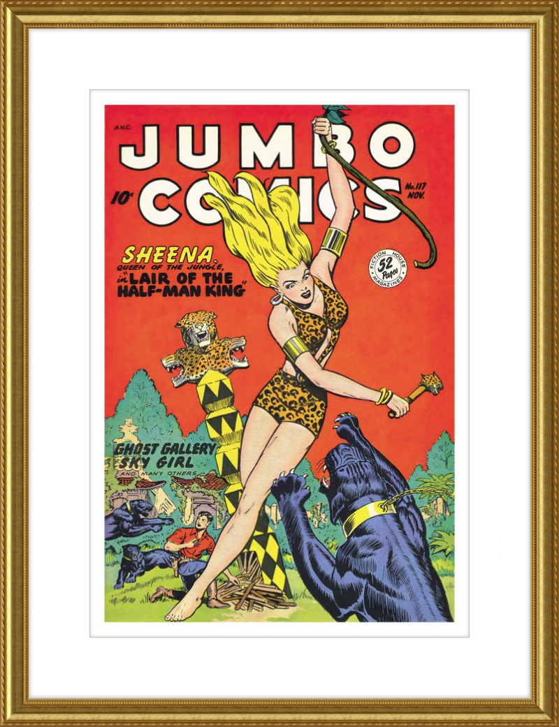 This August 1948 issue of Jumbo Comics showcases Sheena, Queen of the Jungle, in a dramatic encounter with a roaring lion, exemplifying the Golden Age's fascination with adventure and exoticism. Illustrated by Matt Baker, a pioneering African American artist celebrated for his dynamic compositions and expressive linework, the cover captures Sheena’s cultural significance as one of the earliest female action heroes in comics.