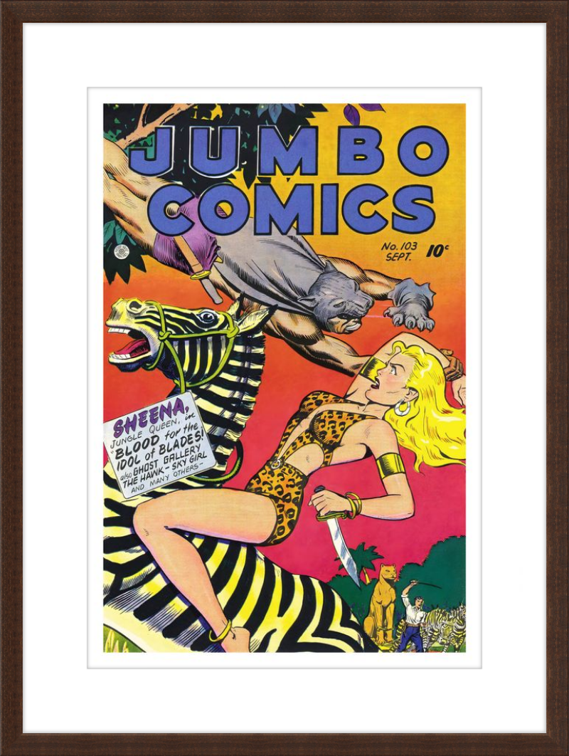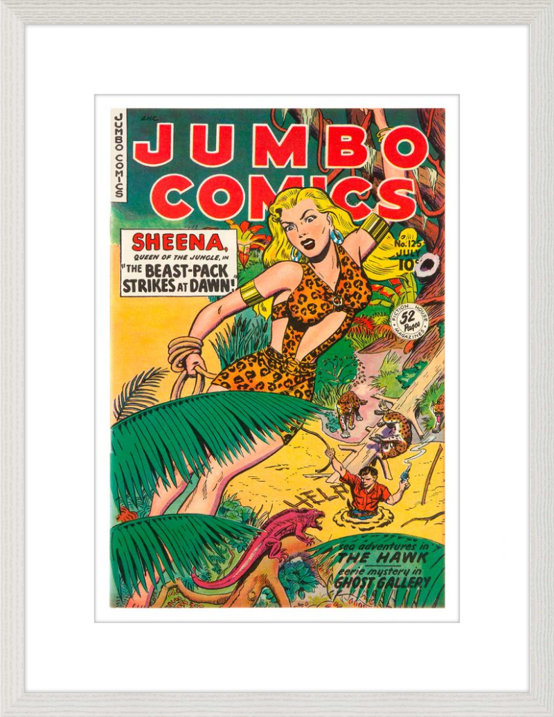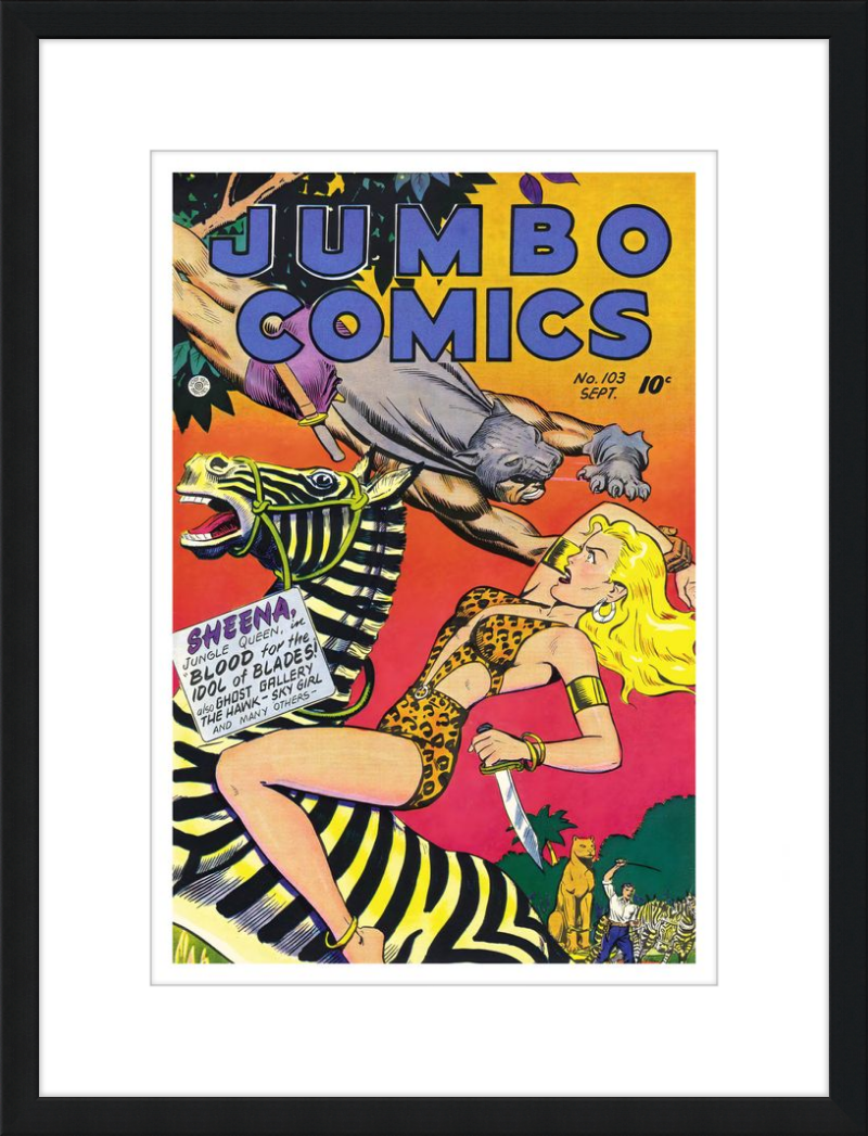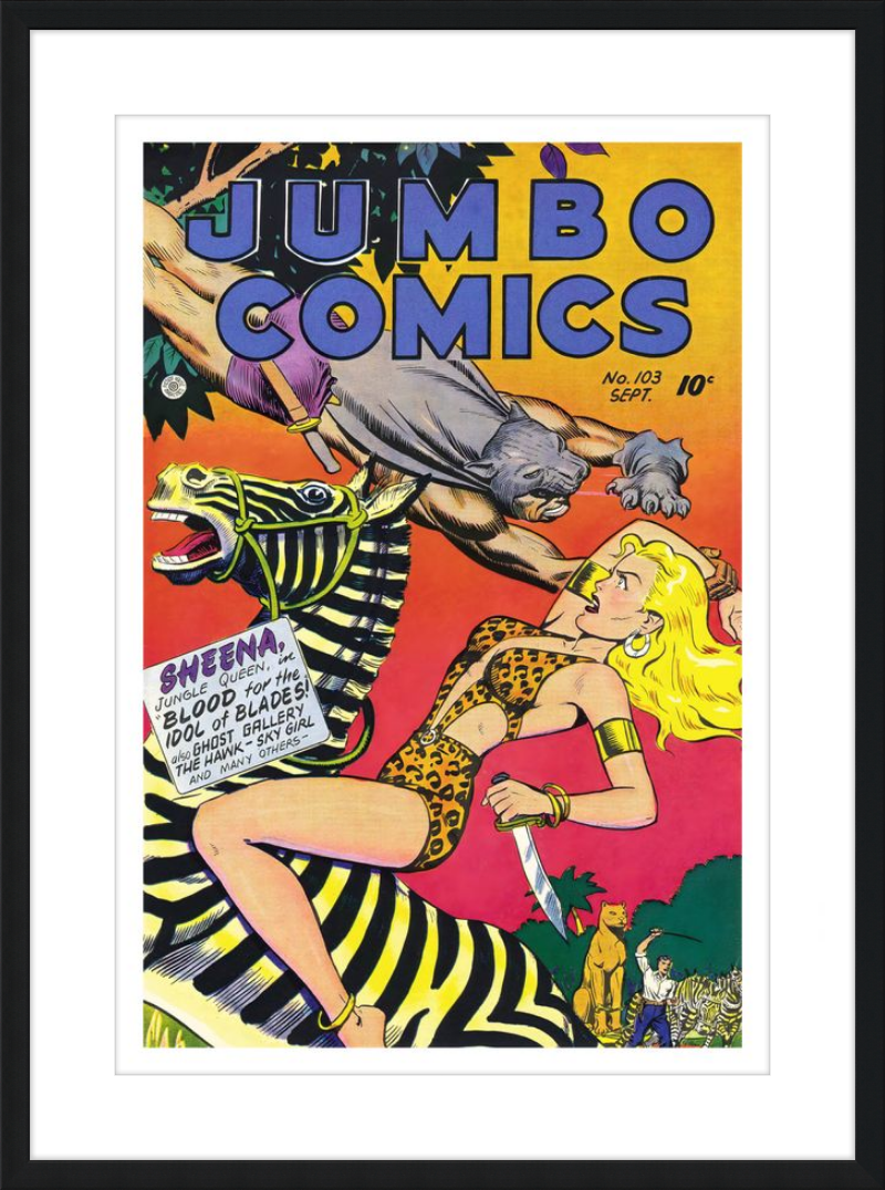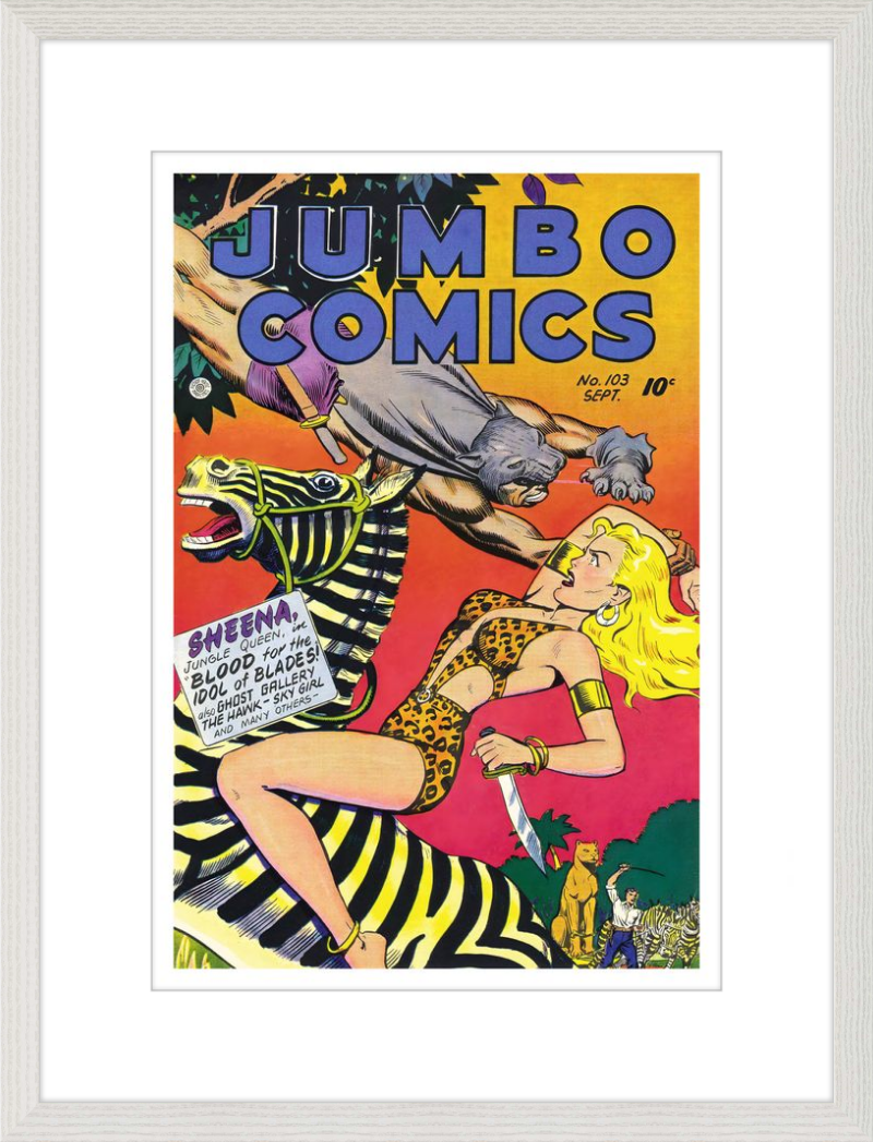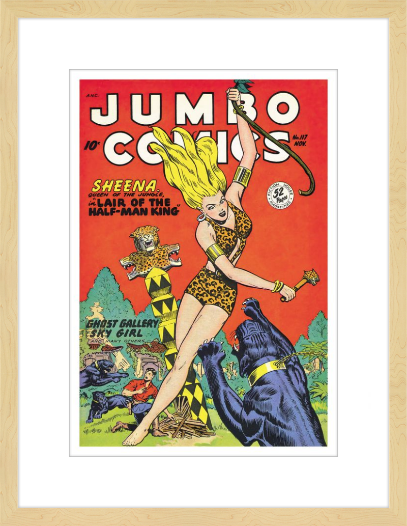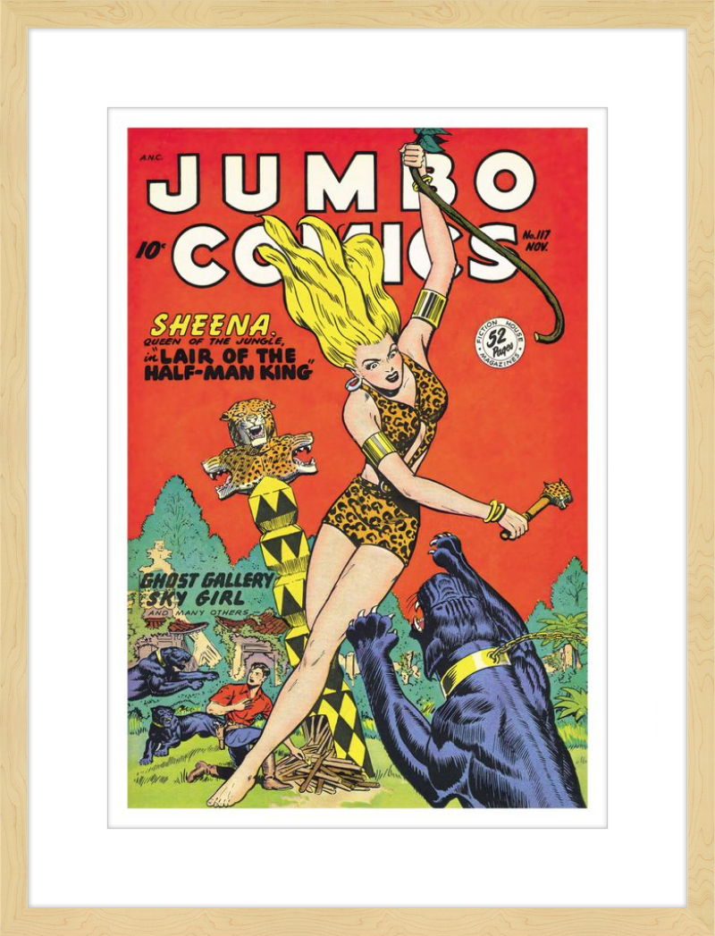 This August 1948 issue of Jumbo Comics showcases Sheena, Queen of the Jungle, in a dramatic encounter with a roaring lion, exemplifying the Golden Age's fascination with adventure and exoticism. Illustrated by Matt Baker, a pioneering African American artist celebrated for his dynamic compositions and expressive linework, the cover captures Sheena’s cultural significance as one of the earliest female action heroes in comics.