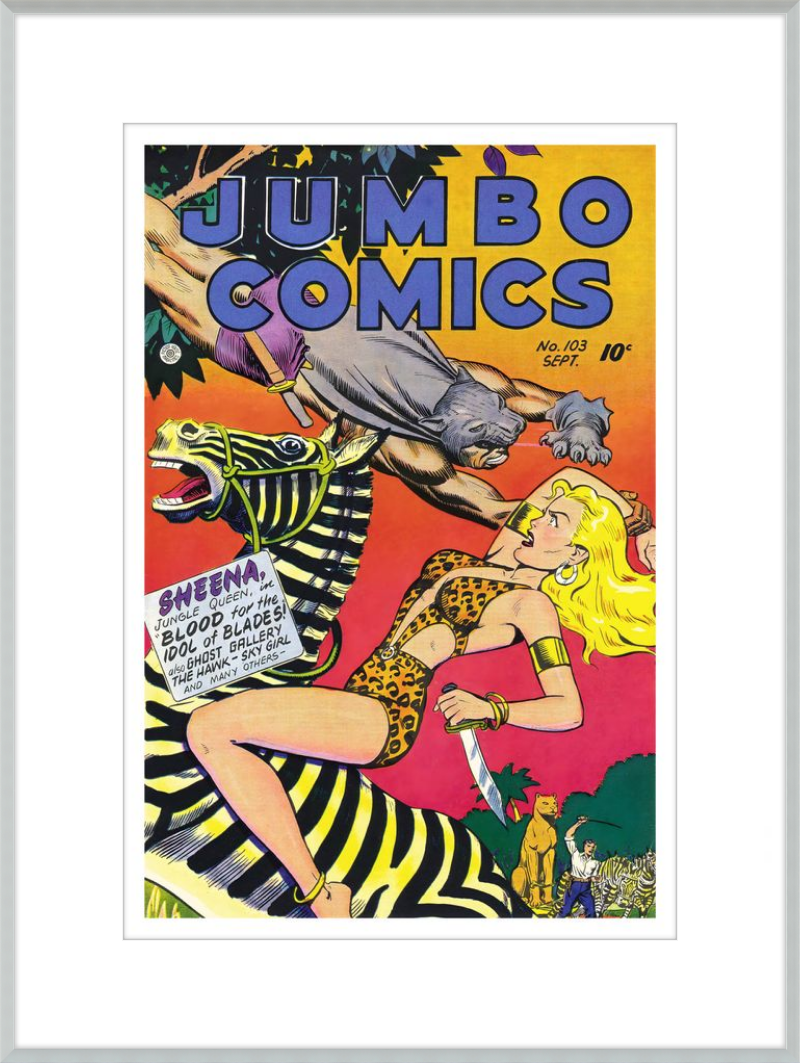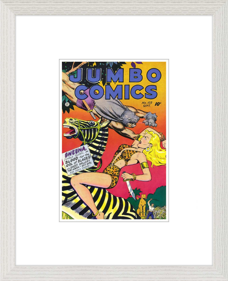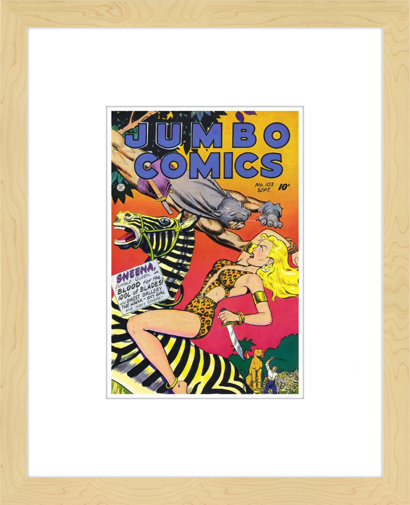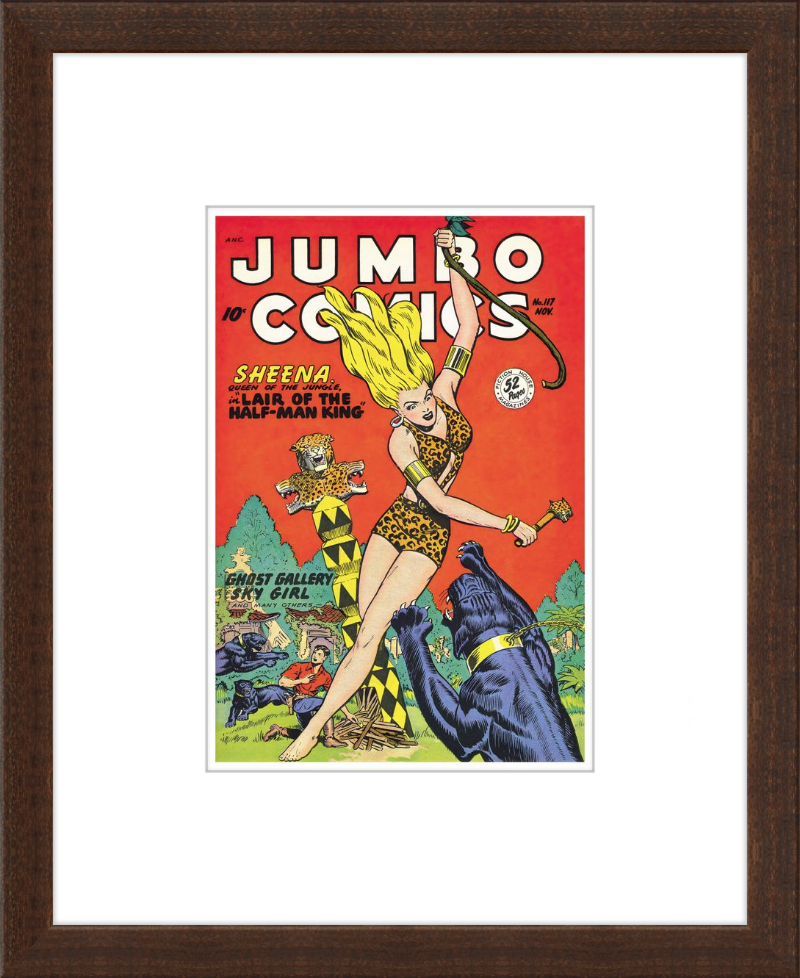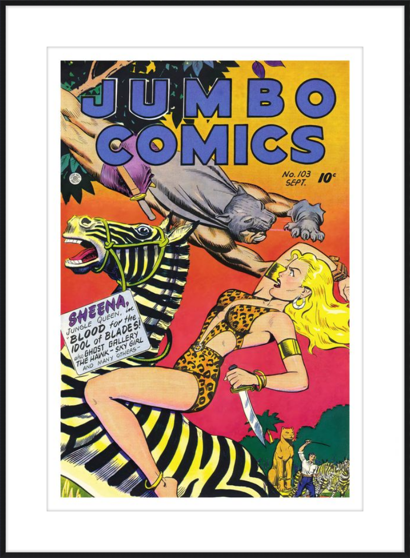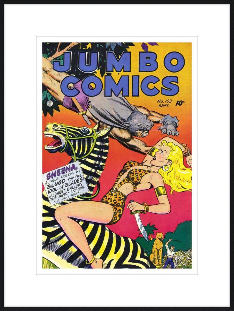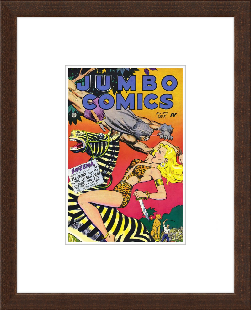 This August 1948 issue of Jumbo Comics showcases Sheena, Queen of the Jungle, in a dramatic encounter with a roaring lion, exemplifying the Golden Age's fascination with adventure and exoticism. Illustrated by Matt Baker, a pioneering African American artist celebrated for his dynamic compositions and expressive linework, the cover captures Sheena’s cultural significance as one of the earliest female action heroes in comics.